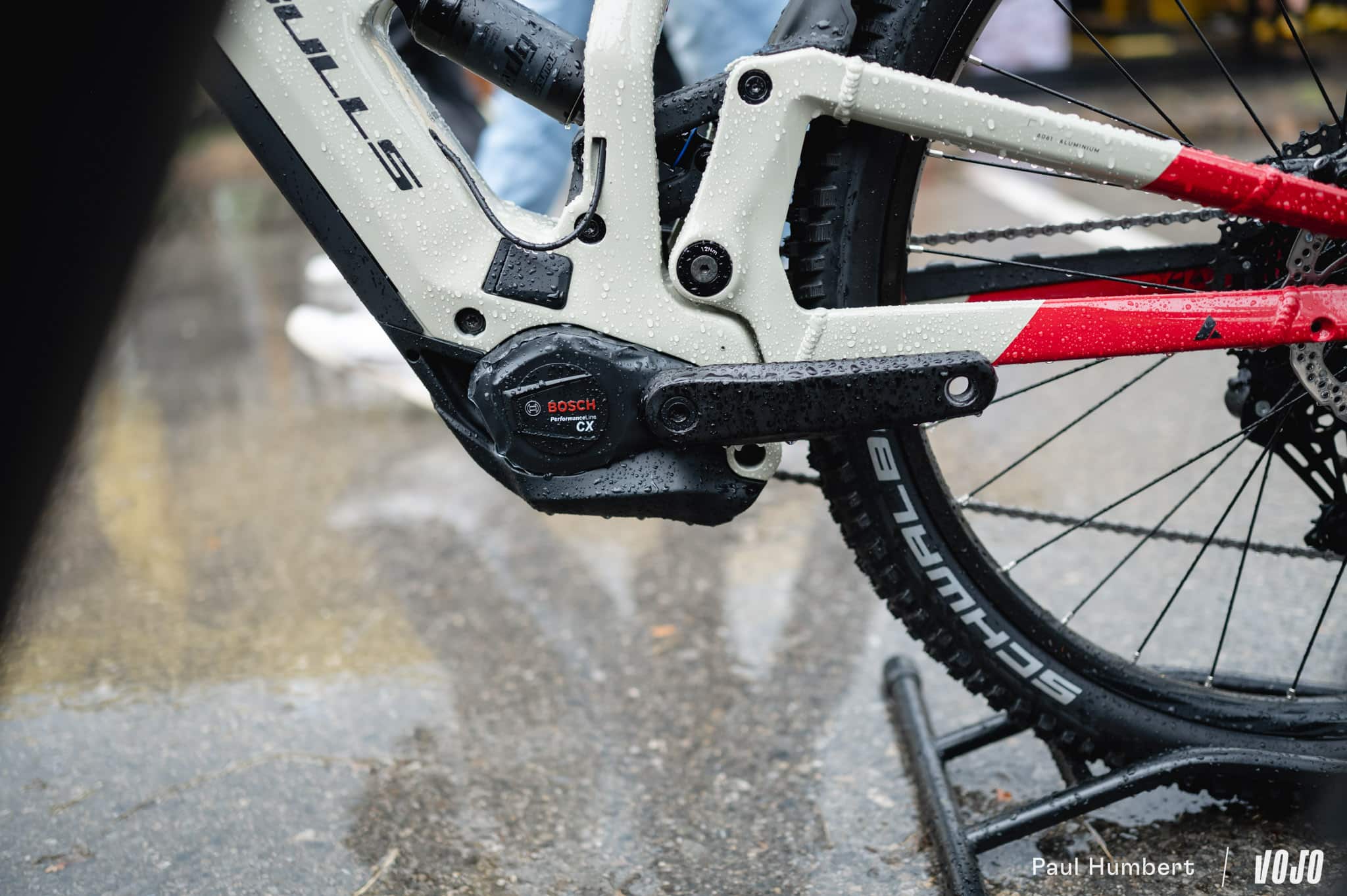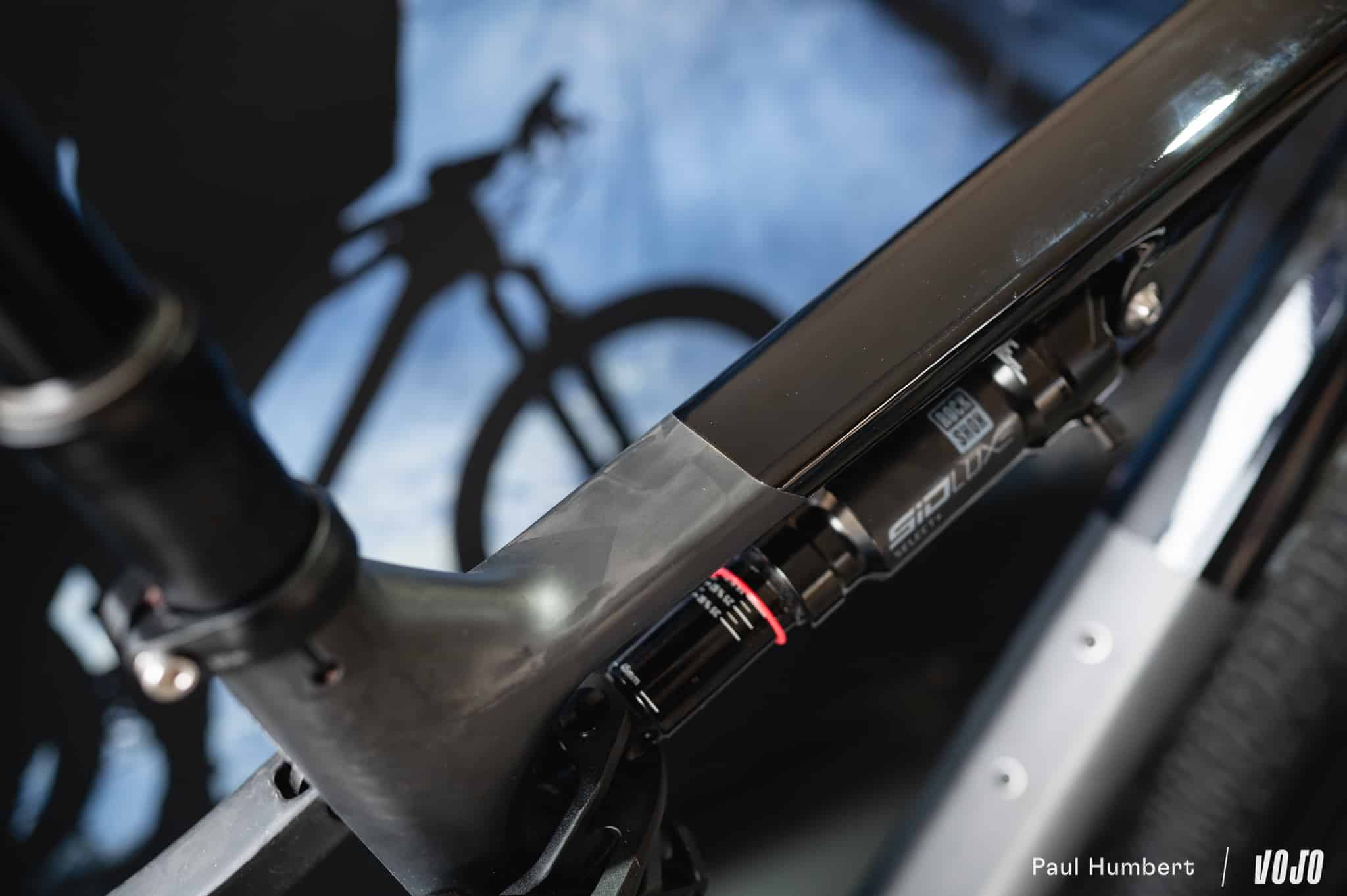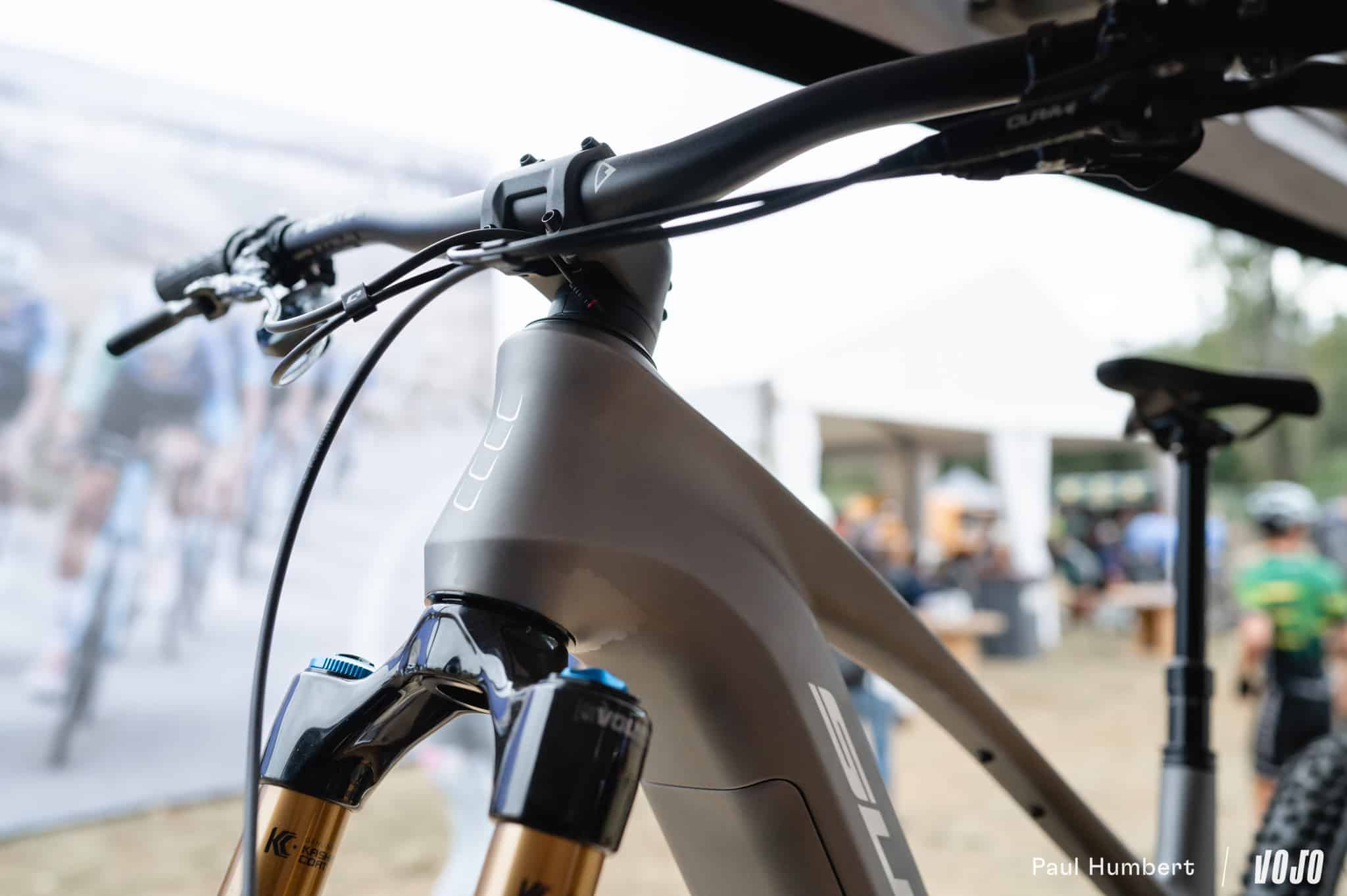 Le vélo est présenté dans un montage « mulet » (avec une roue de 27,5″ à l’arrière mais sera compatible en tout 29 pouces). On retrouve la petite commande Bosch qu’on apprécie et on découvre un gros travail fait sur la cinématique et les formes du cadre.