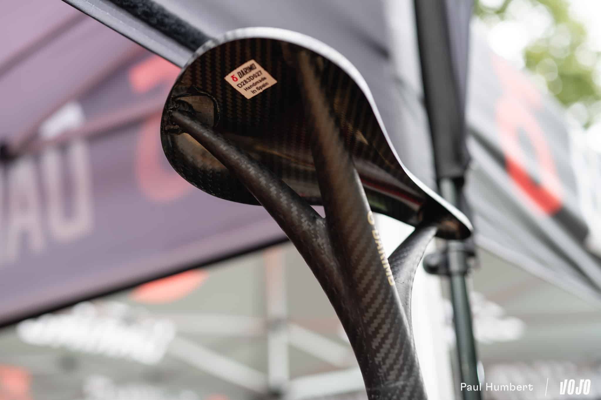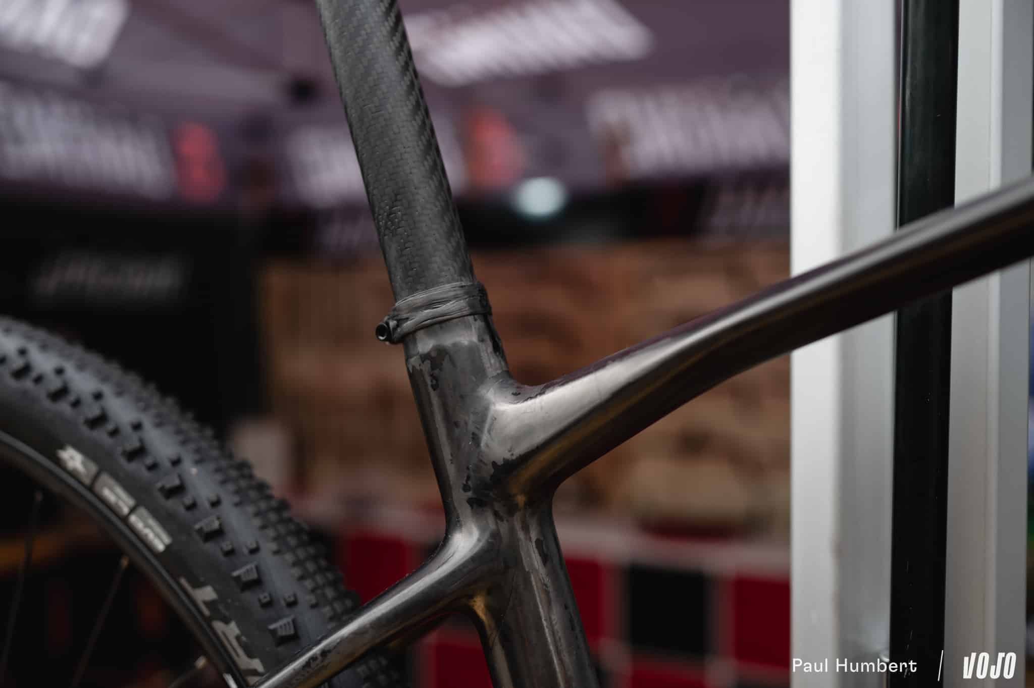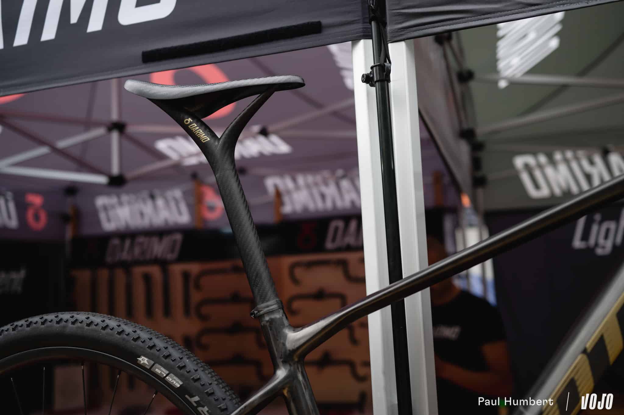 Sur le stand de l’équipementier « ultra light » Darimo est exposé le Scott Scale de Gustav Dangerholm qui nous l’avait présenté (et pesé à 5,86 kg !) lors de l’Eurobike. On s’attarde ici sur le travail de cette tige de selle prototype. On nous annonce qu’une nouvelle version est à l’étude, peut-être pour une future création ?