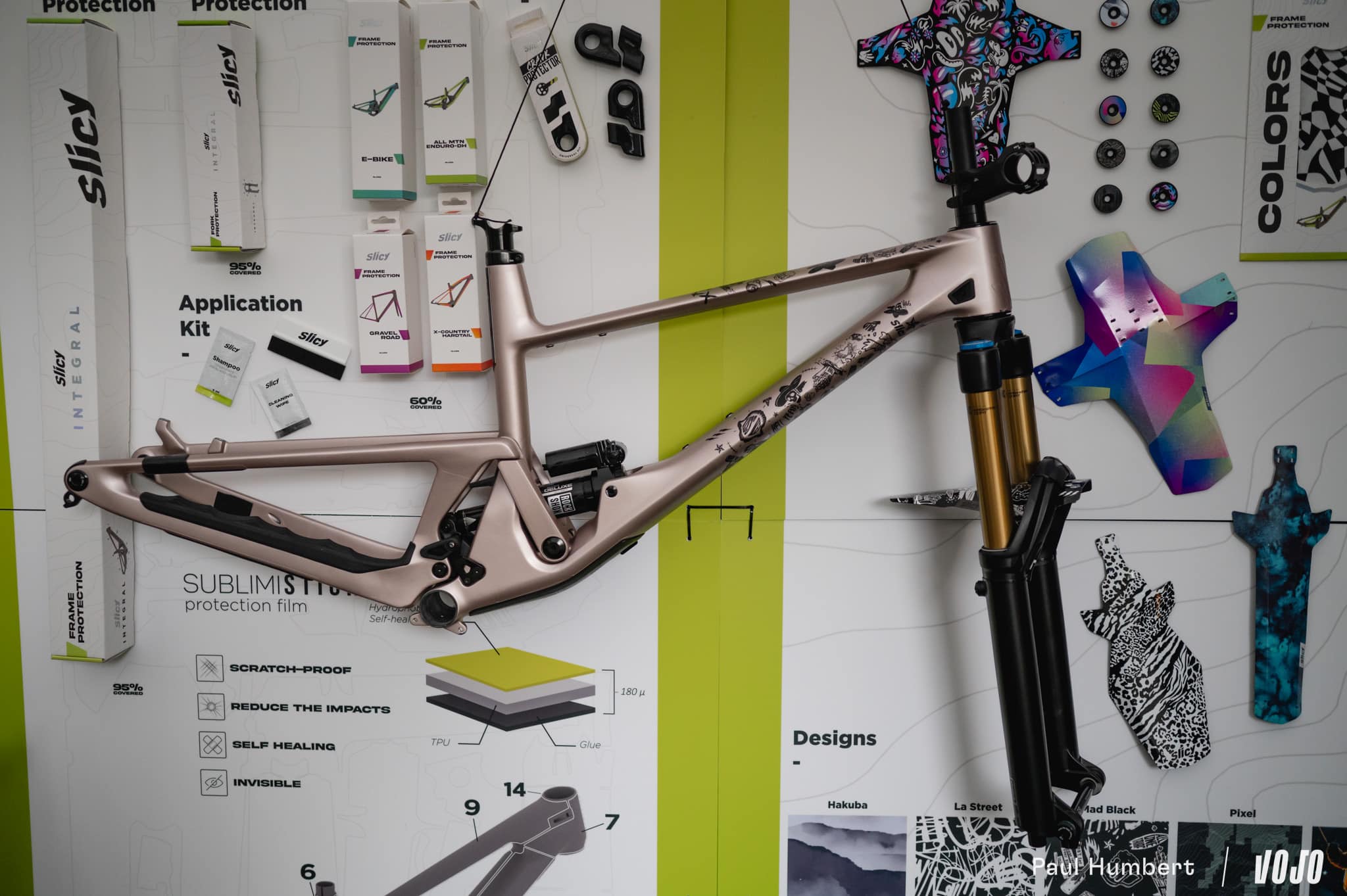 Ils sont tous les deux spécialistes de la protection des cadres avec des kits transparents sur mesure pour les vélos (réalisés à l’aide de scanners). Les premiers sont français, les autres canadiens, et on les retrouvait dans la même allée avec leur catalogue de kits de protections VTTAE, VTT et gravel. En 2021, nous posions un kit Slicy Sublimistick intégral sur un Orbea Occam.