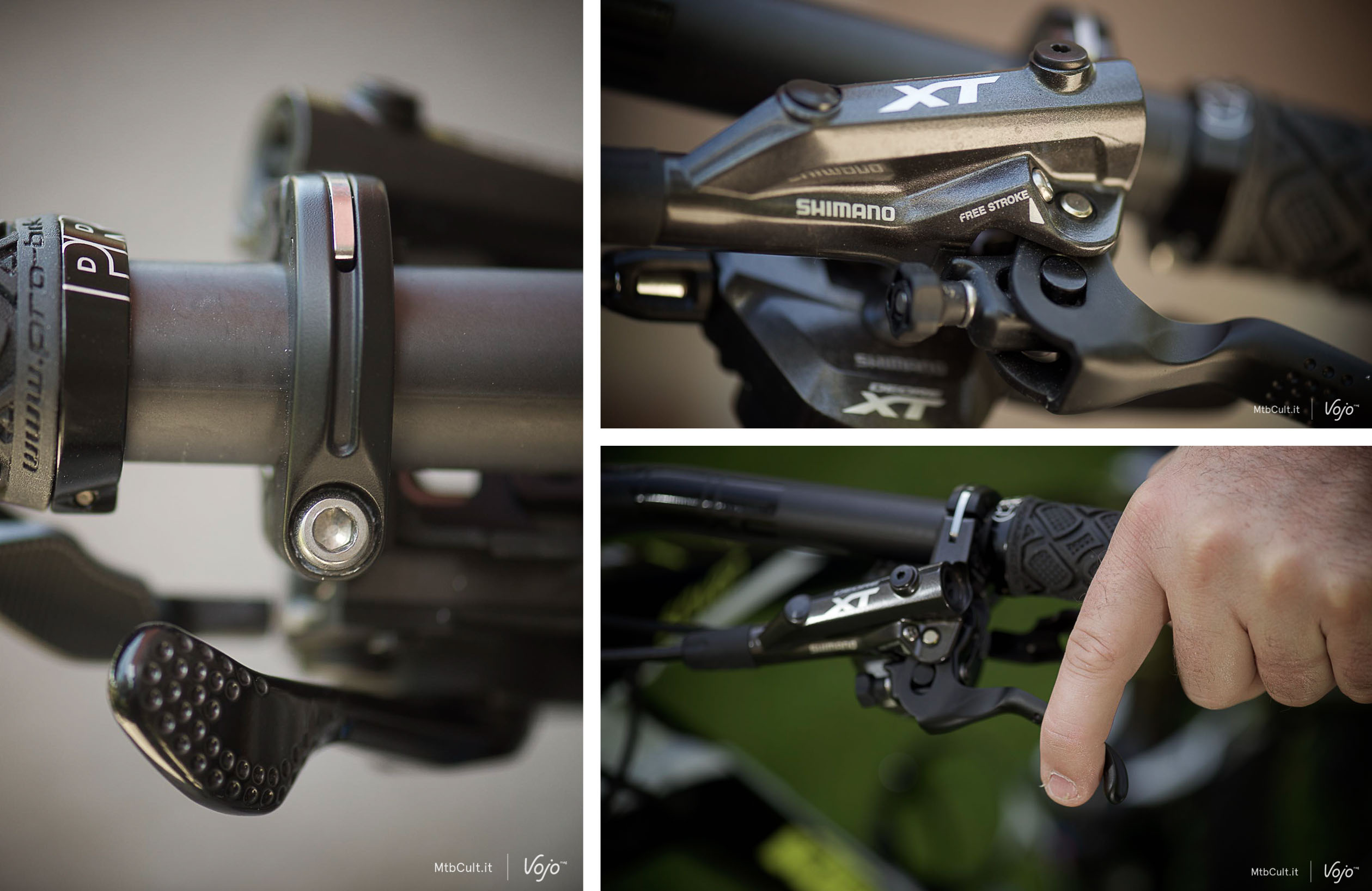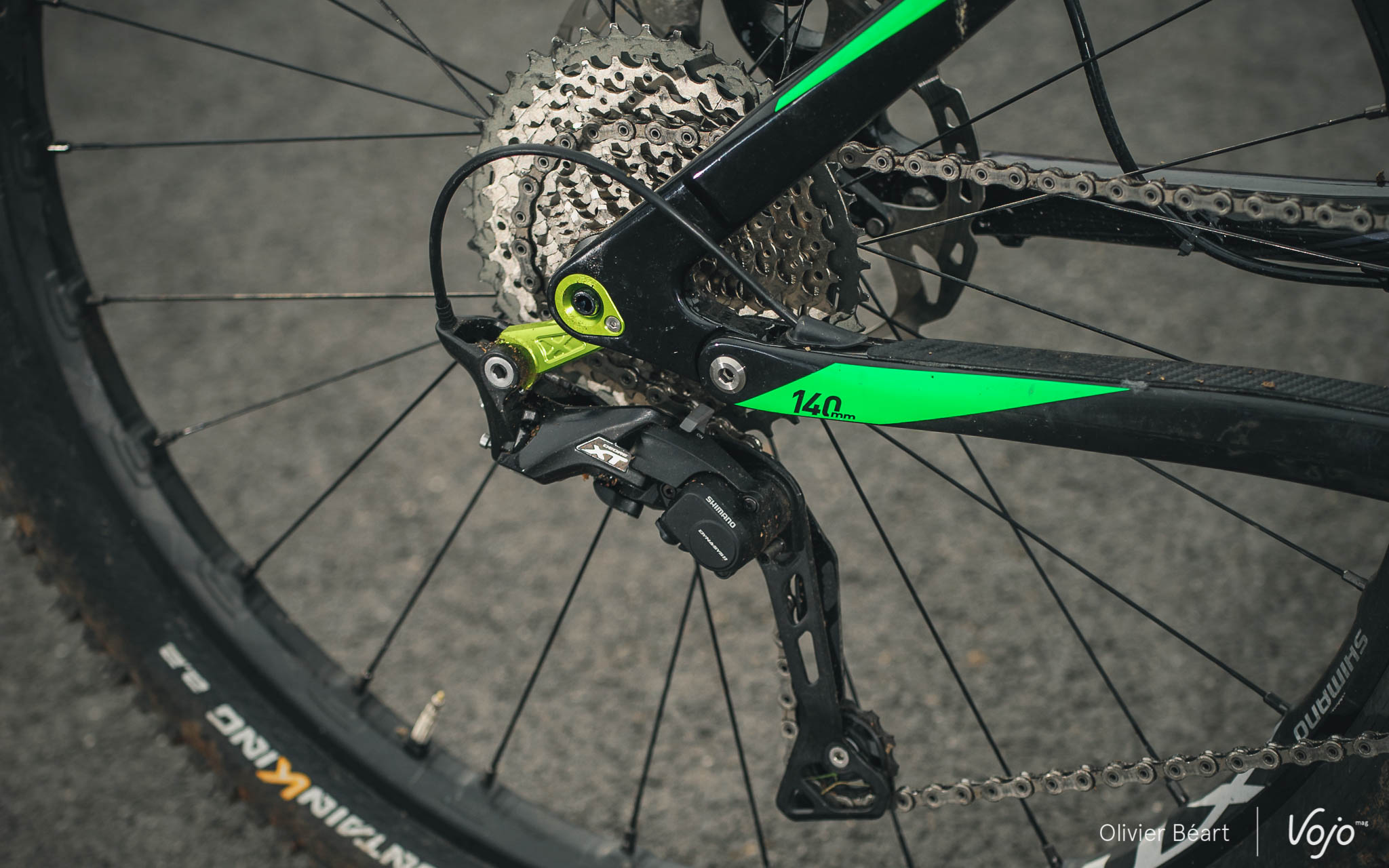 Par contre, la commande de montée des rapports, qui s’actionne avec le pouce, se montre encore plus souple et facile à manipuler qu’auparavant. Plus longue et faite en matériau composite, elle se déplace avec une grande légèreté… comme sur le nouveau XTR M9000. On ne sent d’ailleurs plus du tout la présence du dérailleur Shadow + avec son ressort permettant de garder la chaîne en tension et de limiter les saut de chaîne.