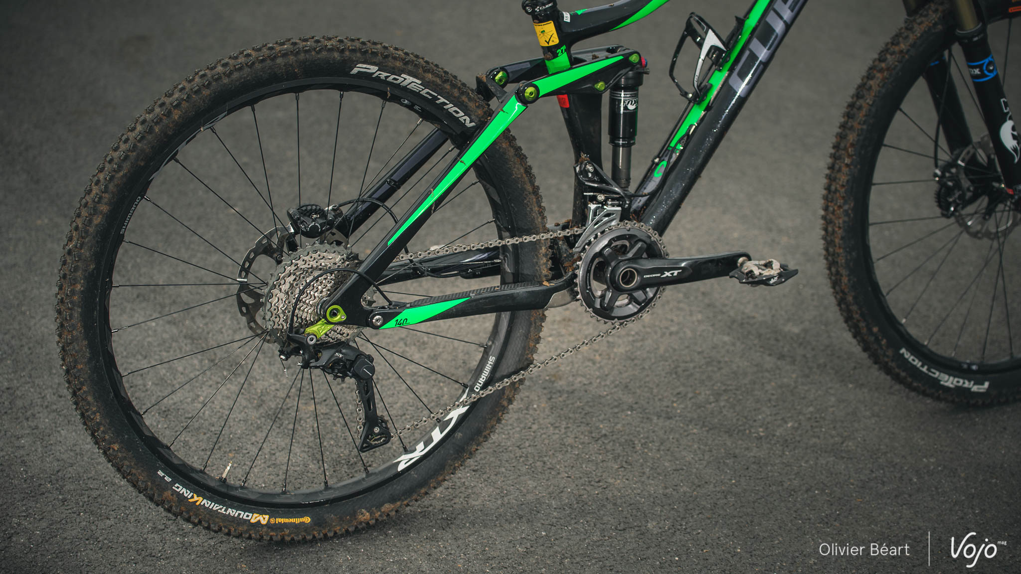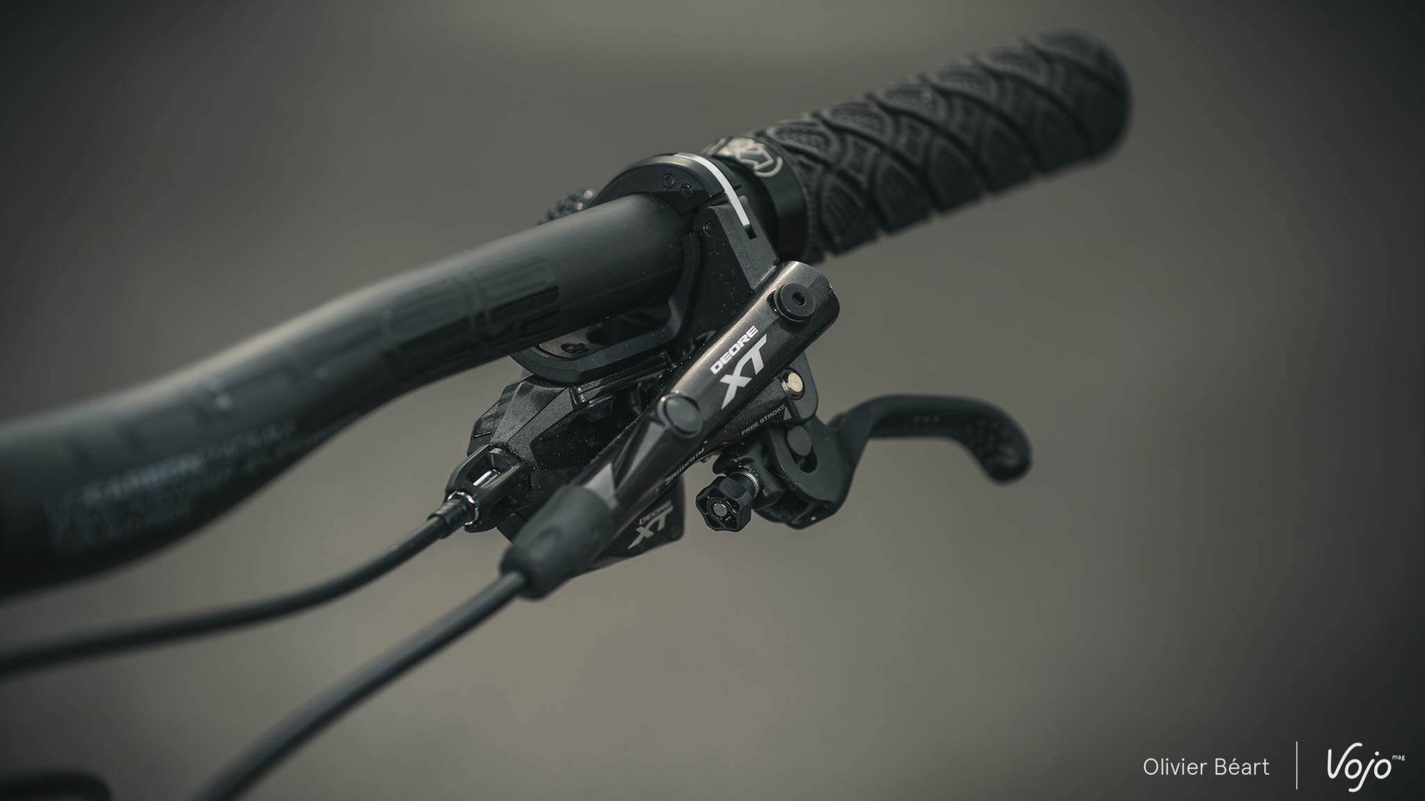 Au niveau des spécifications, notre full suspendu était équipé d’un pédalier 26/36, du nouveau dérailleur avant de type SideSwing, et d’une cassette 11/40. Les freins étaient quant à eux équipés de disques de 180mm, devant comme derrière. Enfin, seule entorse au groupe XT, les roues. Les nouvelles XT M8000 n’étant pas encore disponibles, nous avons eu droit à des XTR.