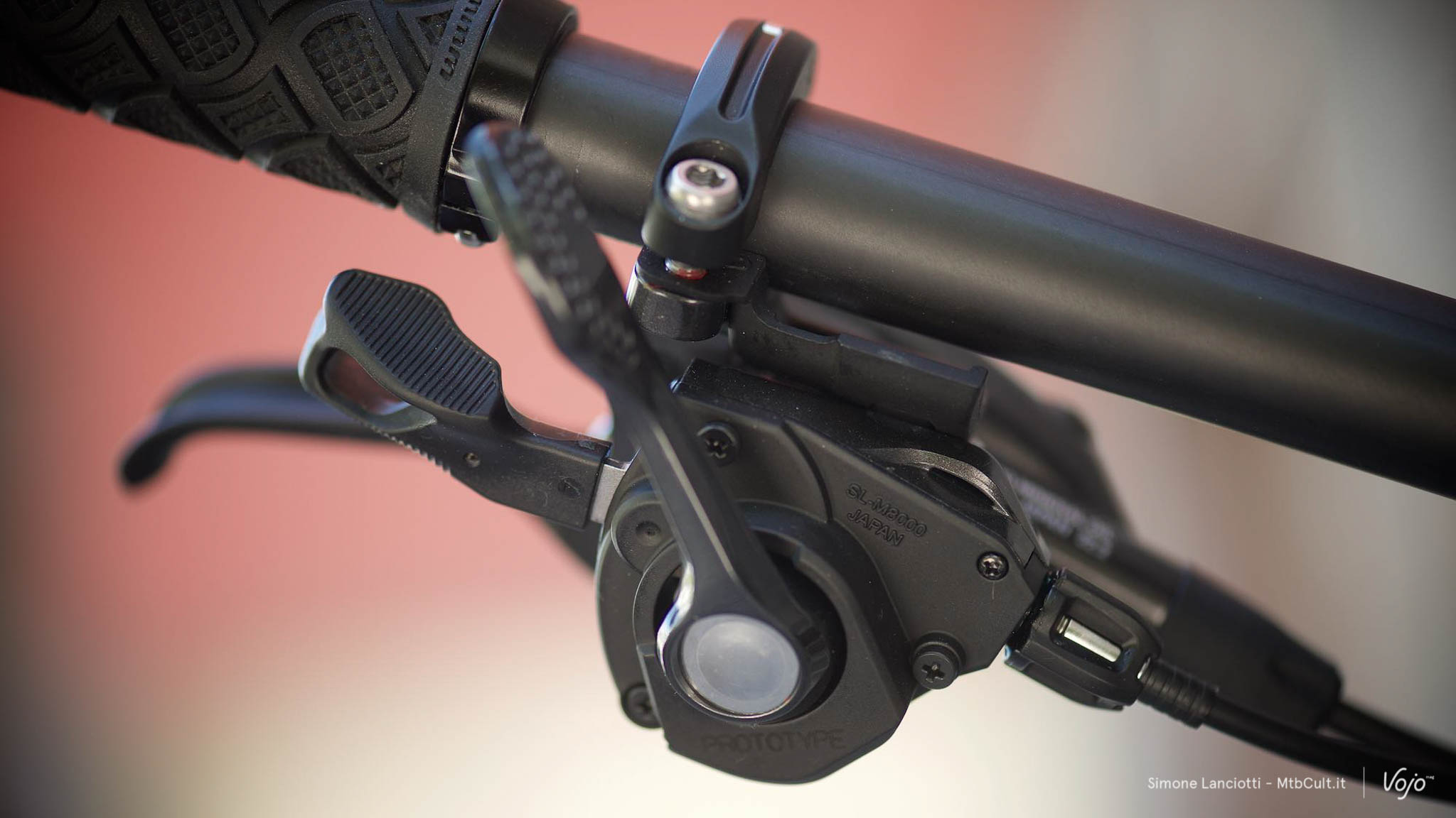 La forme du levier permettant de descendre les vitesses a un peu changé. Elle s’inspire directement du XTR Di2, avec un caoutchouc strié pour une meilleure accroche. On est heureux de voir qu’on peut toujours l’actionner tant avec l’index que le pouce, mais avec ce dernier et si on porte des gants longs avec également du caoutchouc, on a presque trop de grip et il arrive que le doigt accroche sur l’arrête du levier avant de pouvoir bien se positionner.
