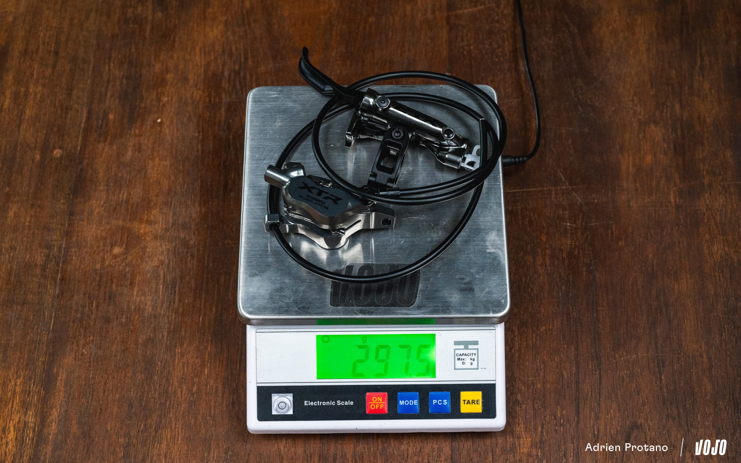 Nous n’avons pas encore eu l’occasion de peser les freins XC M9200, qui restent très proches de ceux de la précédente génération. Par contre, nous avons bien reçu la version trail/enduro M9220 qui est, elle, complètement nouvelle. Le poids n’est pas la principale préoccupation sur ce modèle qui se veut avant tout puissant et particulièrement soigné niveau ergonomie. Avec moins de 300 g pour un ensemble avant, Durit non recoupée, il est une dizaine de grammes plus lourd que son prédécesseur, mais il reste bien placé par rapport à la concurrence.