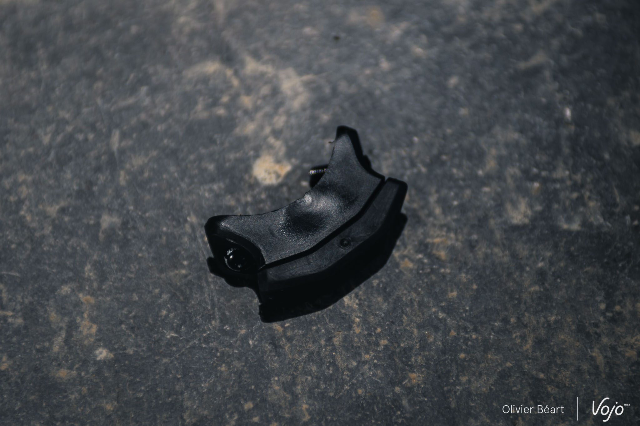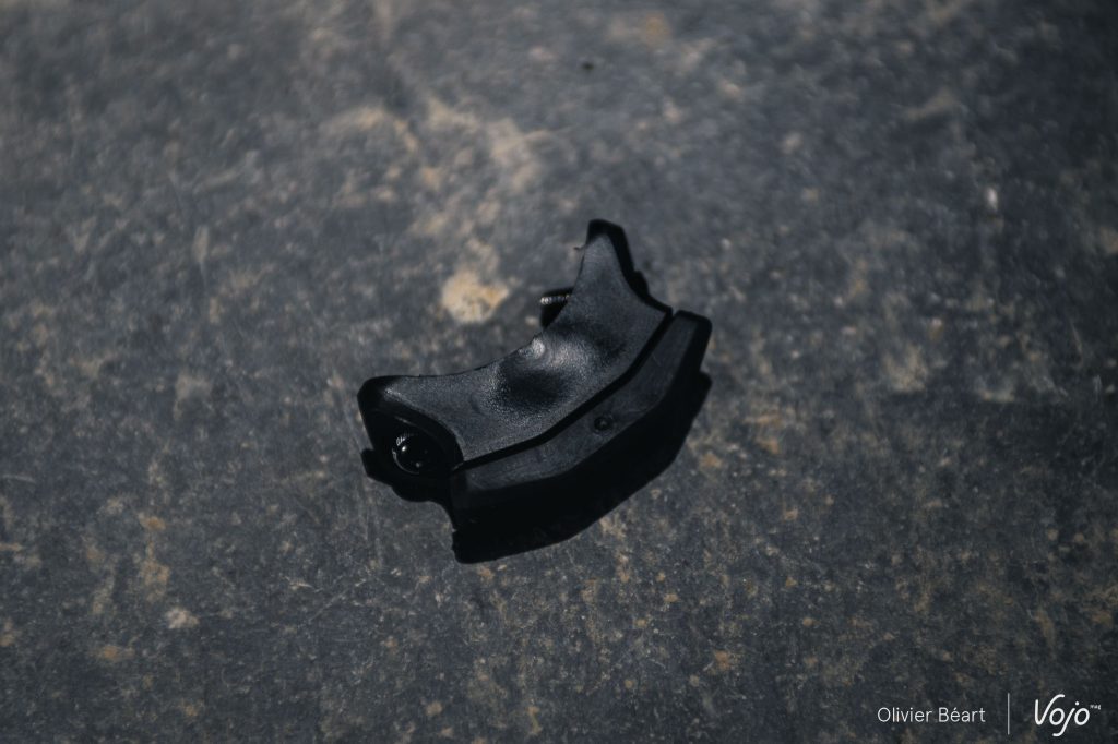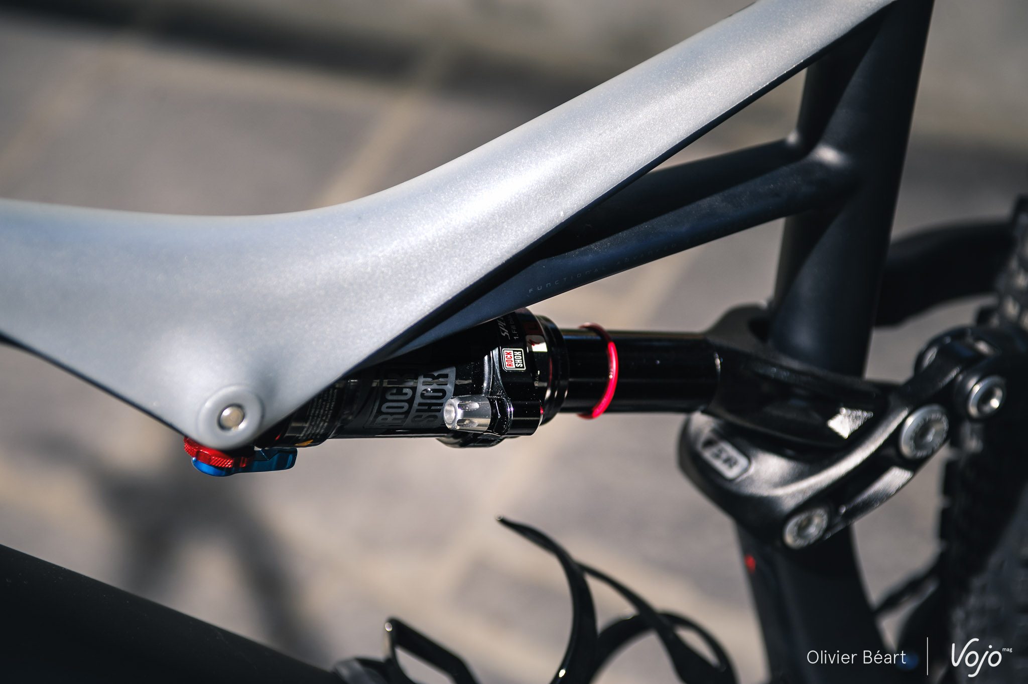 Autre détail que nous avons pu regarder plus attentivement, le petit « pare-choc » qui permet d’éviter que les mollettes de réglage de la fourche viennent endommager le cadre, dont le tube diagonal est droit pour gagner en poids et en rigidité.