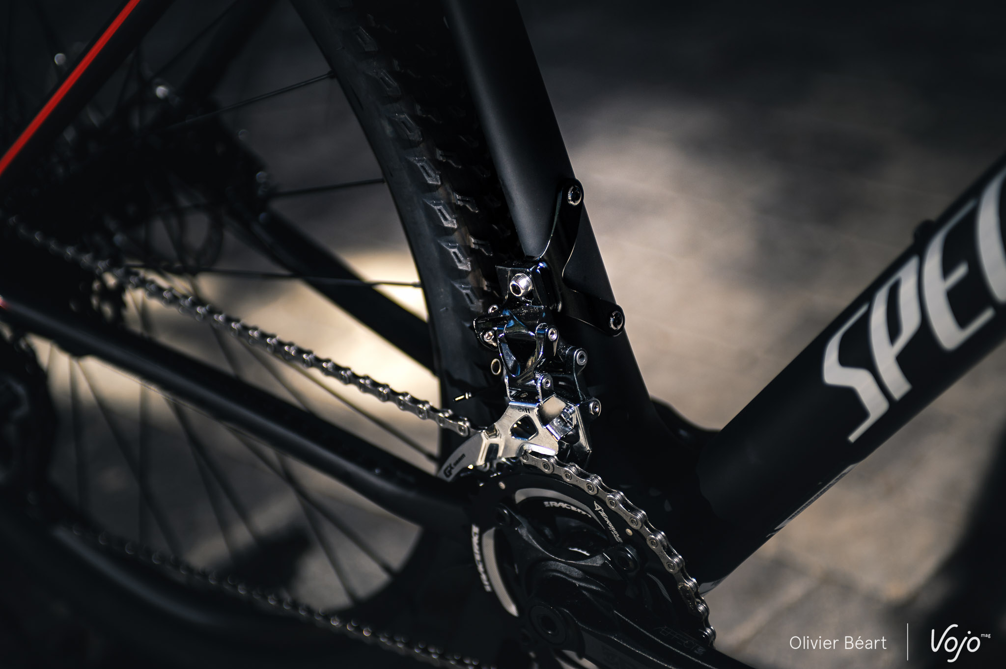 Son cadre en carbone Fact 11r est annoncé à 1180g, soit à peu de choses près le poids du précédent Stumpjumper S-Works. Le vélo est compatible double plateau grâce à une patte amovible permettant, comme ici, de fixer le dérailleur avant. Specialized a suivi une voie originale et discrète en utilisant les vis du porte-bidon.