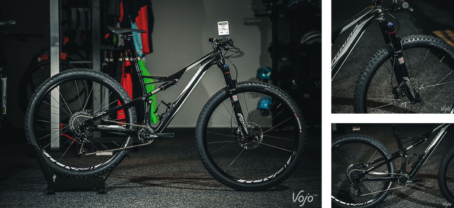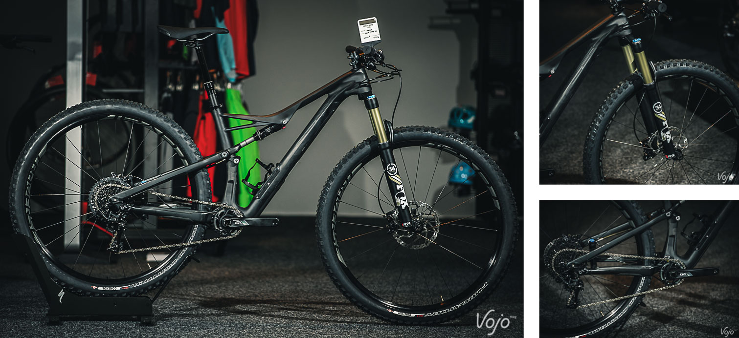 Triangle avant en carbone avec Swat Door, arrière en aluminium M5, amortisseur Fox classique sans Brain, roues Roval avec jantes 29mm de large, fourche RockShox Revelation RC3 120mm, transmission Sram GX, freins Shimano Deore.