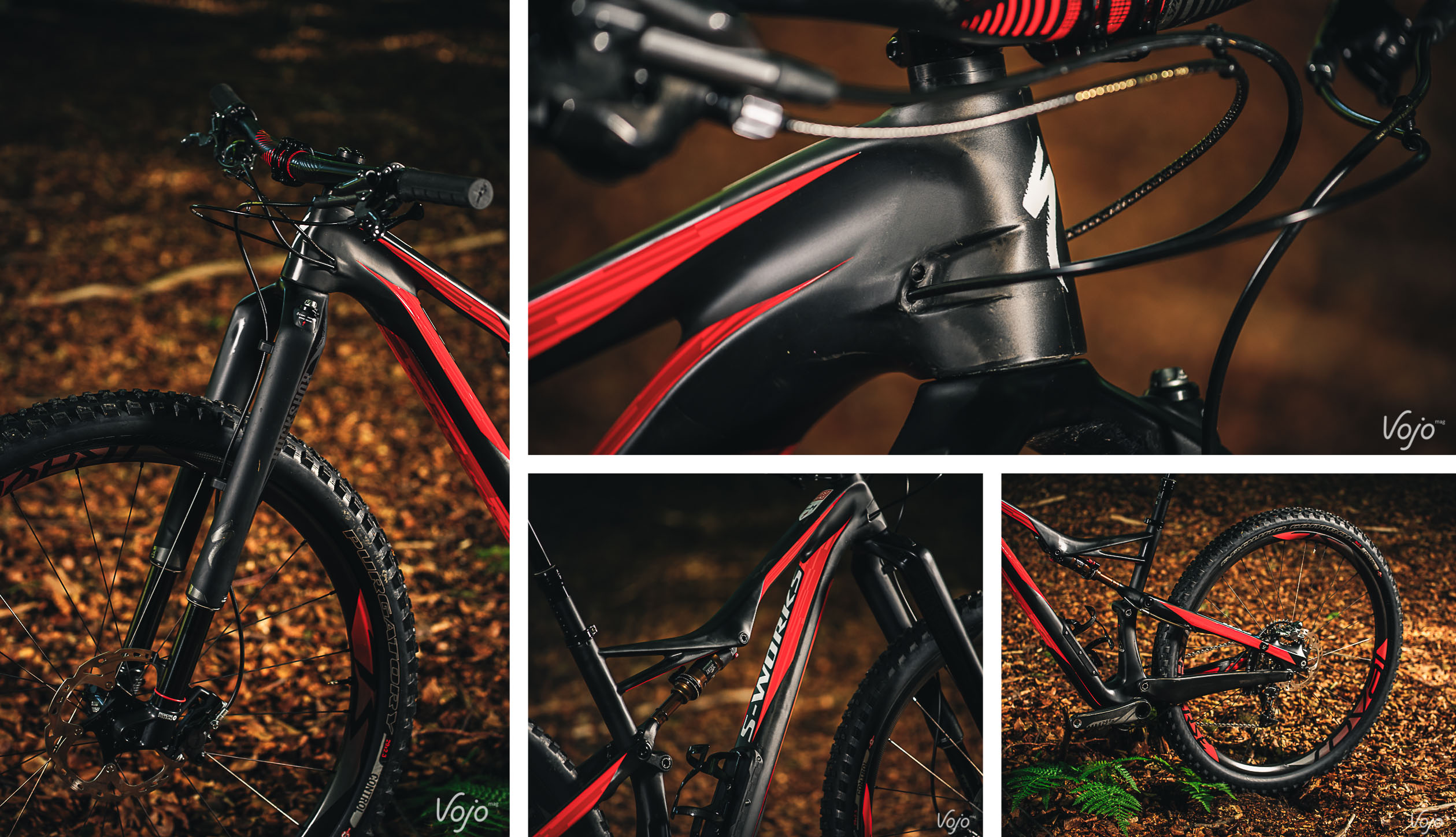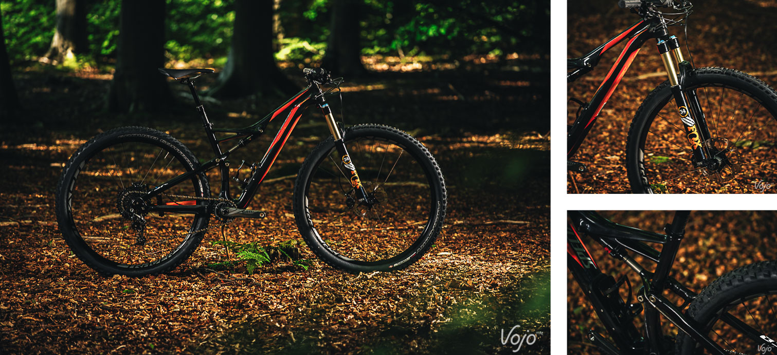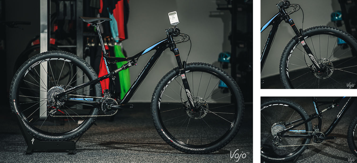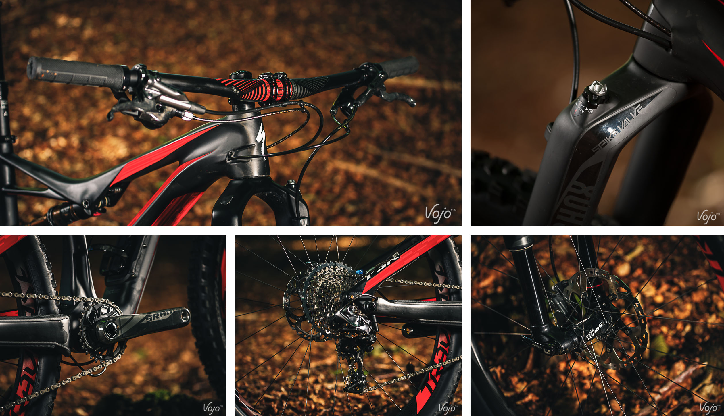 Cadre intégralement en aluminium M5, amortisseur Fox classique sans Brain, roues Roval avec jantes 29mm de large, fourche RockShox Revelation RC3 120mm, transmission 2×11 Sram X7/GX, freins Shimano Deore.