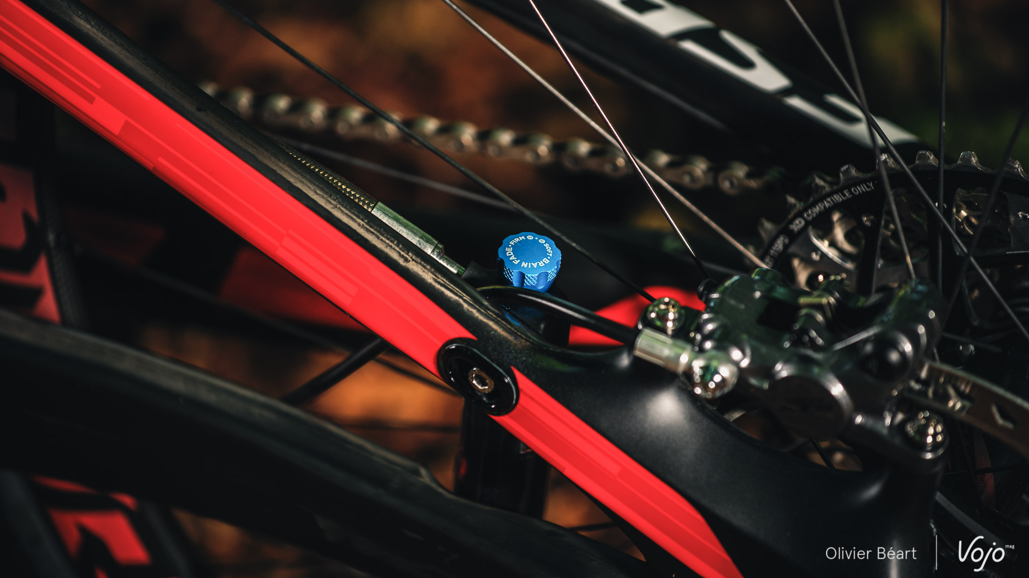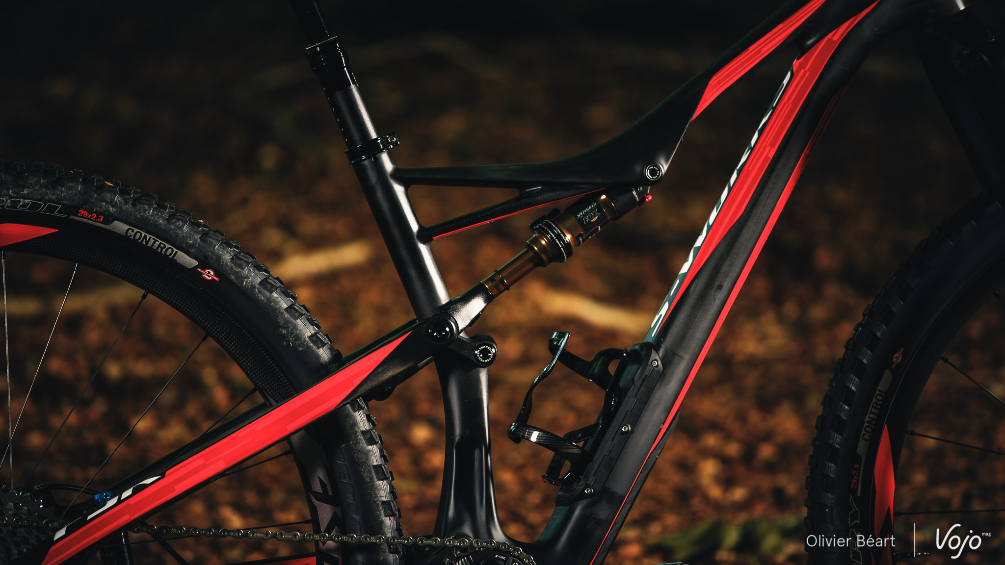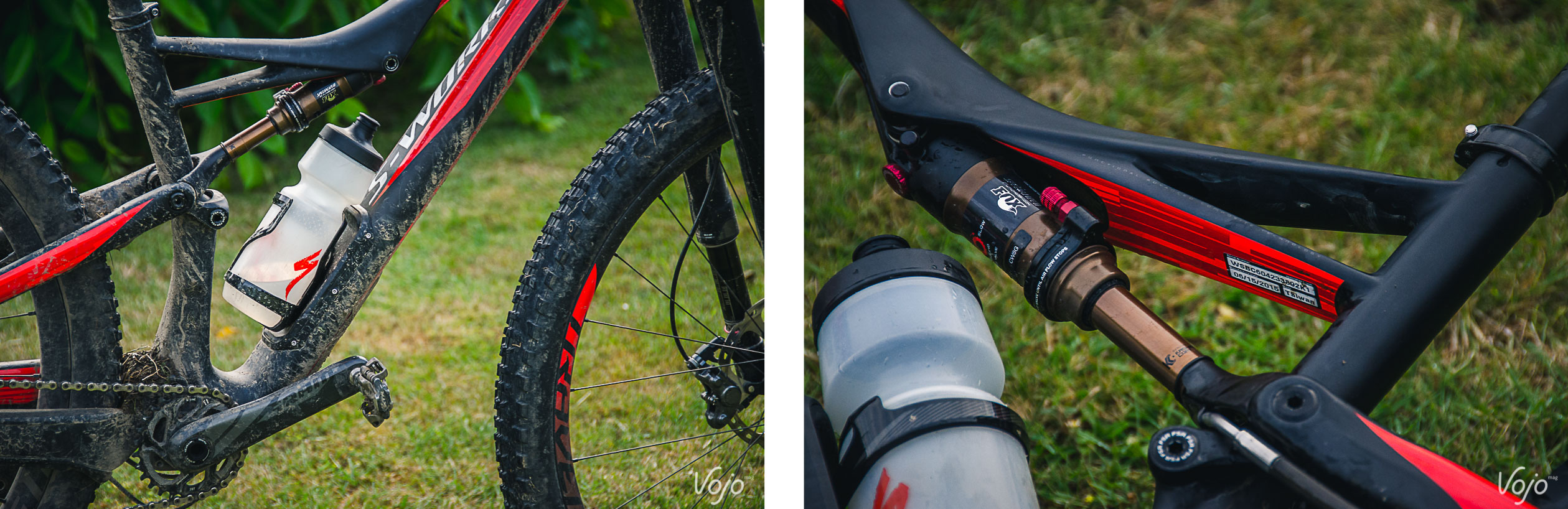 A l’avant, nous avons aussi dégonflé un peu la RockShox RS-1 par rapport aux recommandations de la marque, mais en fermant complètement la mollette de réglage de la Spike Valve. A ce sujet, nous n’avons pas vraiment été convaincus par le système. Ok, c’est agréable de se passer de blocage au guidon et de pouvoir garder les mains en permanence sur le cintre, mais l’action de la Spike Valve est vraiment très discrète, voire même trop, et la mollette de réglage n’est pas très efficace. Le pompage reste bien présent, mais par contre on perd un peu en confort sur les petits chocs alors que c’est un des gros points forts de la RS-1. C’est cependant un des seuls points sur lesquels nous avons trouvé quelque chose à redire sur ce nouveau Camber S-Works car pour le reste, chers lecteurs, quel cocktail !