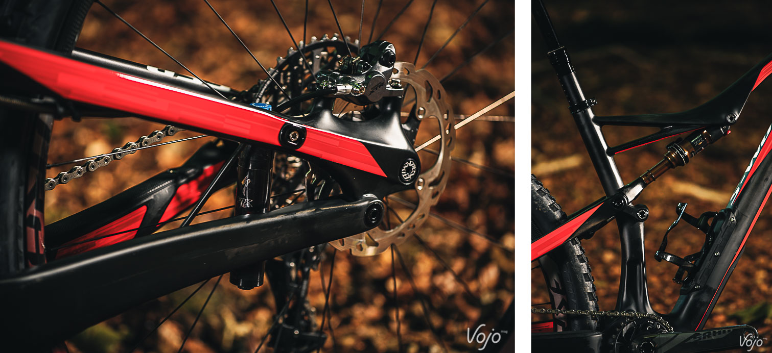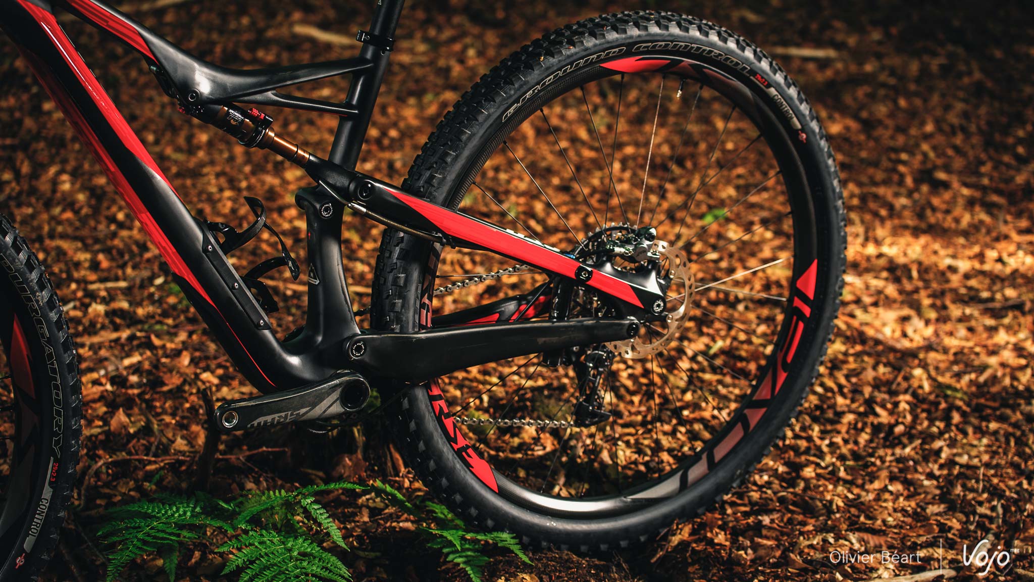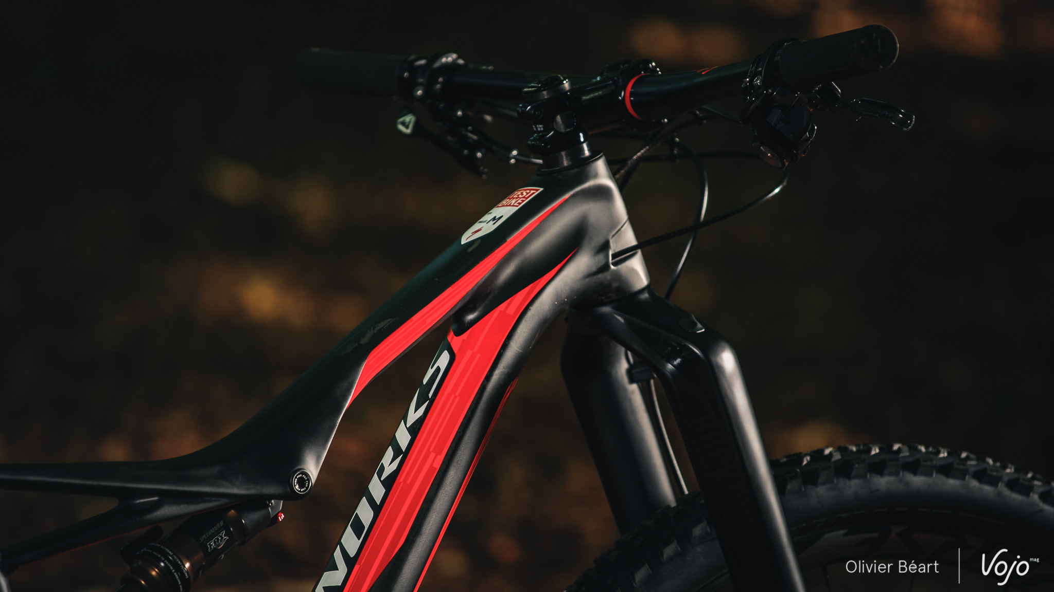 A noter que le bras arrière en carbone est l’apanage du seul modèle S-Works. L’épaisseur des bases est impressionnante et garantit une rigidité sans faille. L’axe arrière reste quant à lui en 142×12, ce qui confirme que, mis à part pour le « Plus », Specialized reste fidèle aux solutions classiques.