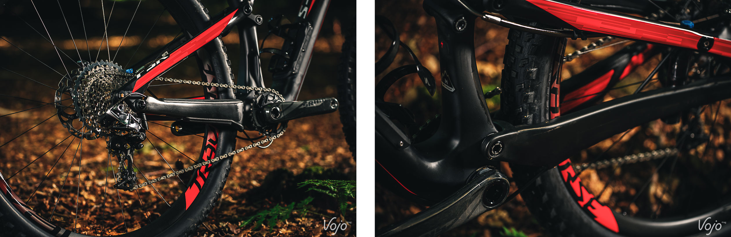 Triangle avant en carbone avec Swat Door, arrière en aluminium M5, amortisseur Brain, roues Roval Traverse Alu, fourche Fox 34 Performance 120mm, transmission Sram XO1, freins Shimano XT.