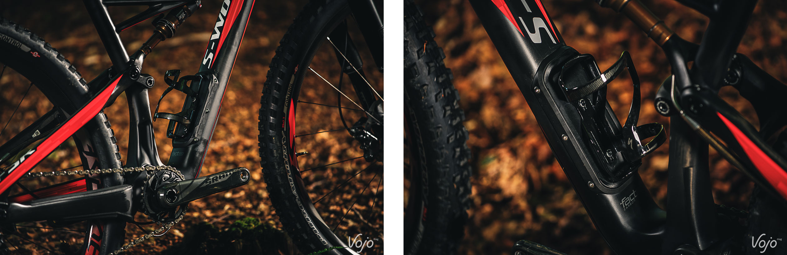 Comme l’avant est similaire à celui du Stumpjumper et que le programme du vélo s’y prête, le Camber 2016 carbone est logiquement doté de la Swat Door qui permet de loger un nécessaire de réparation complet ainsi que quelques barres énergétiques dans le tube diagonal, sous le porte-bidon (voir notre article sur le Stumpjumper pour plus de détails). Le passage des câbles et durits se fait aussi en interne avec un guide moulé sur toute la longueur.