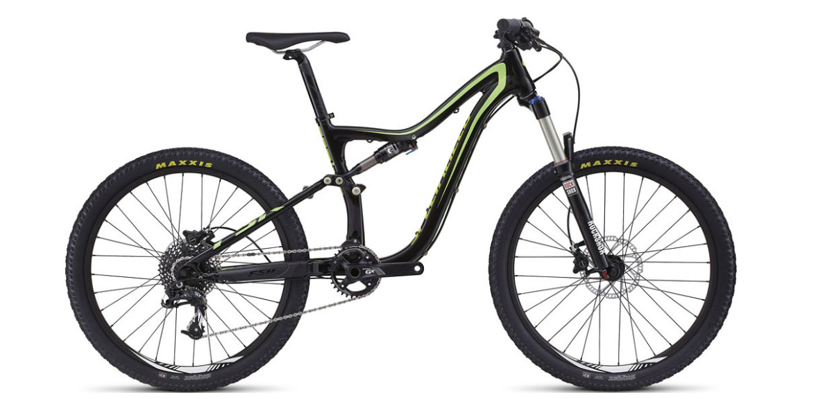 Cadre intégralement en aluminium M5, amortisseur X-Fusion, roues Specialized Stout/Alex Rims, fourche RockShox Recon Silver 120mm, transmission 2×9 Shimano Alivio/Deore, freins Tektro.