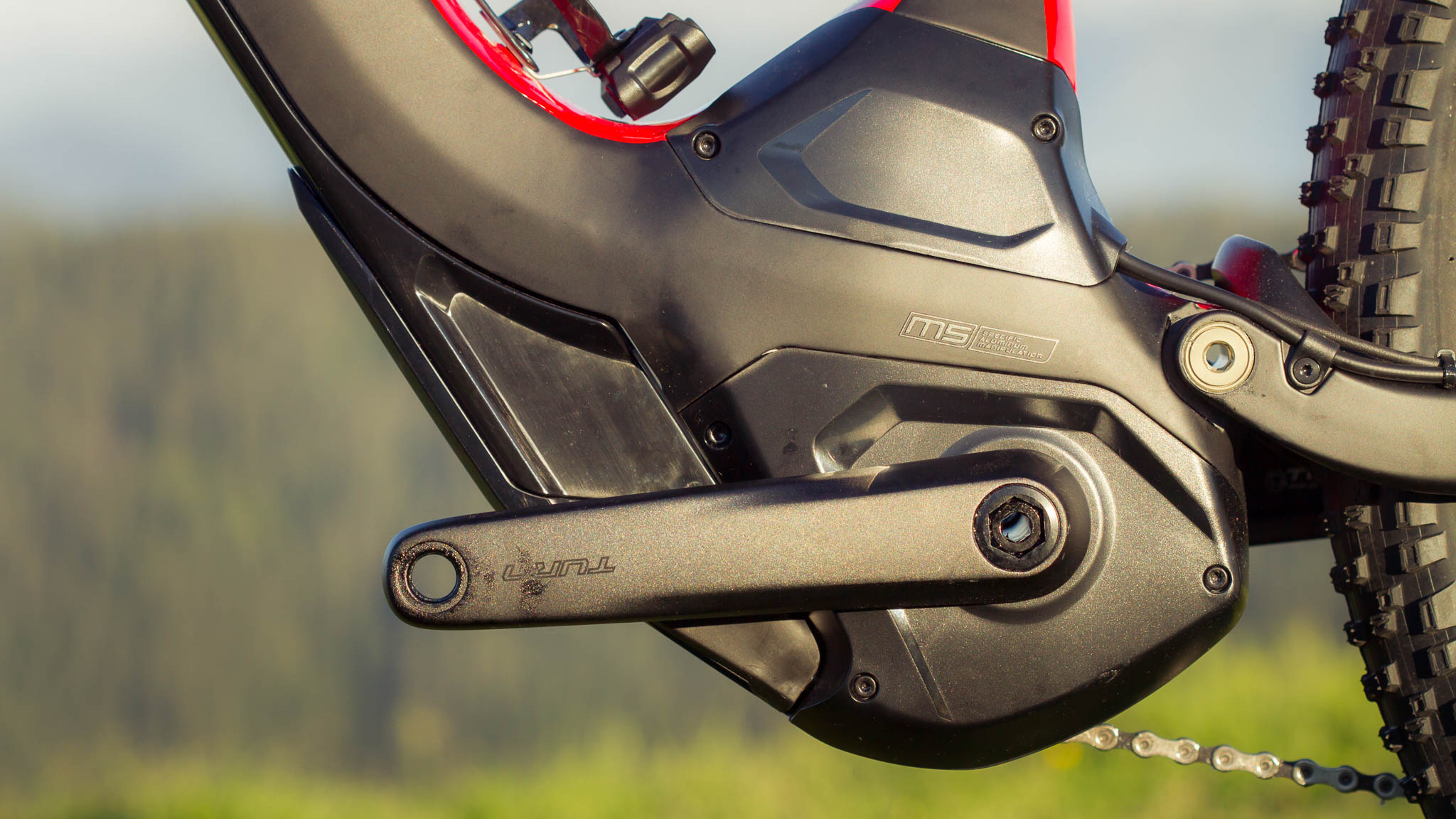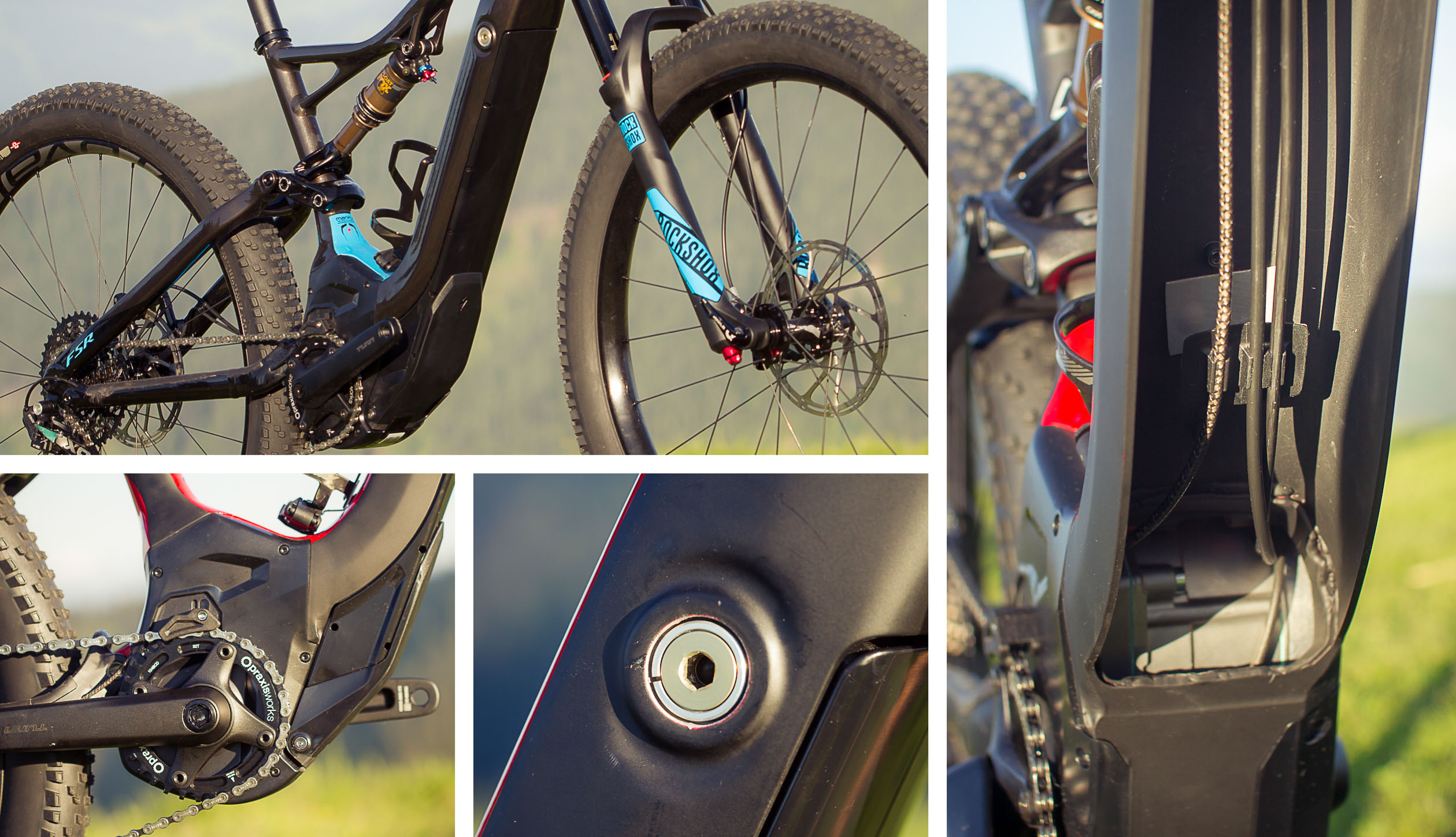 Le moteur en lui-même ne pèse que 3,4kg et il délivre 530W, pour un couple de 90Nm, ce qui est un élément très important en VTT (à titre de comparaison, le nouveau Bosch Performance délivre 75Nm). Un effort particulier a également été fait au niveau du silence de fonctionnement. L’intégration se voit aussi au niveau du capteur de freinage (qui sert à couper le moteur directement quand le pilote freine), qui est bien protégé et intégré de façon discrète au niveau du disque arrière.