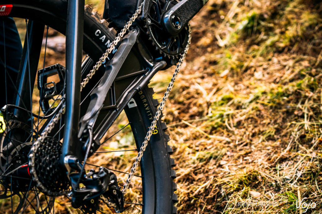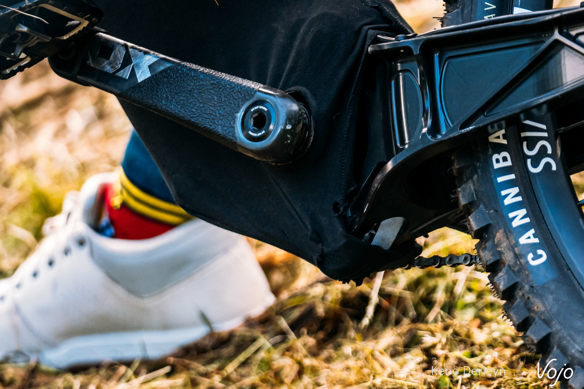 La suspension est totalement cachée dans une housse Néoprène pour garder ses secrets, mais on remarque qu’il n’y a plus de liaison entre la biellette supérieure et le bas du triangle arrière, comme c’est le cas sur le Demo actuel. Et la biellette arbore, elle aussi, une conception « triangulée » qui rappelle celle des bases.