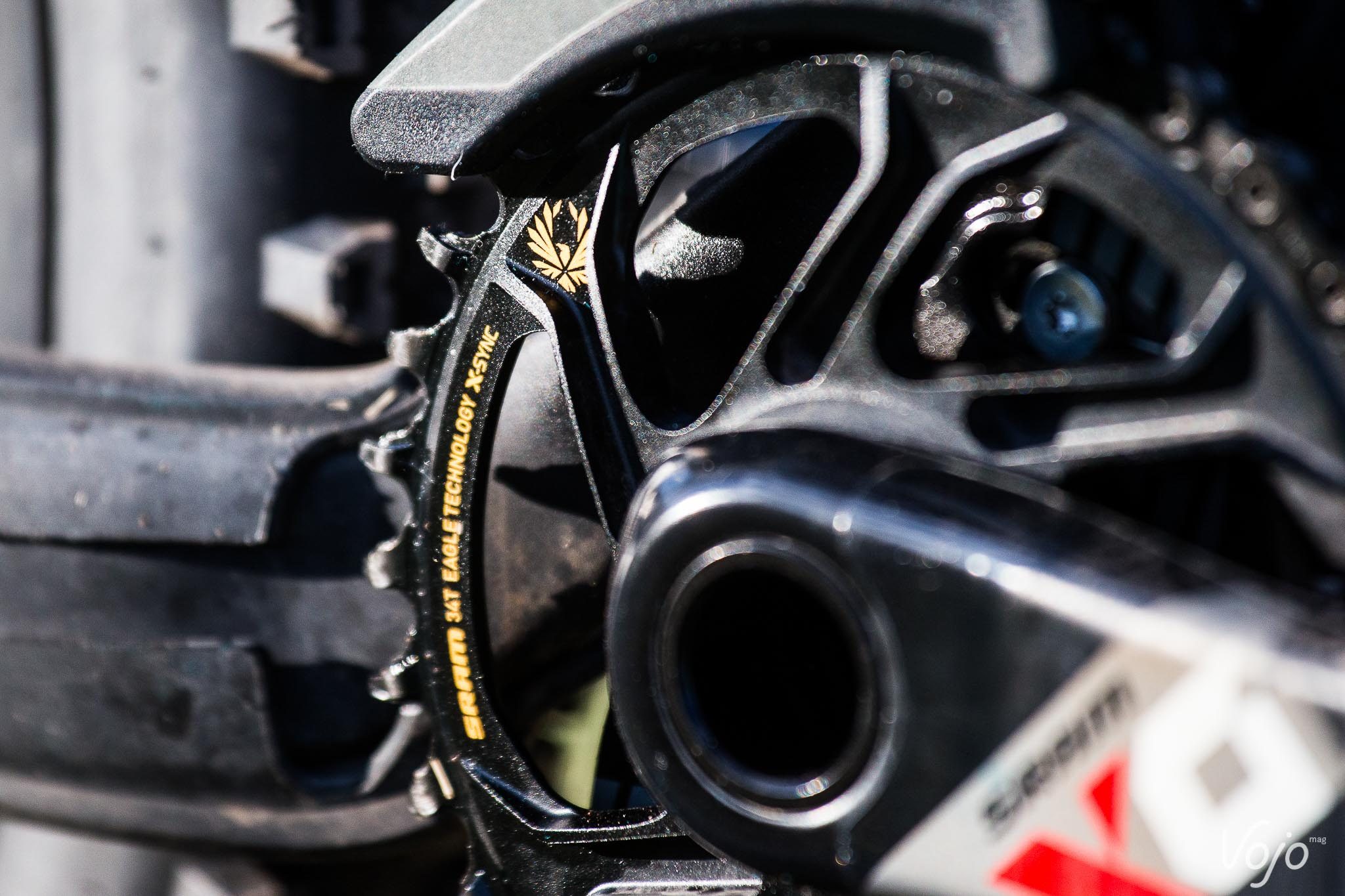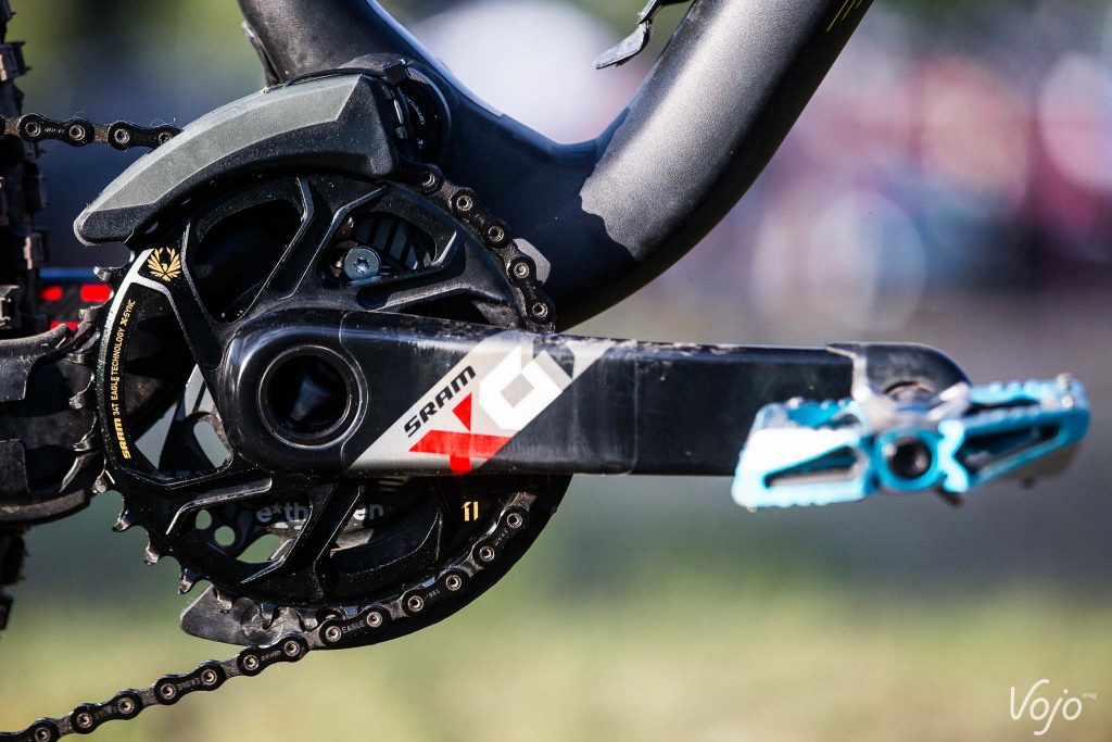 La solide leader du classement général provisoire des EWS a aussi reçu son groupe Sram XO1 Eagle en 12 vitesses, qu’elle roule avec un plateau de 34 dents.