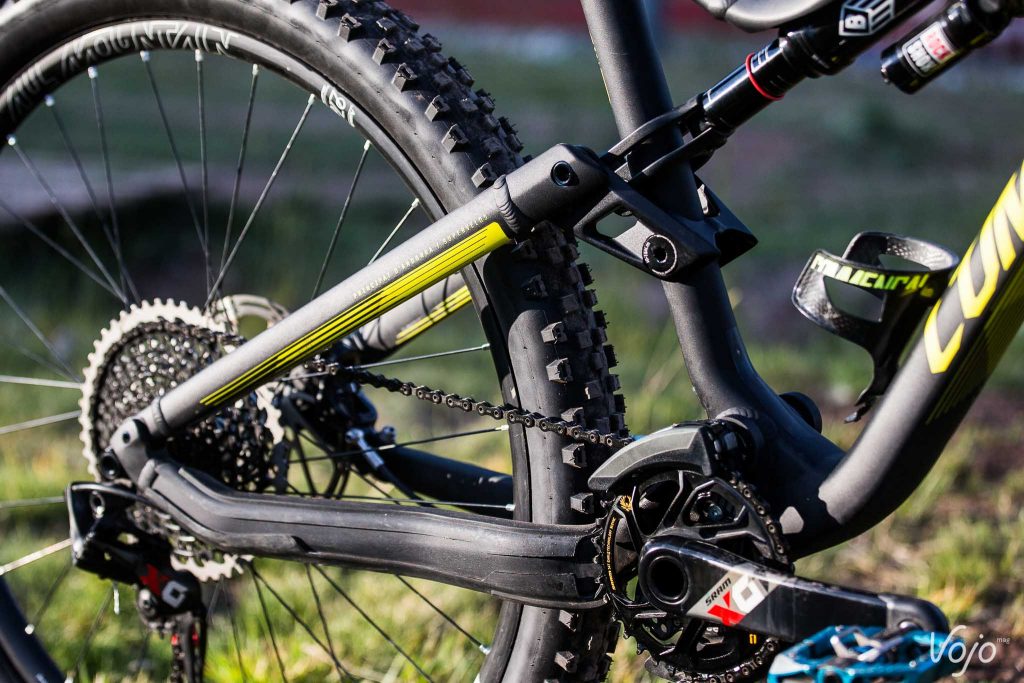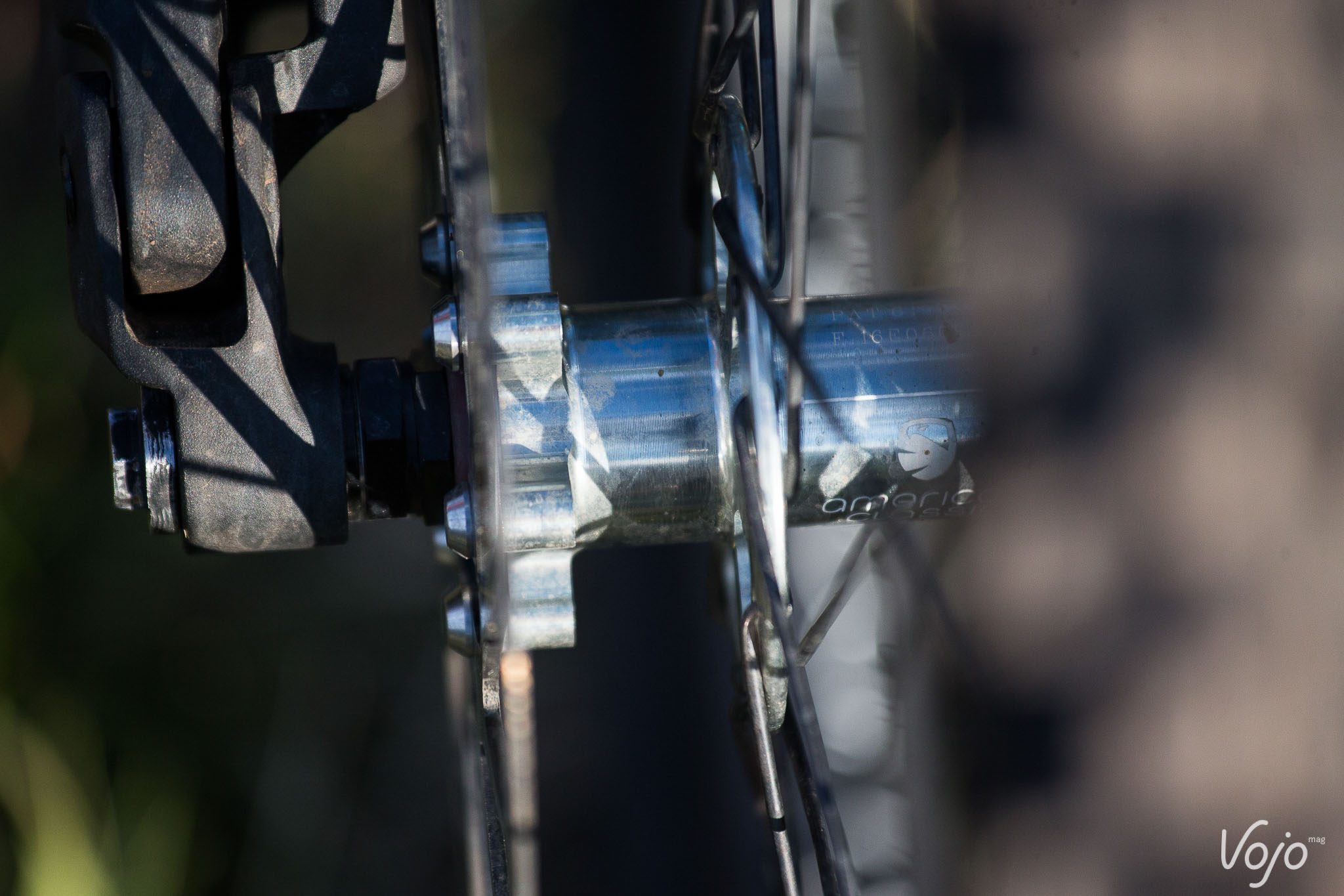 Plus à l’arrière, on remarque que l’axe de roue passe au Boost 148, comme le signale le déport important du moyeu des roues American Classic AM (la marque a préféré continuer à jouer la carte de la symétrie du rayonnage sur ses moyeux Boost plutôt que de déporter plus la flasque gauche). Il faudra voir lors de la présentation officielle si les bases du Commencal Meta AM V4 2017 ont été raccourcies grâce à ce changement. Elles mesuraient auparavant 437mm.