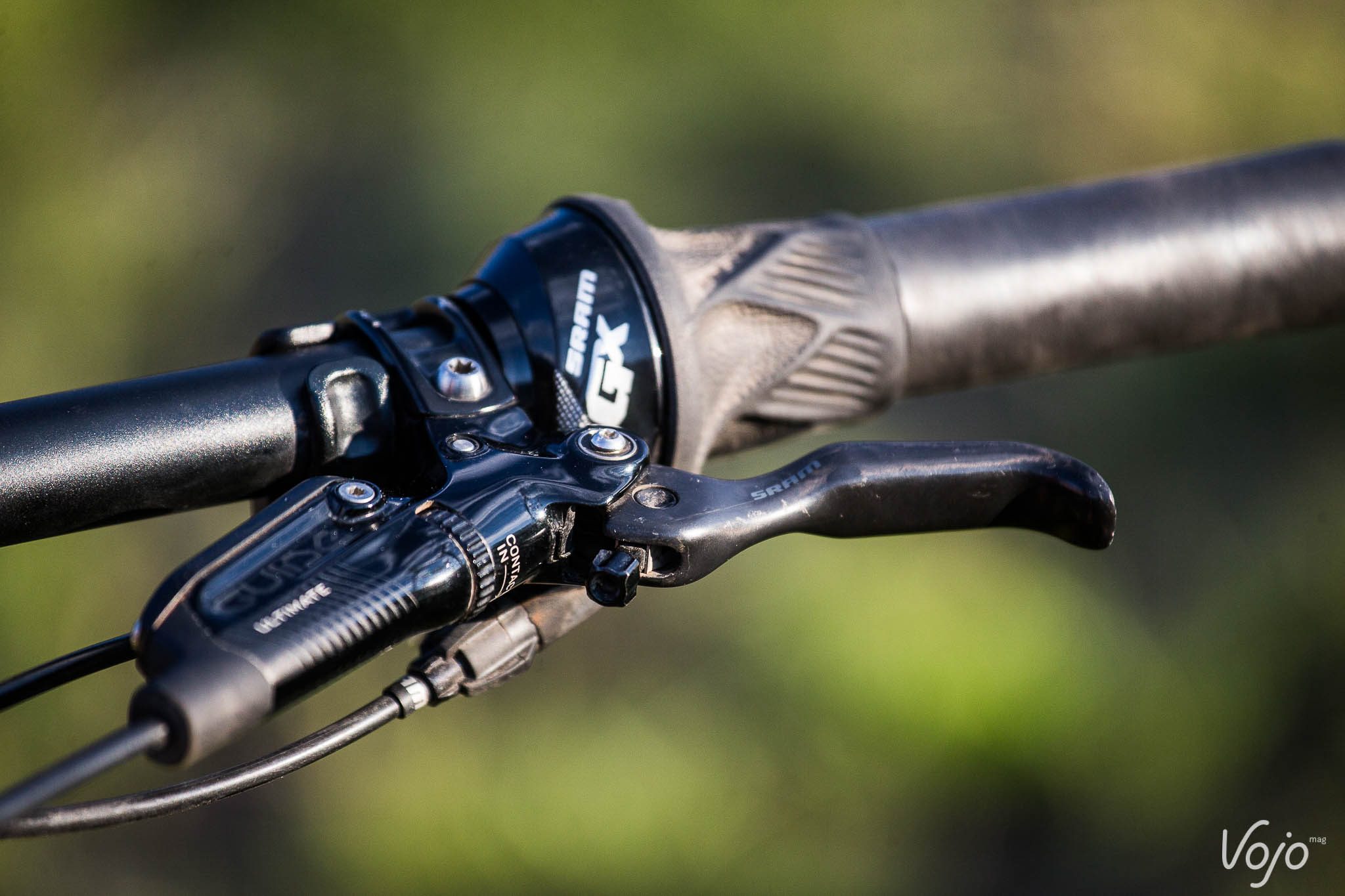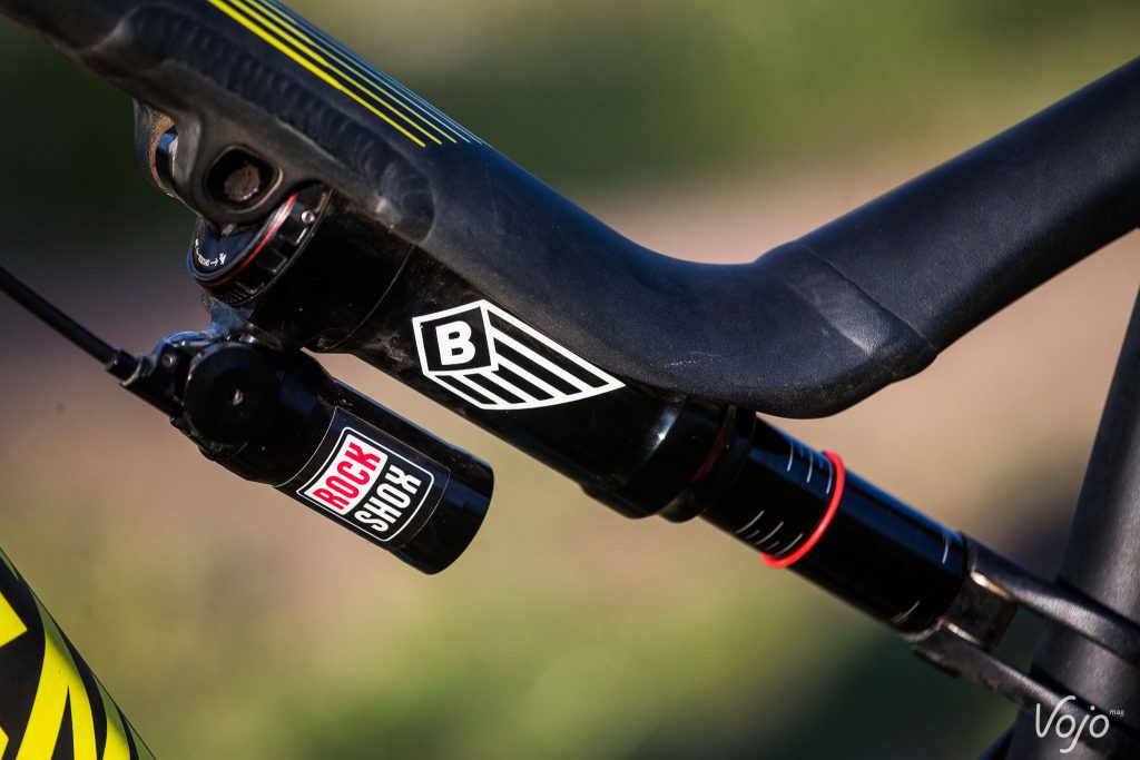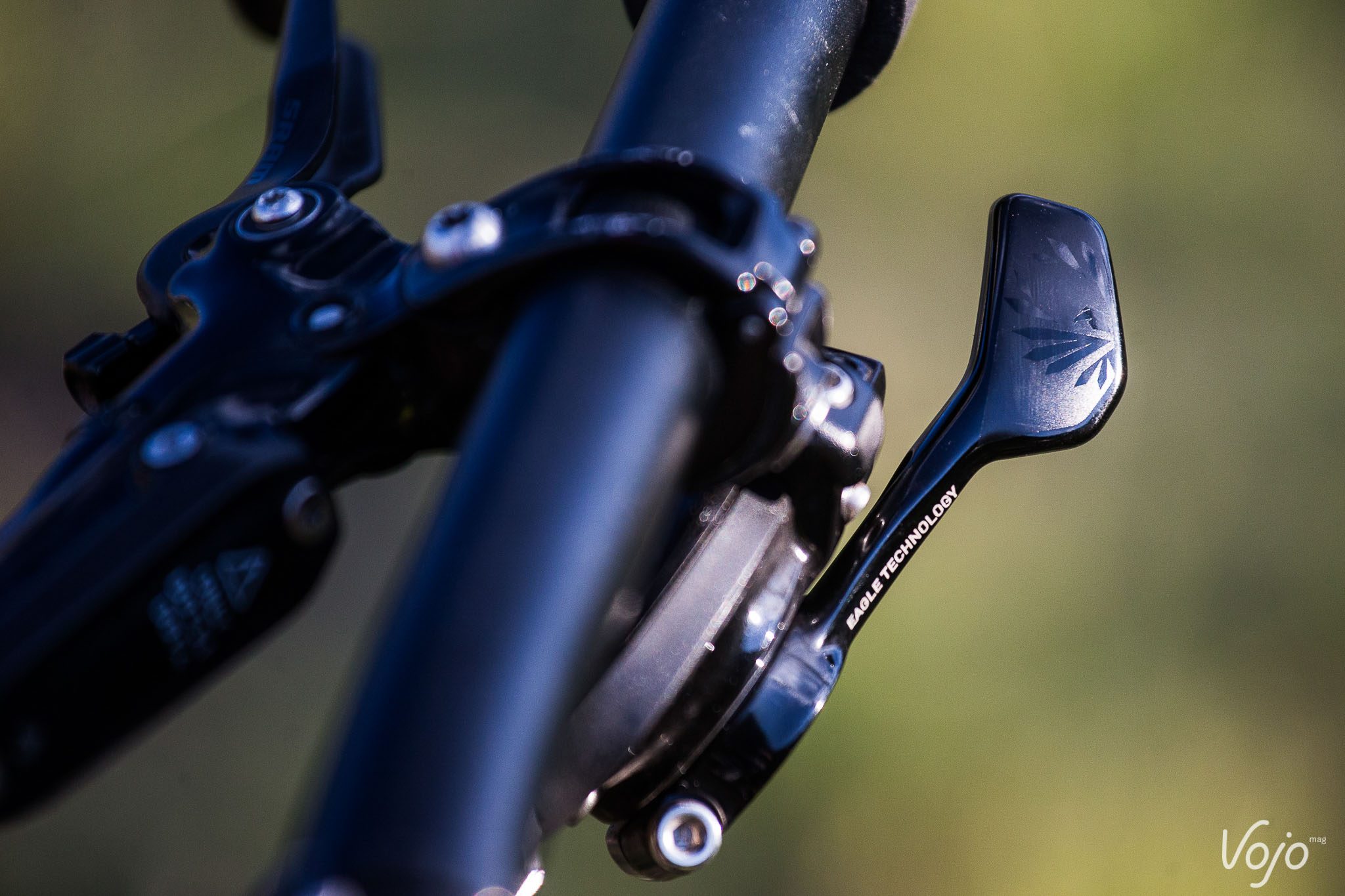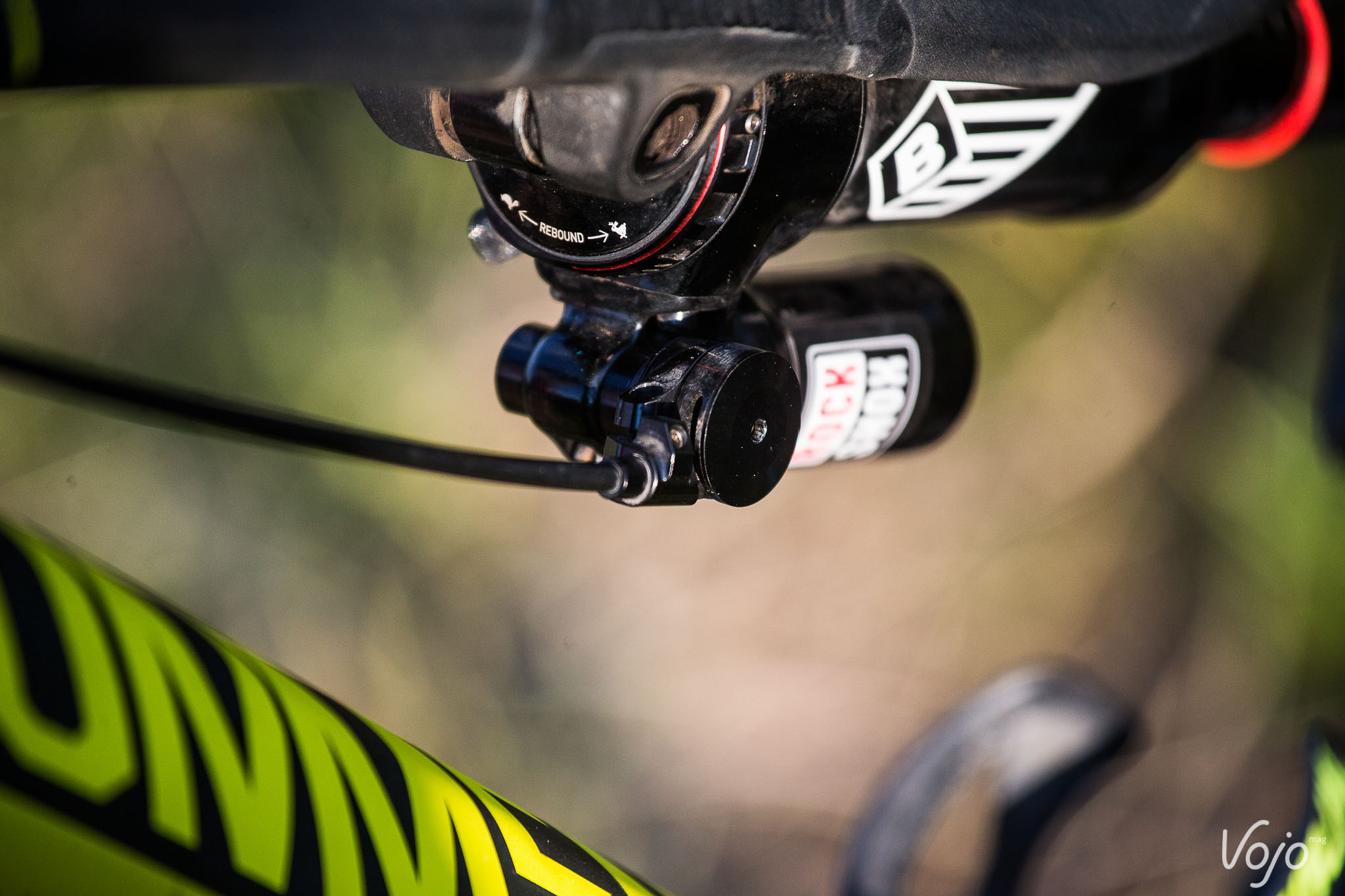 Au niveau de l’amortisseur lui-même, on note qu’il s’agit d’un RockShox Monarch Deluxe en métrique. On reconnaît aussi la nouvelle mollette imposante pour le réglage du rebond. Mais on voit aussi que Cécile Ravanel fait partie du programme BlackBox de Sram/RockShox. A ce titre, outre un amortisseur préparé aux petits oignons, elle peut tester des évolutions qui ne sont pas encore proposées sur des vélos de série. C’est le cas notamment de ce système de blocage au guidon…