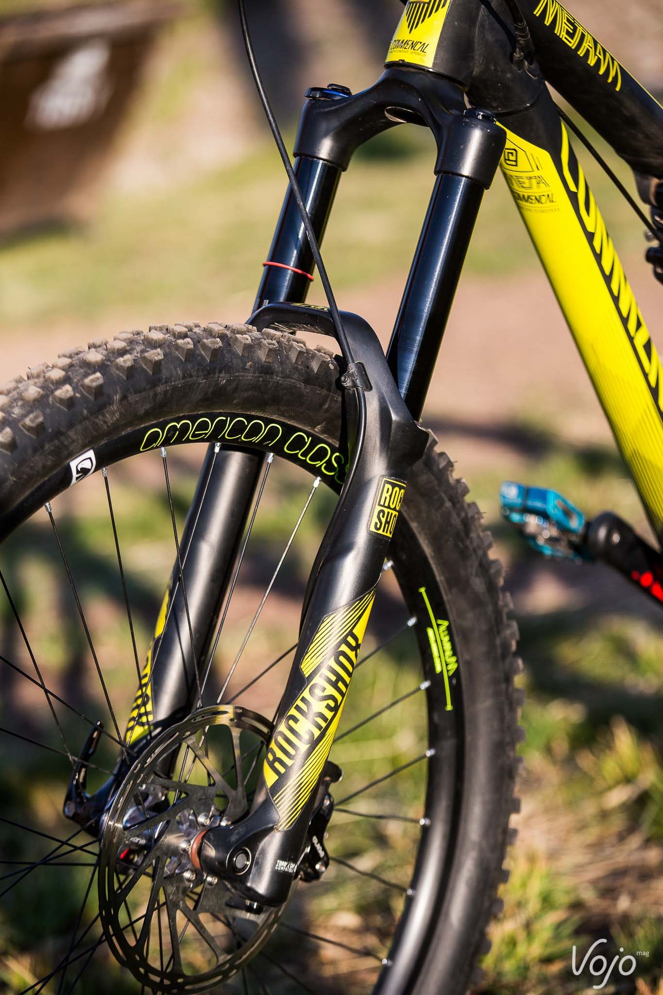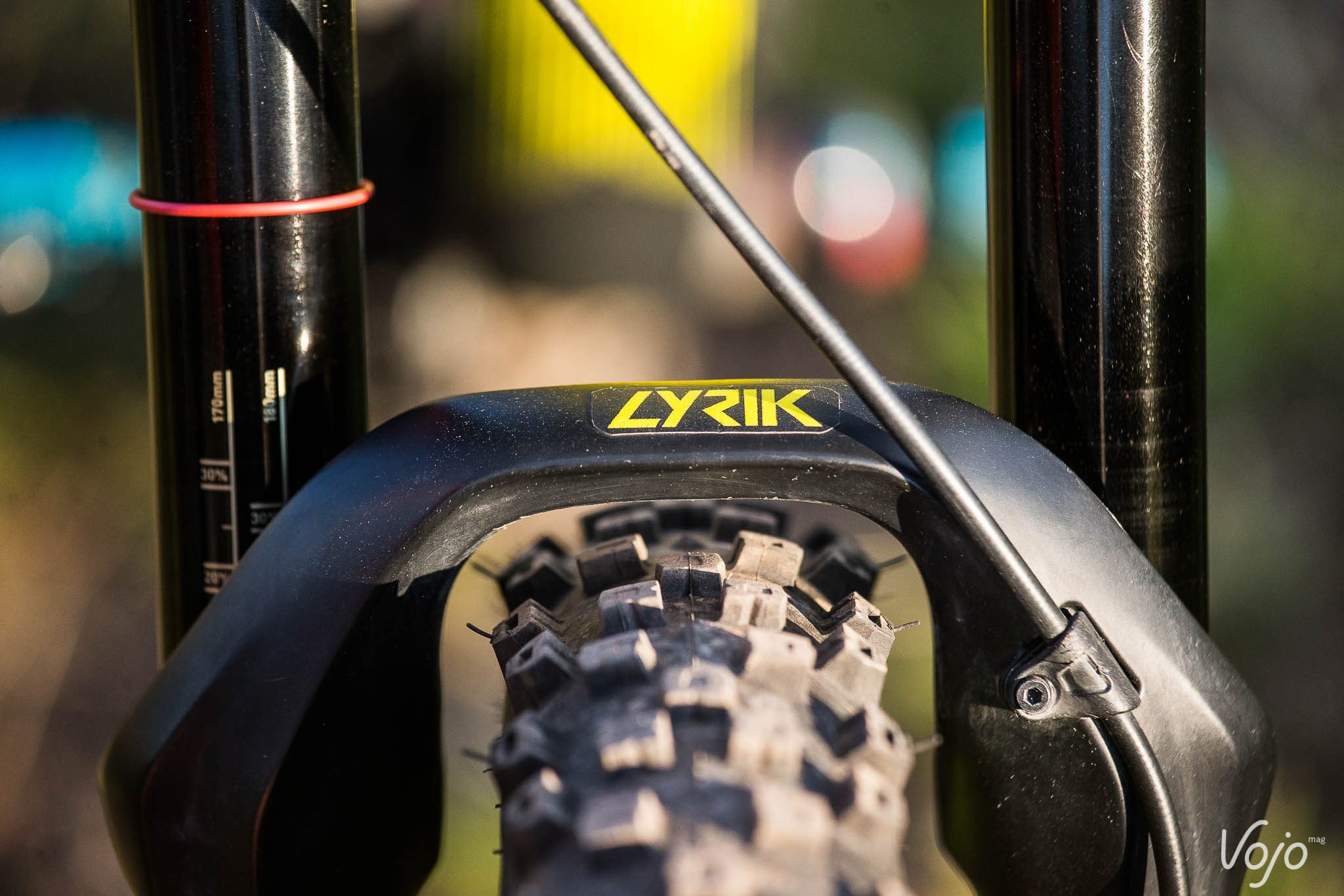 Au niveau des équipements propres au vélo de course de Cécile Ravanel, on remarque la présence d’une RockShox Lyric en 170mm de débattement, qu’elle utilisait déjà sur la précédente version. Le débattement du Commencal Meta AM V4 2017 qui sera vendu dans le commerce devrait par contre rester de 160mm à l’avant et 150mm à l’arrière.