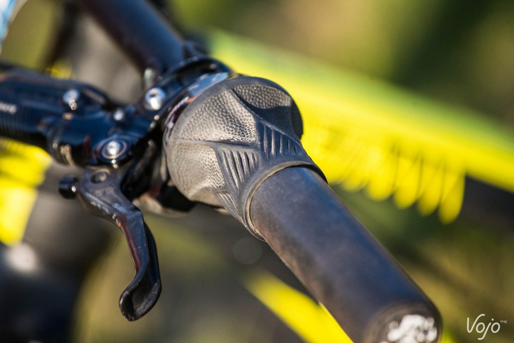 … Qui est reliée à une poignée tournante Sram Gx sur le cintre ! On se souvient que Jérôme Clementz a été un des premiers à utiliser cette solution. Cécile Ravanel a-t-elle simplement repris cette bonne idée ou Sram et RockShox nous préparent une version officielle ? Wait and see !