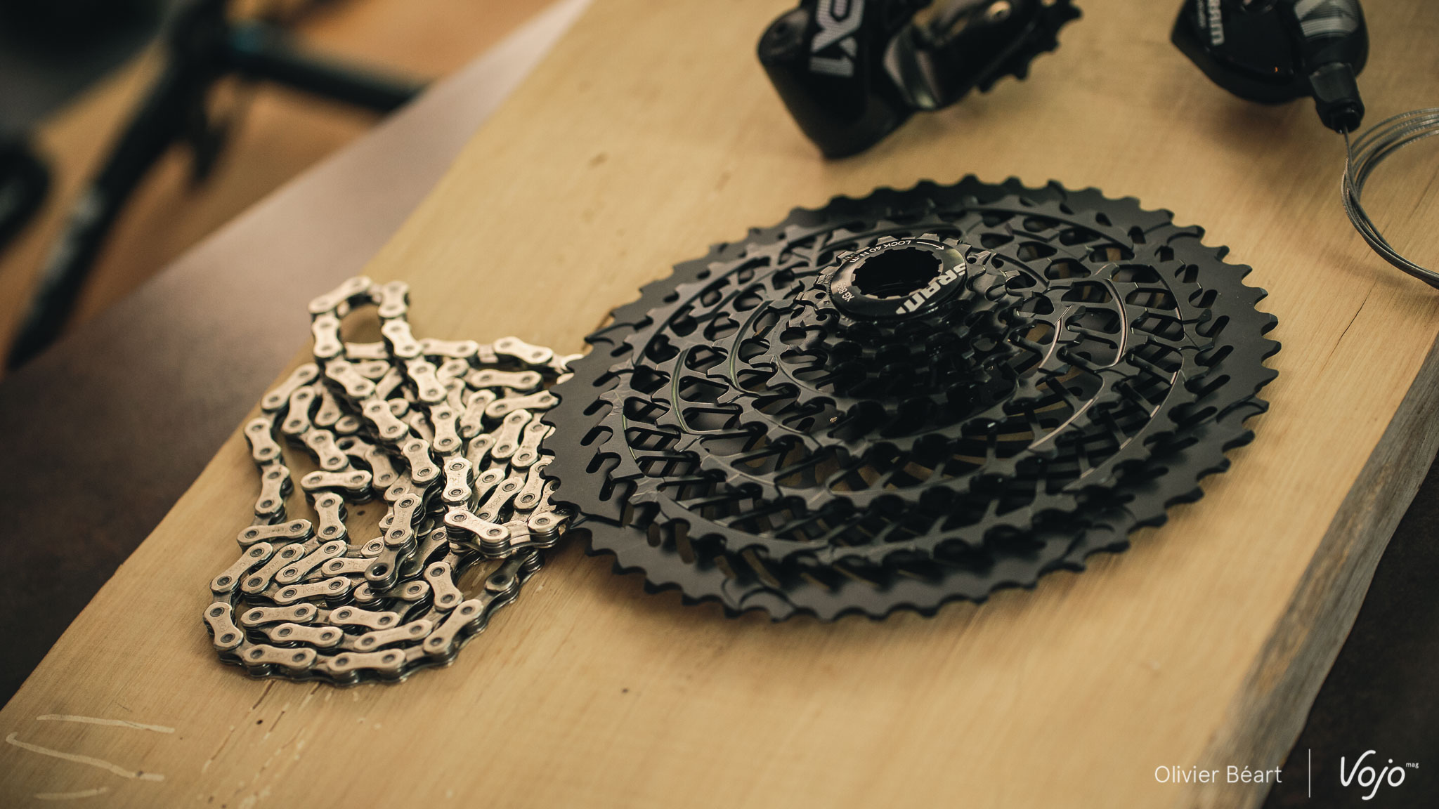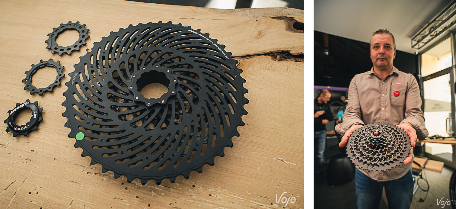 Les recherches menées par Sram ont aussi amené la marque à réduire le nombre de vitesses. Une démarche étonnante de la part de la marque qui est pionnière depuis plusieurs années dans l’augmentation du nombre de vitesses des transmissions (10, 11 et 12 vitesses très récemment). « Comme dit juste avant quand nous parlions du shifter, nous avons augmenté l’écart de taille entre les pignons. Sur une transmission classique, il y a 15 à 17% d’écart de développement en passant d’un pignon à l’autre. Ici, c’est 30% de différence. Pour des jambes humaines seules, ce serait trop. Mais avec un moteur, c’est parfait, » ajoute Marcus Schneider.