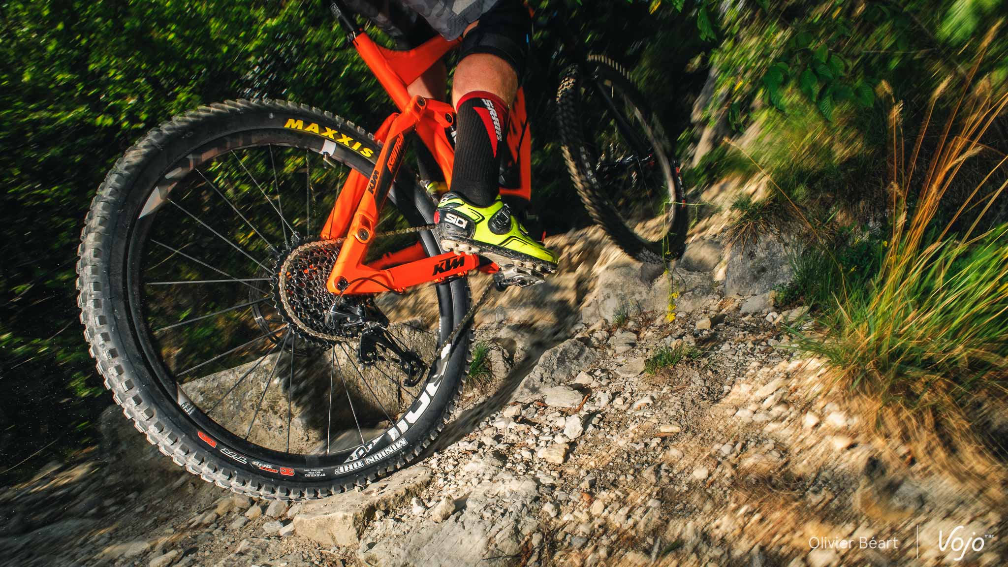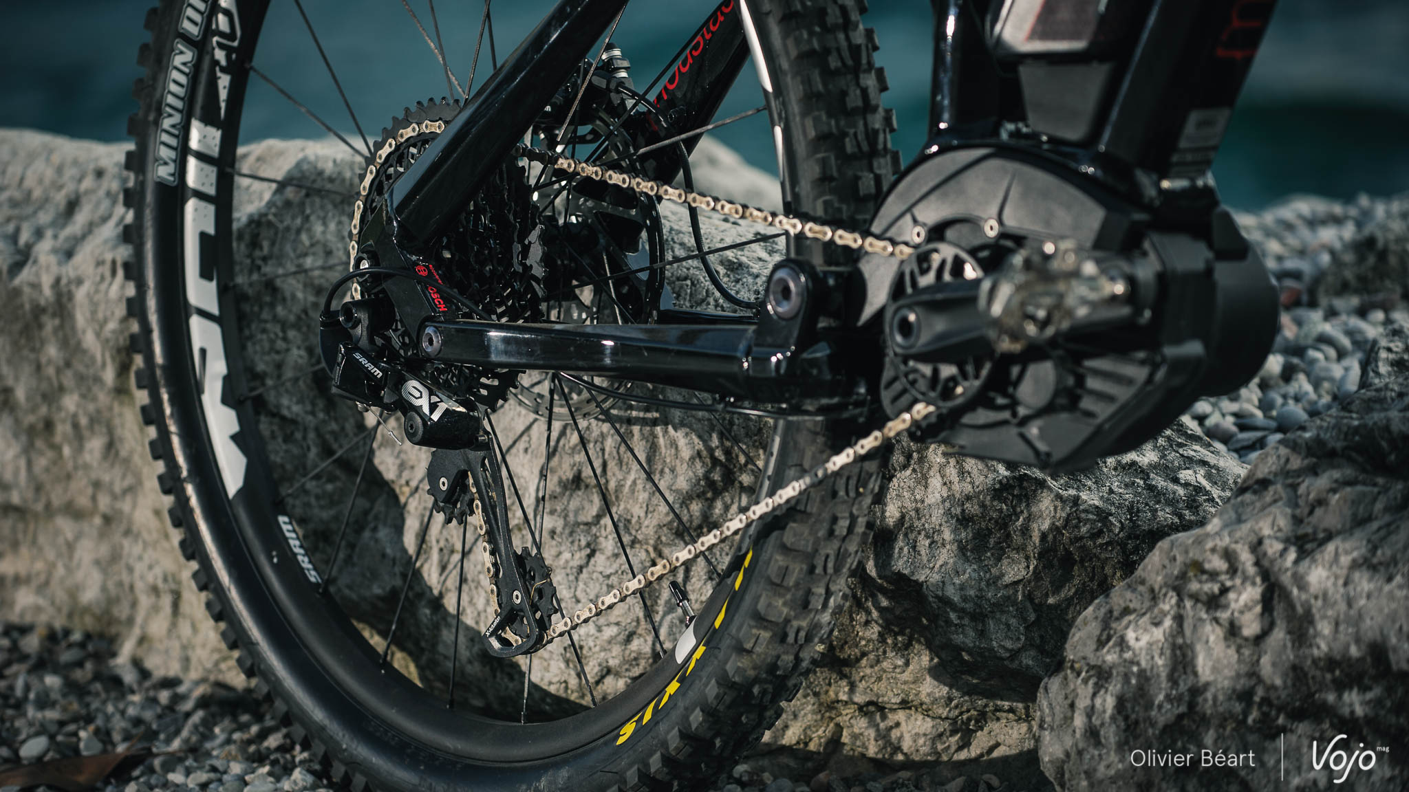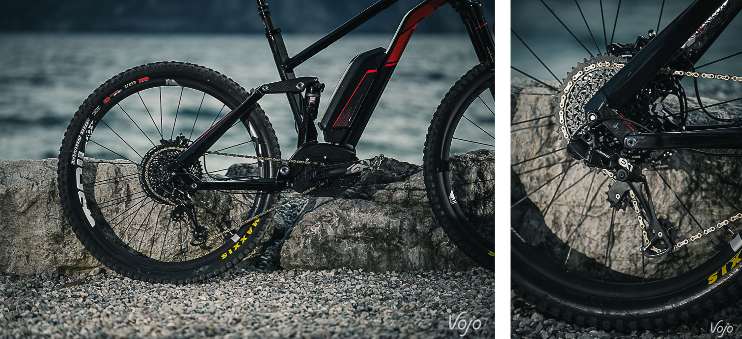 Un choix qui peut paraître étonnant et qui sonne comme un retour en arrière, mais comme Marcus Schneider nous l’explique : « Nous avons vu que le moteur permet de ne pas avoir besoin de changer aussi vite les rapports à la volée qu’avec une transmission classique. Il peut absorber les temps morts et un sous-régime temporaire, même s’ils ont tous une plage de régime optimale qu’il est important d’aller chercher le plus souvent possible. C’est pour cela que nous avons augmenté l’écart de développement entre les pignons, qui grimpe ici à 30%. De plus, avec le Sram EX1, même si on ne peut passer qu’un pignon à la fois, on est sûr qu’il va passer en toutes circonstances et sans faire souffrir la chaîne ou les dents de la cassette. » Nous verrons un peu plus tard dans notre premier contact sur le terrain que cette démarche s’avère bel et bien très pertinente.