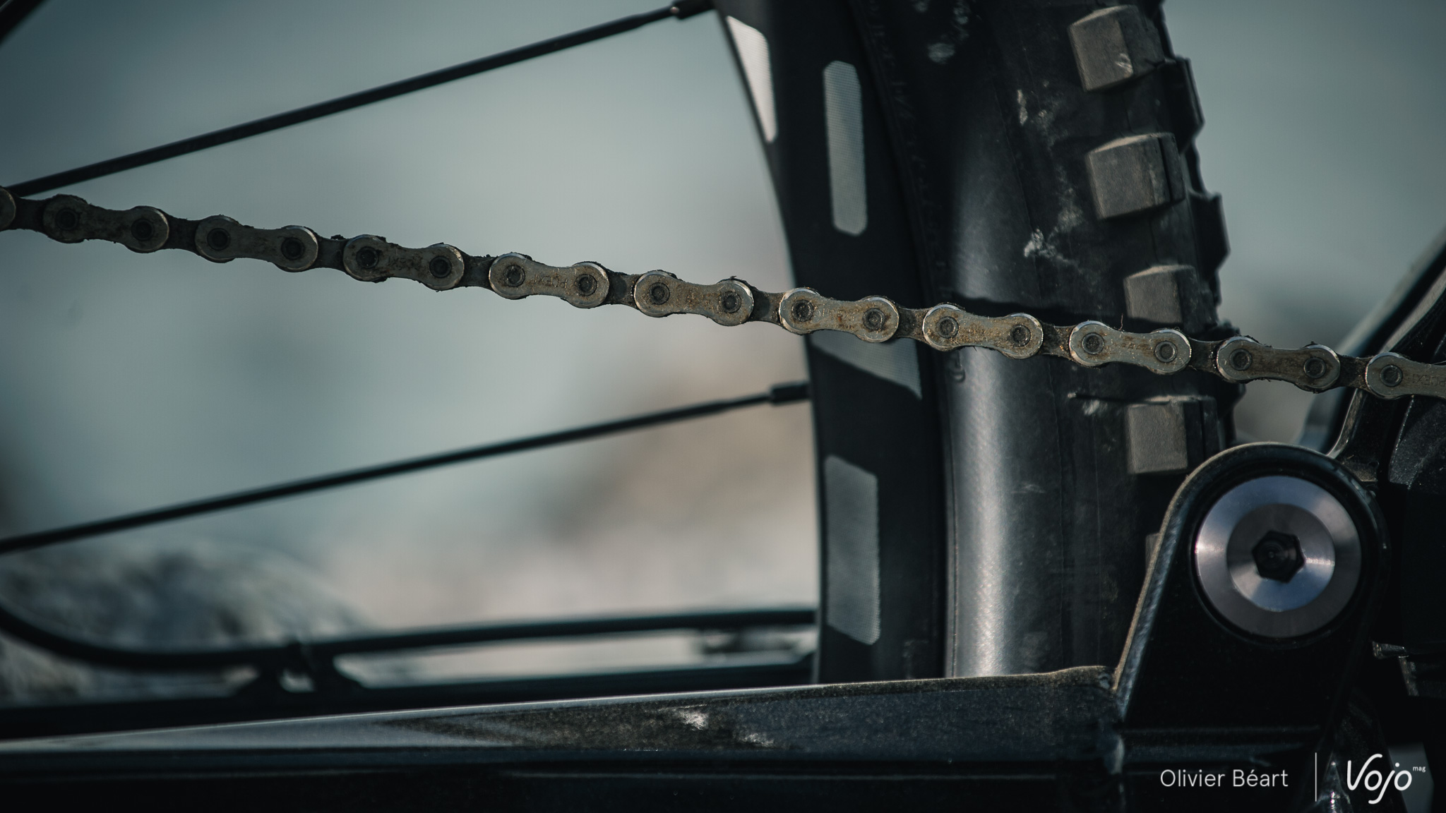 Comme la ligne de chaîne est optimisée, la chaîne Sram EX1 8 vitesses a pu être renforcée et rigidifiée. Elle est aussi légèrement plus large mais, une fois encore, ce n’est pas là la différence fondamentale.