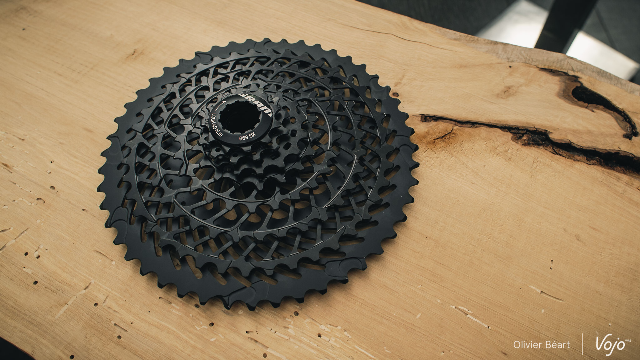 Les dents de chaque pignon ont également fait l’objet de toutes les attentions et d’un développement spécifique pour assurer un passage sûr, rapide et non traumatisant d’un pignon à l’autre lors des changements de rapports. C’est la technologie baptisée E-Block par Sram : sur la cassette Sram EX1, chaque maillon de la chaîne a une position bien définie sur les pignons qui alternent des dents plus épaisses et plus fines pour accueillir les maillons externes et internes de la chaîne. C’est, en quelque sorte, une version adaptée à la cassette du désormais célèbre principe narrow-wide apparu avec les plateaux du groupe XX1. Les rampes de passage d’un pignon à l’autre ont aussi été redessinées pour assurer un passage des vitesses souple et silencieux même à pleine charge des jambes et du moteur.