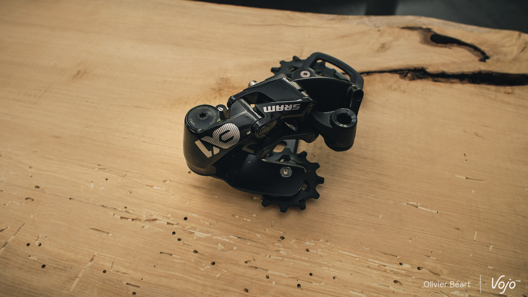 Le dérailleur Sram EX1 reste proche des dérailleurs X-Horizon des groupes classiques que nous connaissons, et des GX/X1 en particulier. Il se déplace horizontalement comme eux, dispose aussi du cage lock pour limiter les mouvements de la chaîne, ainsi que d’un galet inférieur à 12 dents narrow-wide.