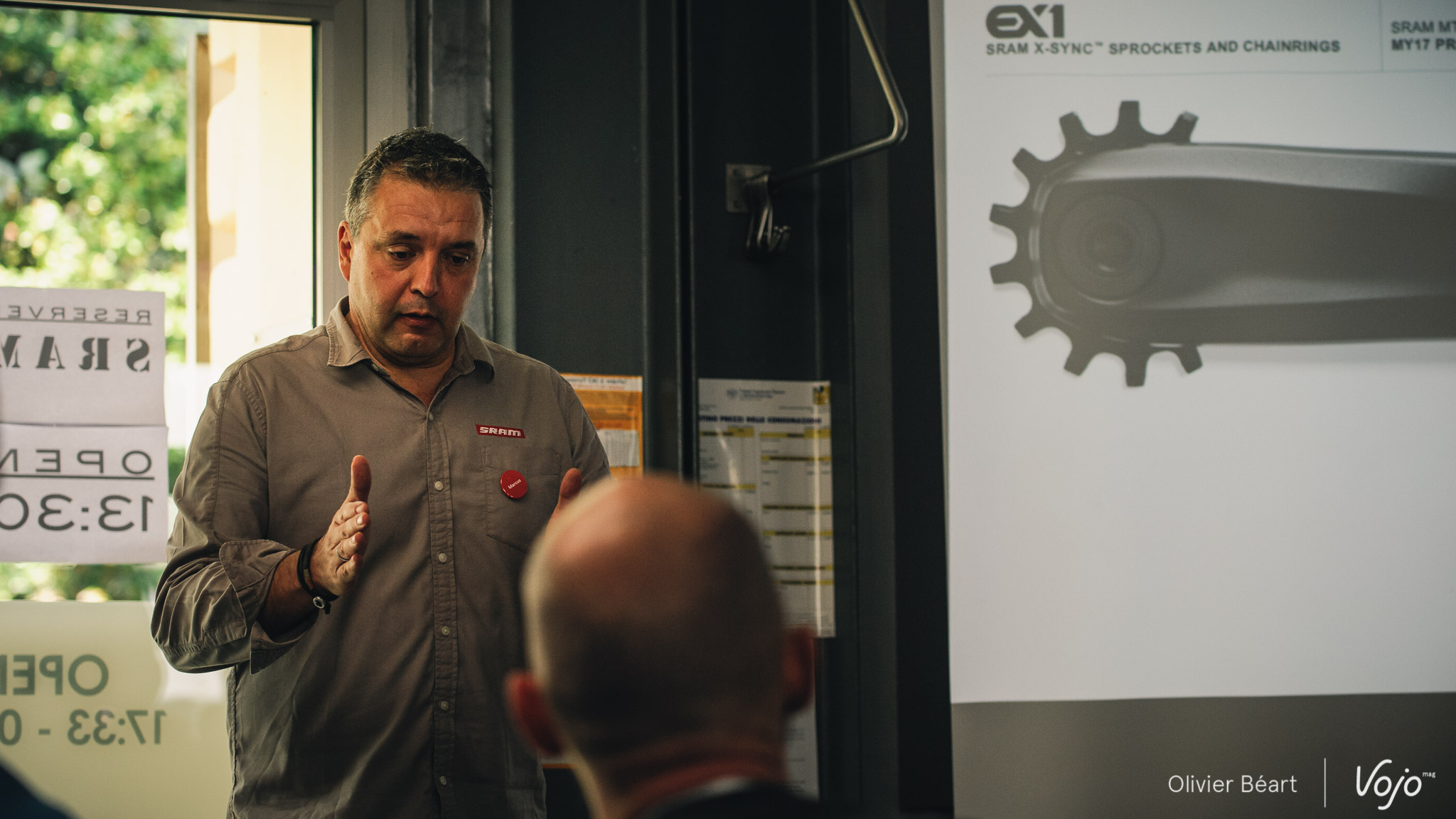 Pour développer son groupe Sram EX1, la marque a d’abord cherché à bien identifier les problèmes rencontrés avec les utilisateurs d’e-bikes équipés de transmissions classiques. Comme nous l’explique Marcus Schneider, le product manager e-bike de Sram : « Arrivent en tête du classement les casses de chaîne et l’usure des pignons de la cassette. Pour y remédier, Sram est parti sur une transmission 8 vitesses, non pas pour élargir les pignons et la chaîne comme on pourrait le penser, mais pour garder une meilleure ligne de chaîne tout en ne permettant qu’un changement de rapport à la fois. »