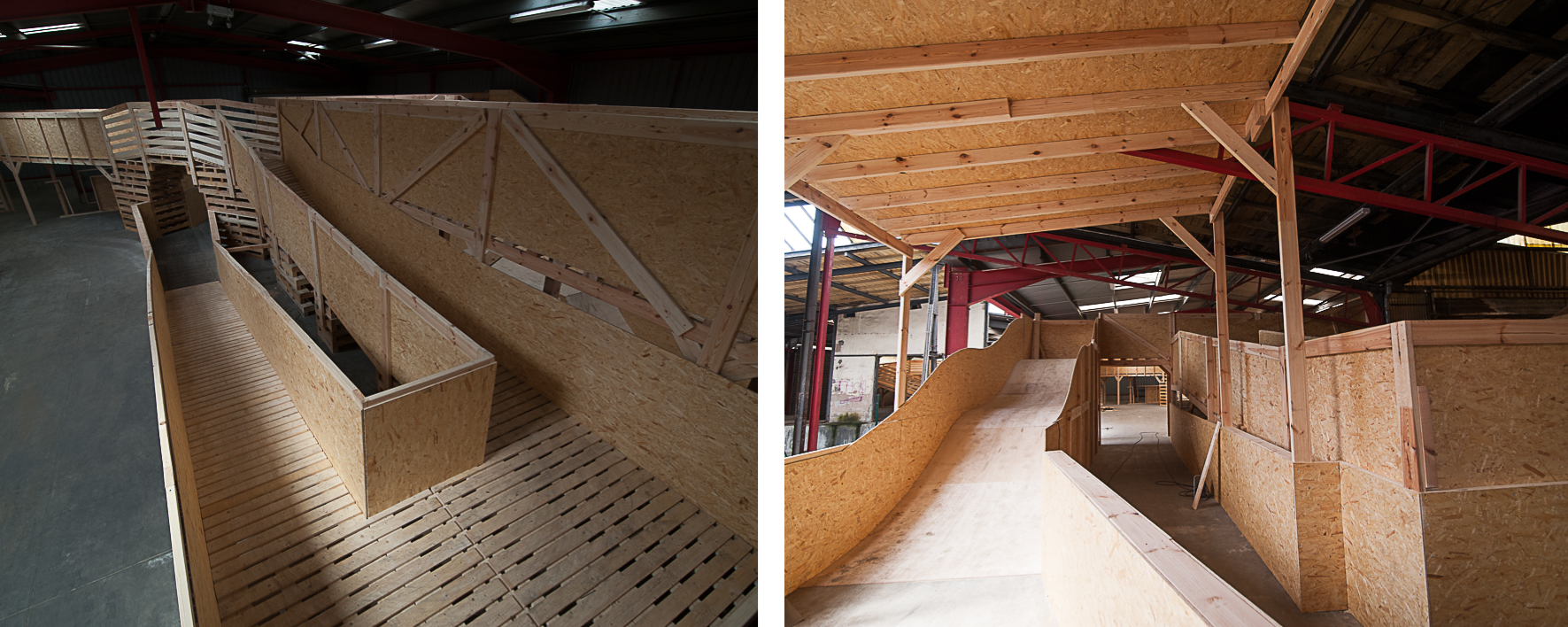 Du côté du circuit de cross-country, l’équipe de Stride a abattu un travail de titan. Des ponts et des passages filent dans tous les sens et cet ancien hall de fret de la SNCF devient un vrai labyrinthe. On grimpe, on glisse, on saute, on se penche et surtout, on fait du sport !