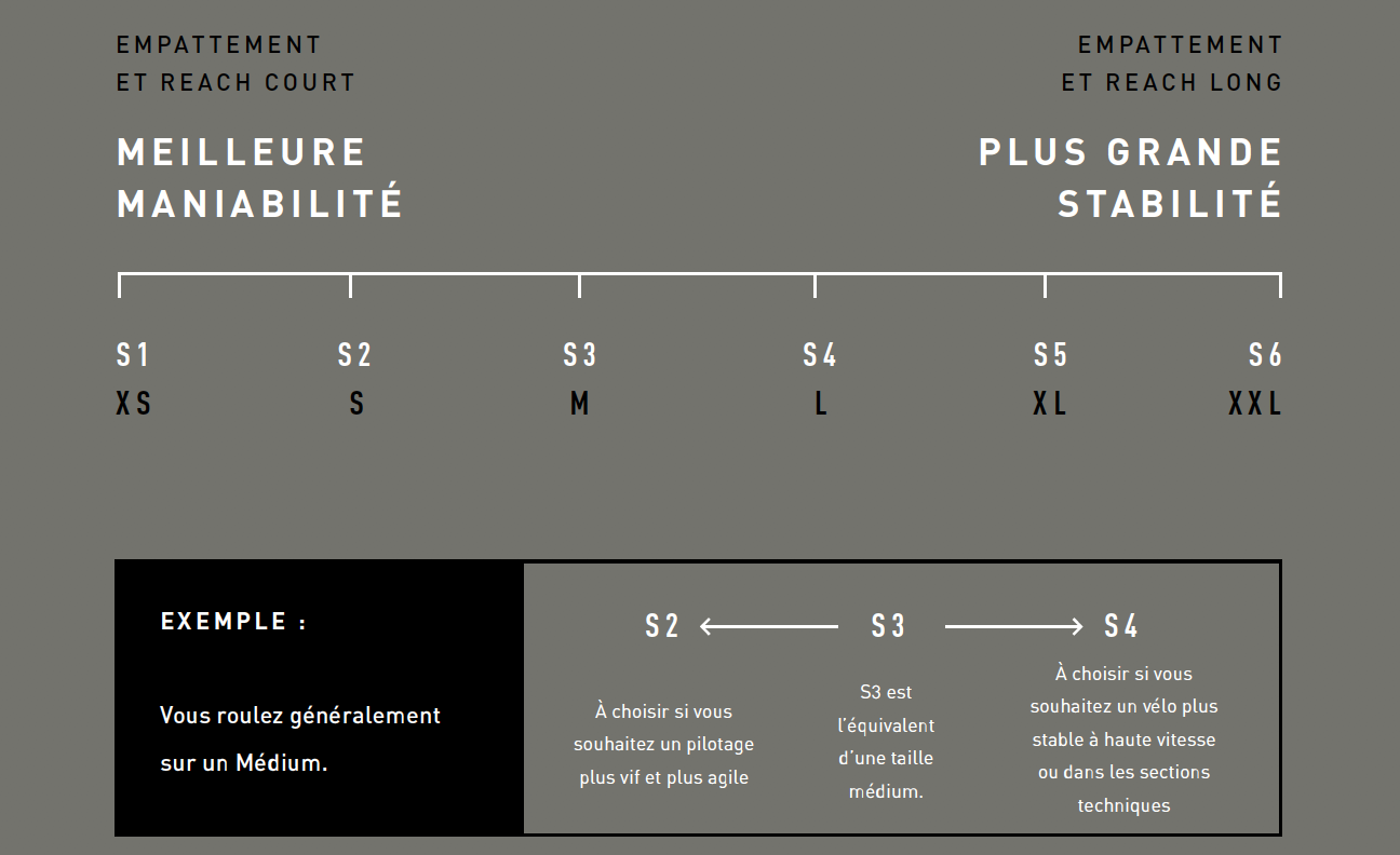 Alors qu’il n’y avait que deux tailles au début quand le Stumpjumper Evo est sorti, il y en a maintenant 6 sur cette nouvelle version. Et elles répondent toujours aux appellations S1, S2,… jusque S6. L’idée est de ne pas choisir uniquement la taille de son vélo en fonction de sa morphologie, mais aussi de ce qu’on aime comme style de pilotage et de ce qu’on veut pouvoir faire avec sa machine.