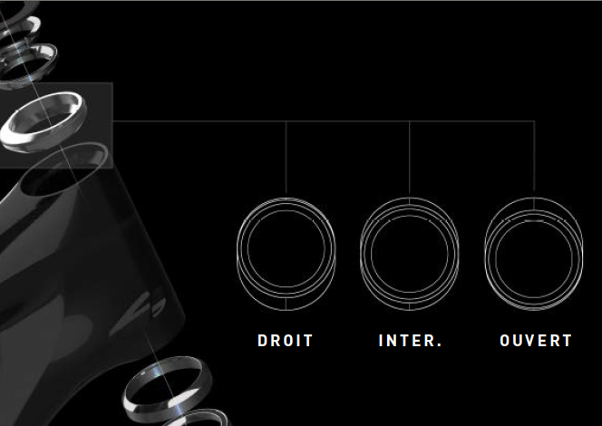 Cela se matérialise par l’adoption de systèmes d’excentrique aux deux extrémités du vélo. Au niveau de la douille de direction, différentes coupelles permettre de régler l’angle de fourche sur trois positions : droit, intermédiaire et ouvert.