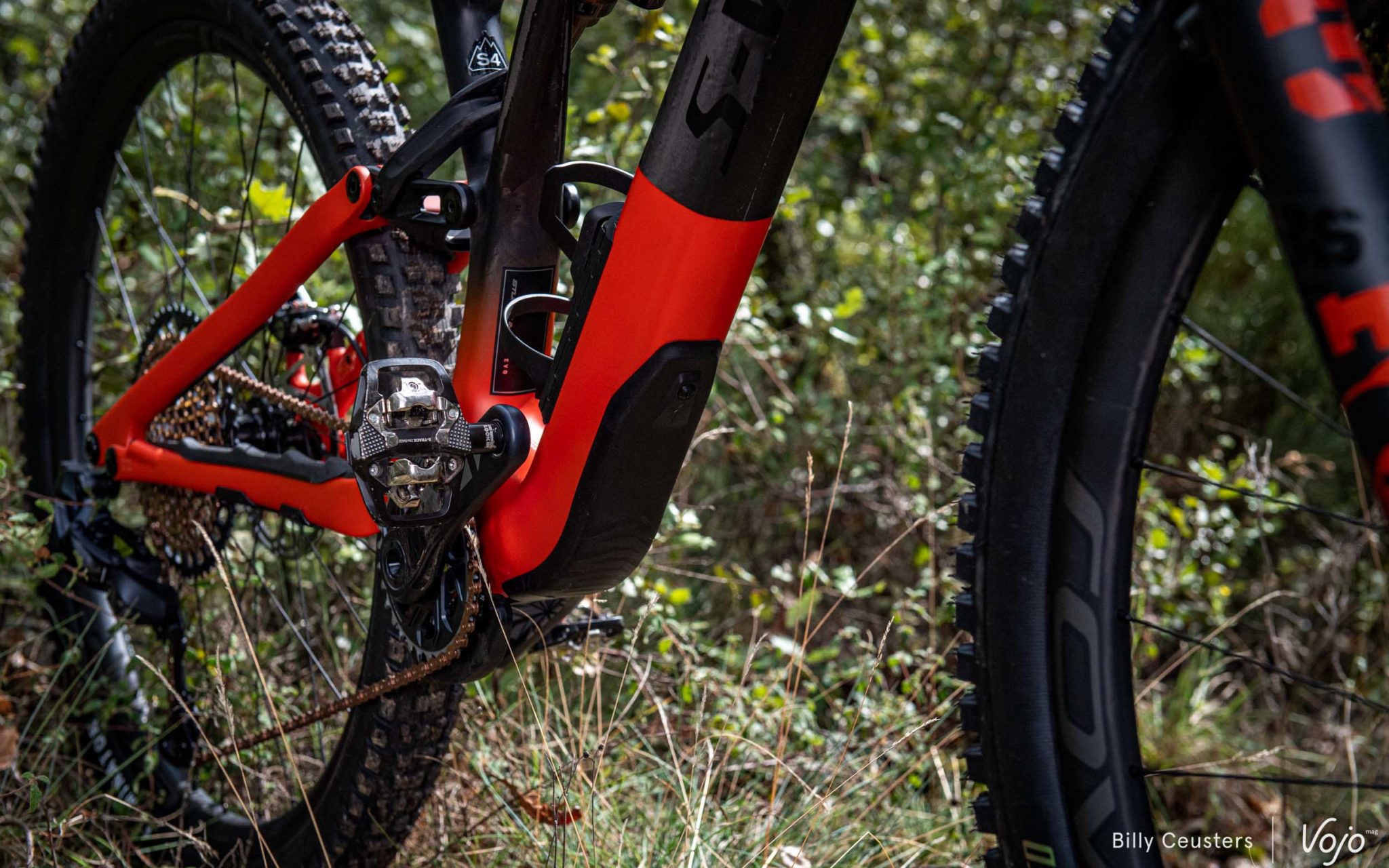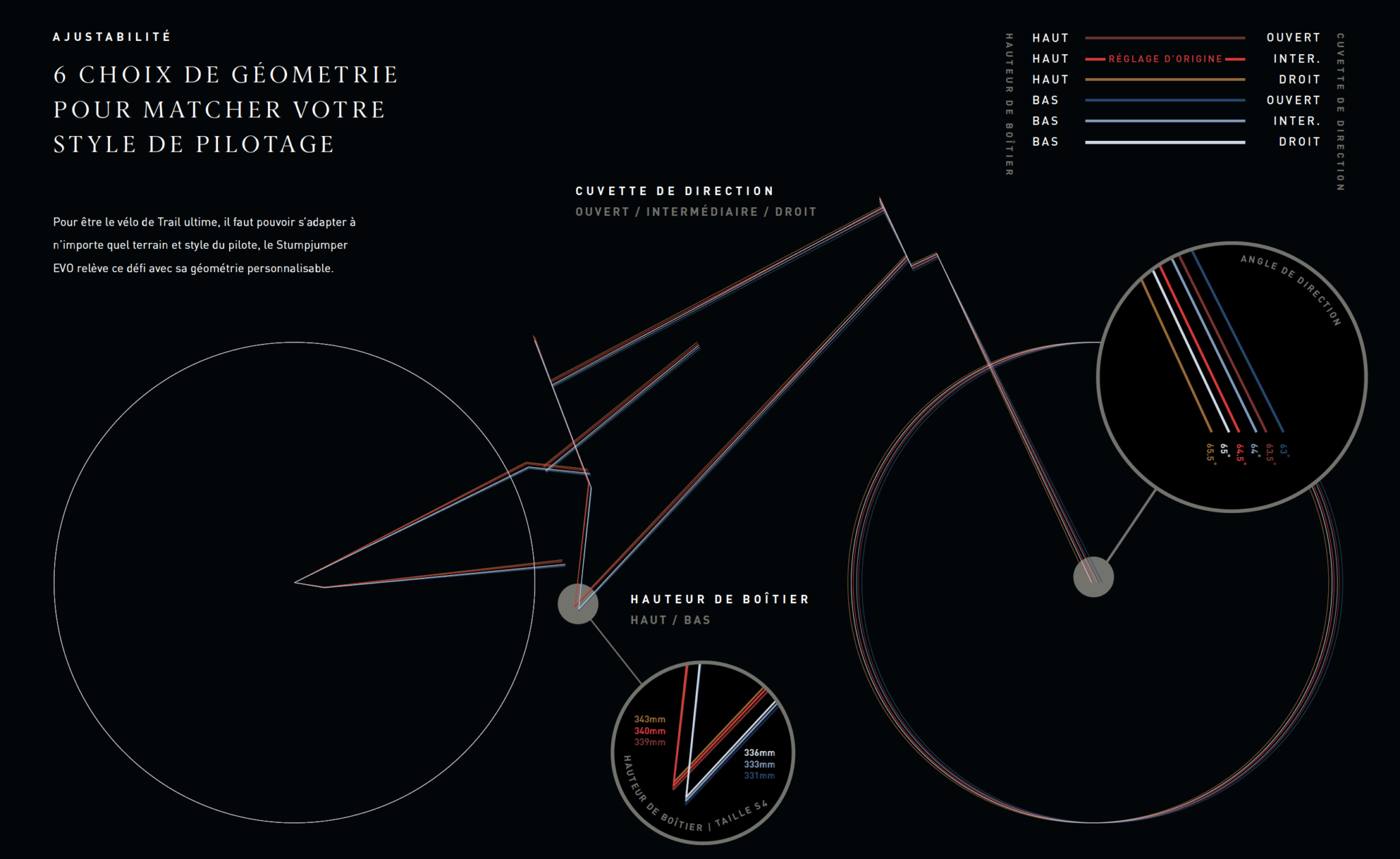 Au total, on dispose de pas moins de 6 combinaisons, permettant de faire varier la hauteur du boîtier de 12mm et l’angle de direction de 63 à 65,5°. L’idée n’est ici pas vraiment de rechercher la performance ultime comme sur une F1 des sentiers. Pour la course, il y a le modèle Enduro. Non, ici, l’idée est vraiment d’avoir un vélo qui peut s’adapter au style de chacun. Un vélo réellement personnalisable ; pas au niveau de la couleur comme cela se voit ailleurs, mais bien au niveau du comportement.