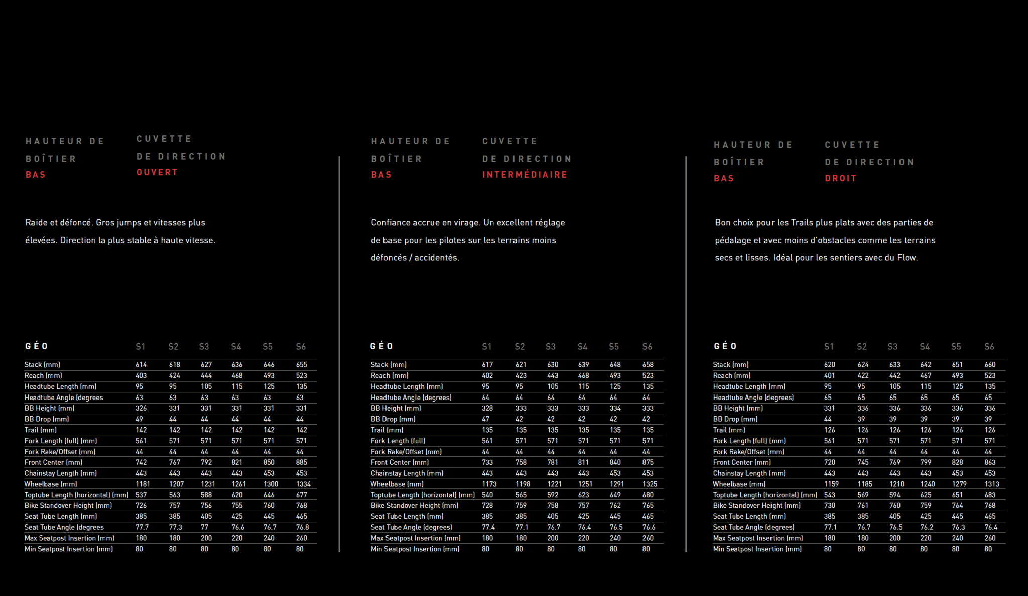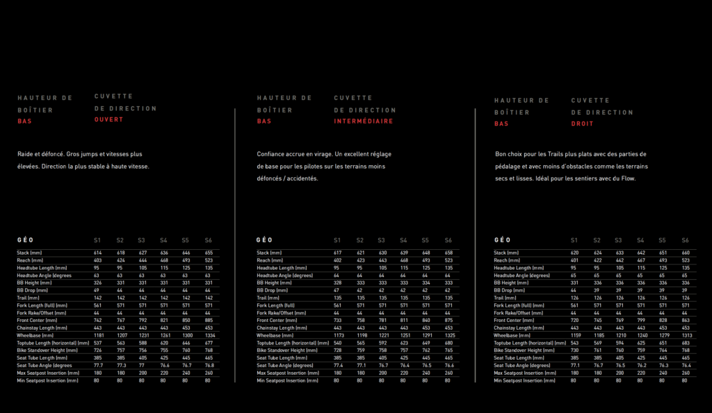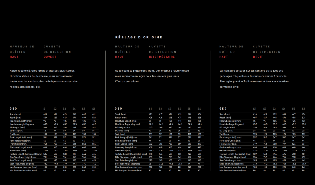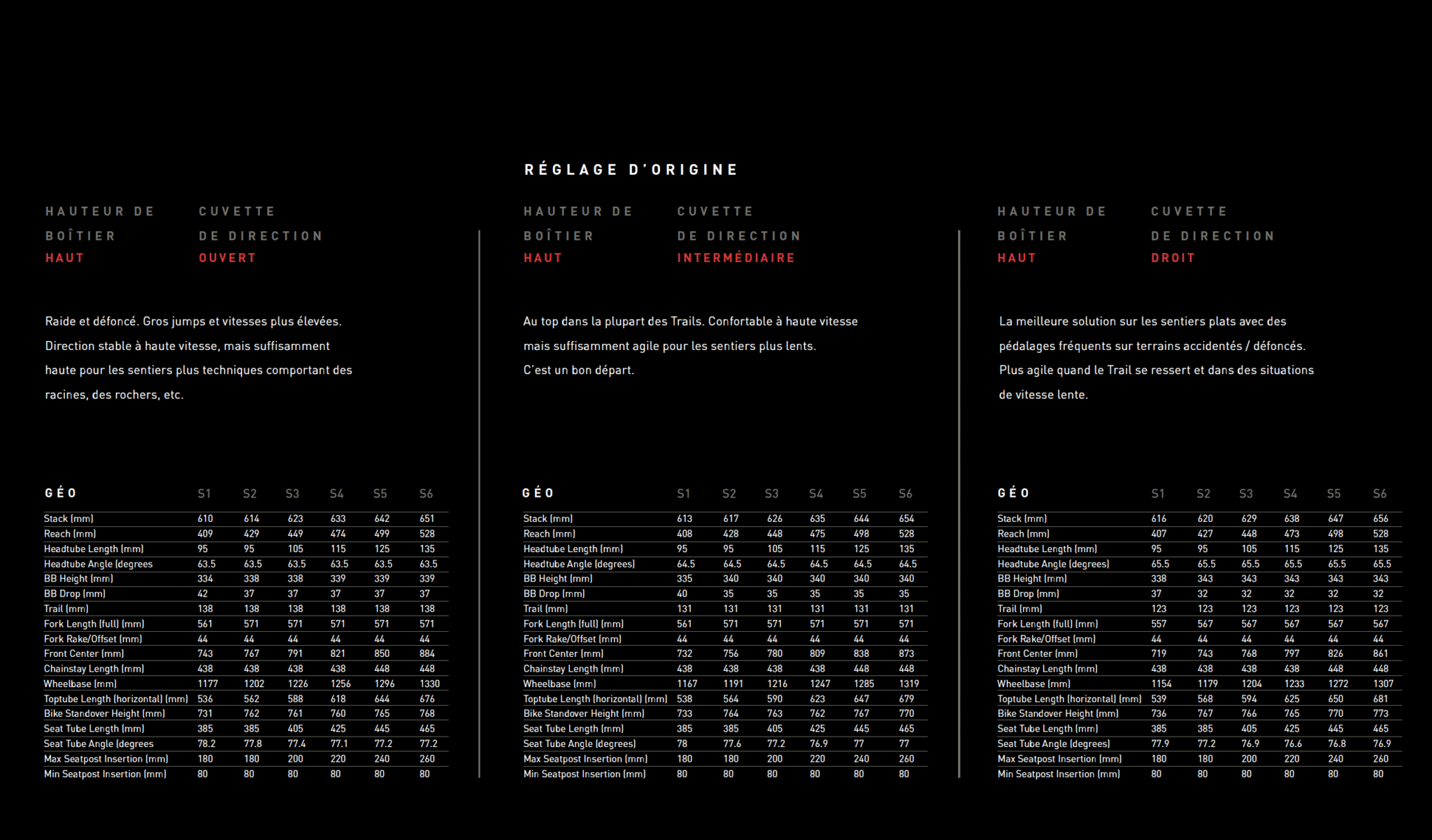 Bon, entre le choix de la taille et les différents réglages possibles ensuite au niveau de la géométrie, il faudra certainement prévoir pas mal de sorties de réglage et de parties de clé Allen avant de trouver le setup qui vous conviendra le mieux. On vous laisse d’ailleurs regarder en détails les… 6 (!) tableaux de géométries selon les réglages choisis (cliquez pour agrandir). Après tout, cela peut aussi faire partie du plaisir de chipoter sur son vélo, de tester différentes configurations et de voir comment évoluent les sensations. Les geeks apprécieront, et ceux qui veulent juste un vélo simple sur lequel grimper et partir rouler se tourneront sans doute vers d’autres modèles de la vaste gamme Specialized.