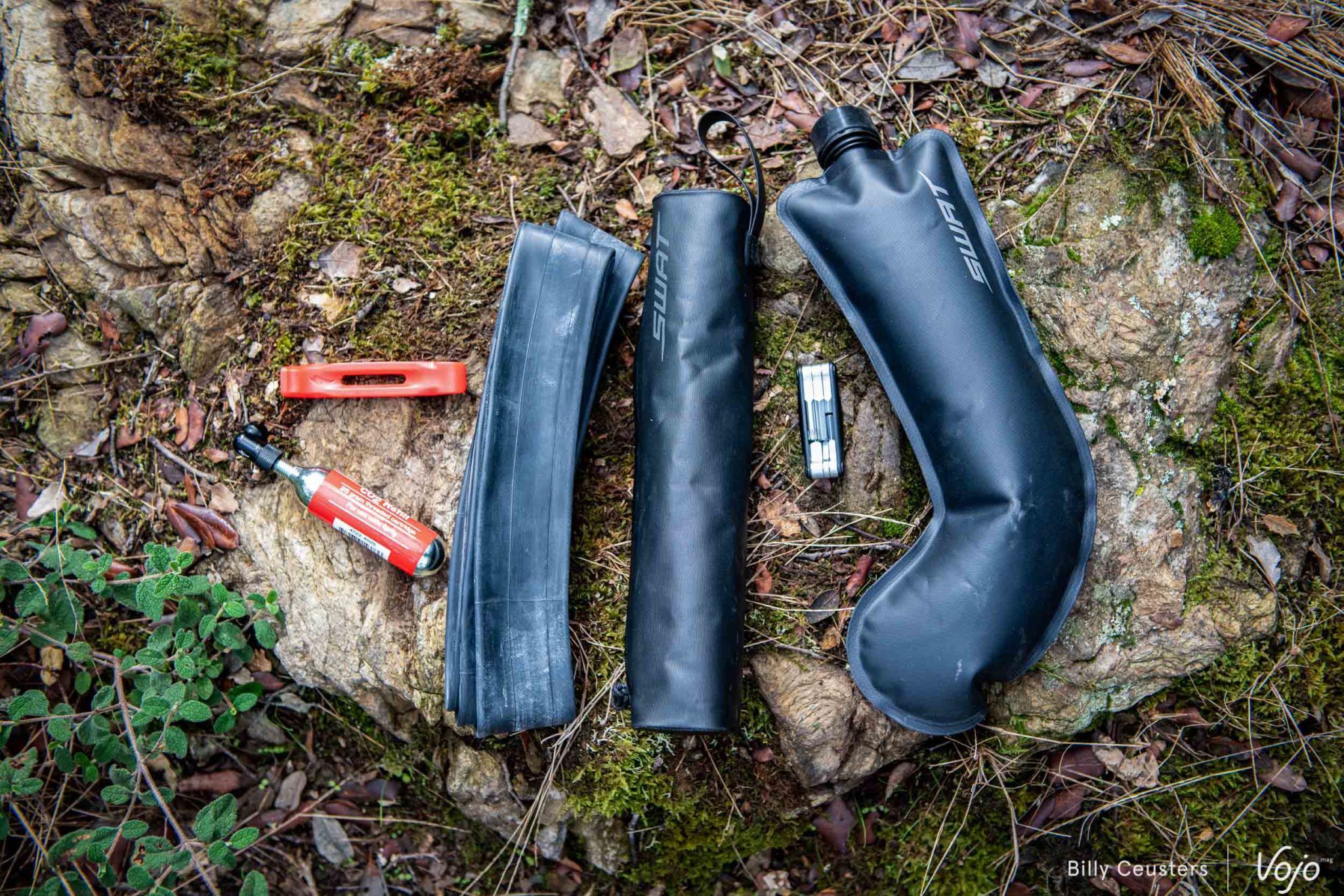 Trêve de plaisanterie, outre le volume, si la nouvelle Swat Door est plus logeable, c’est aussi parce qu’elle peut accueillir un nouveau kit d’accessoires, dont un bidon souple de 650ml qui peut s’insérer jusqu’au boîtier de pédalier grâce à sa forme incurvée ! De quoi, au choix, se passer de porte-bidon si on est prêt à s’arrêter pour boire, ou emporter plus de liquide et pouvoir faire l’appoint de son bidon principal sur les longues sorties. La pochette pour le nécessaire de réparation d’une crevaison est toujours là et le multi-outil se place dans la douille de direction. All inclusive !