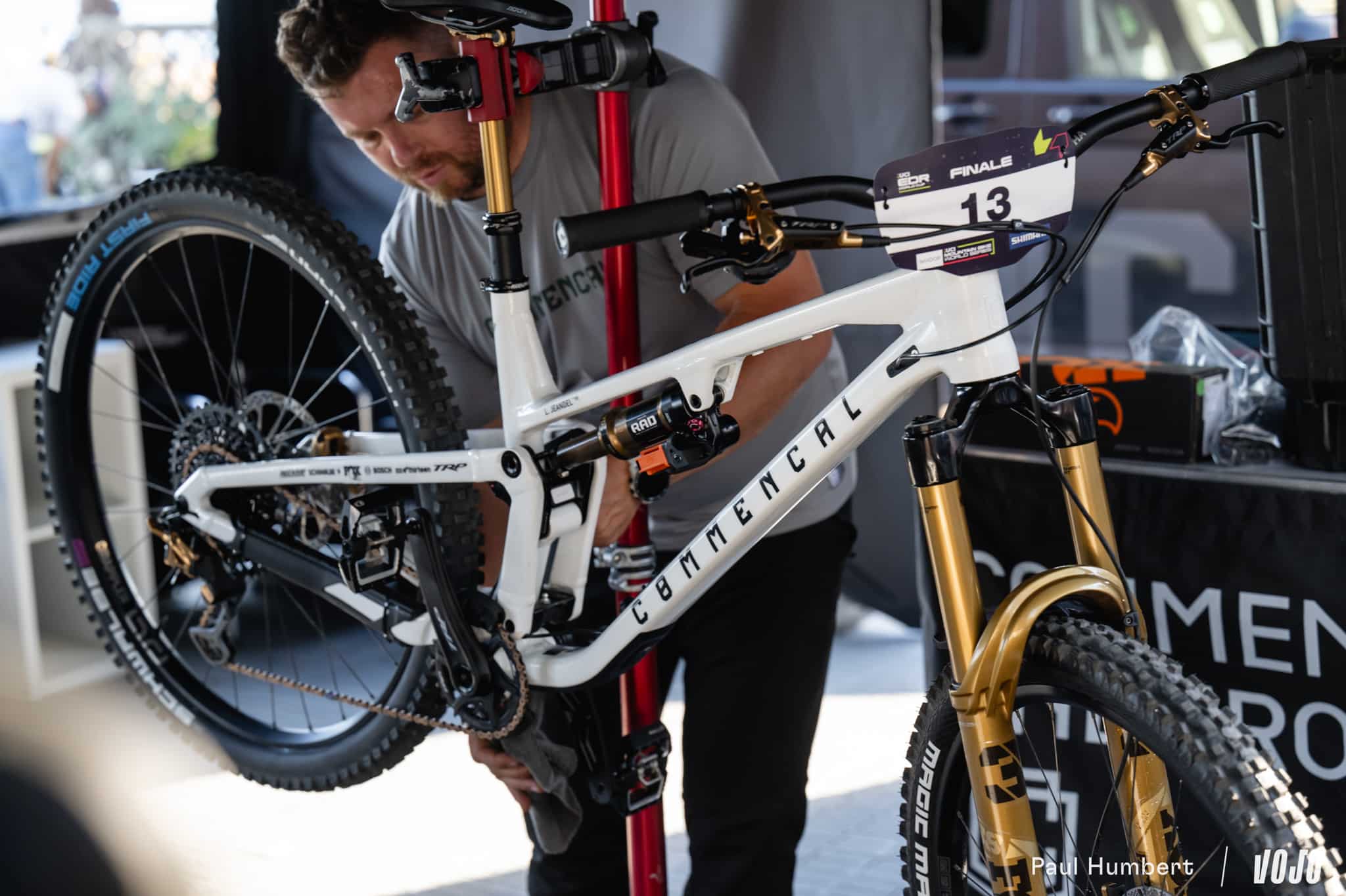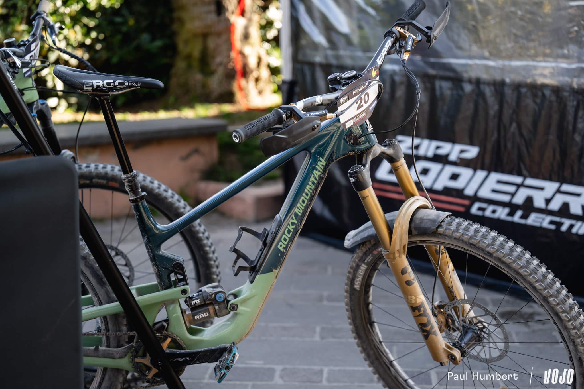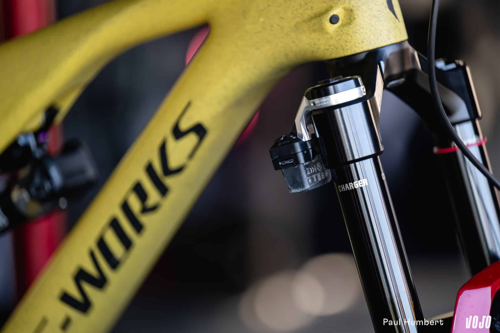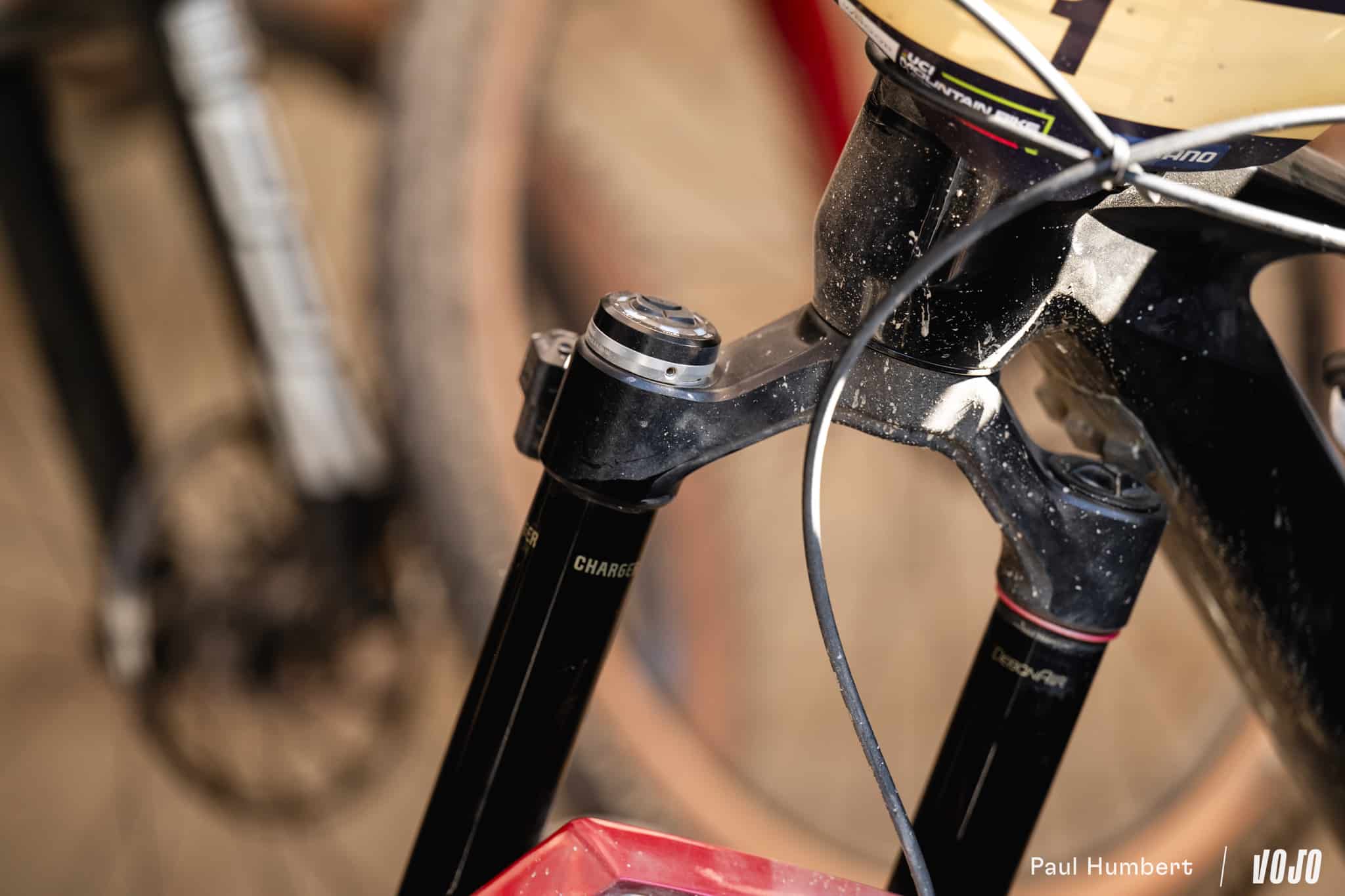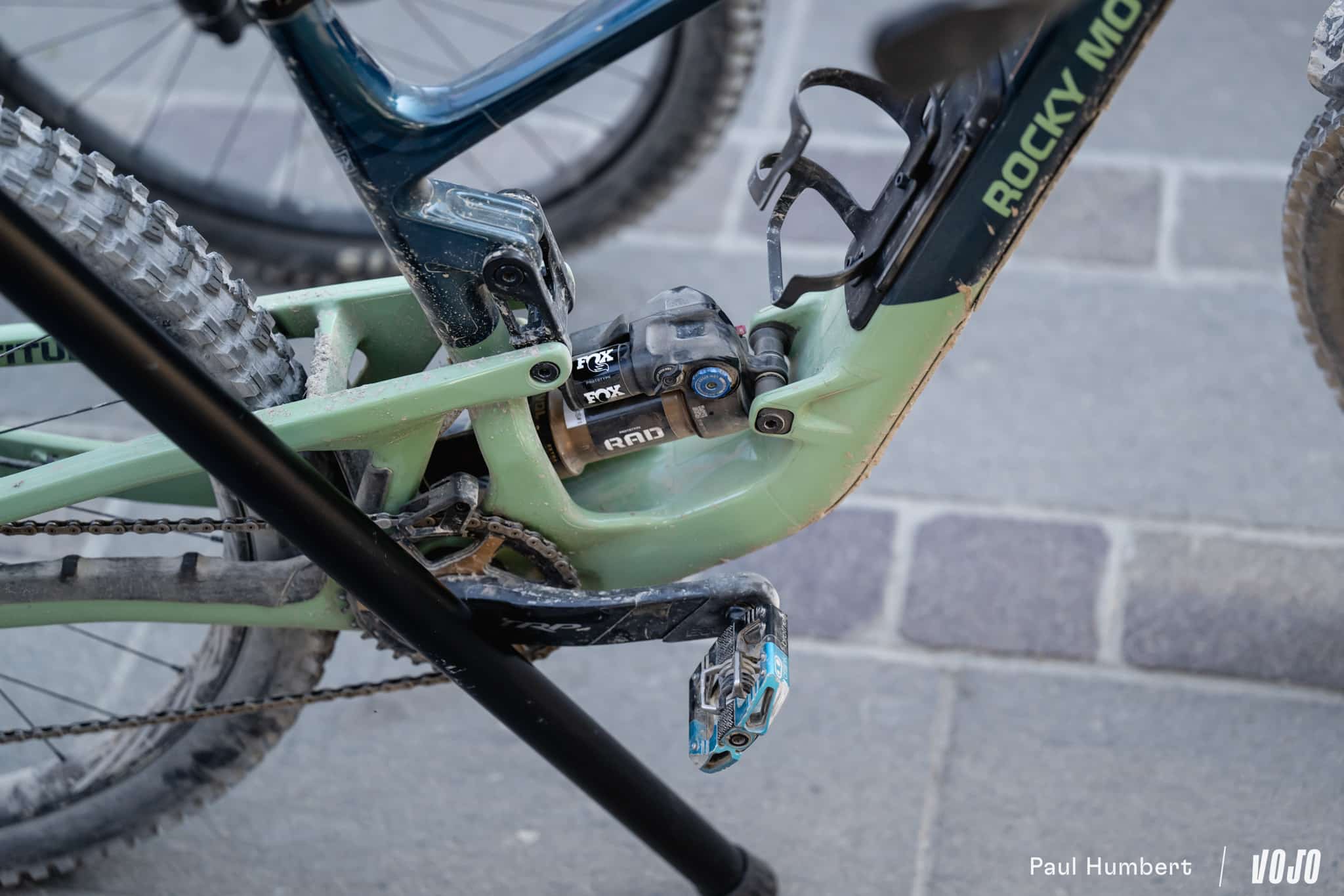 L’électronique toujours, mais chez Fox cette fois-ci ! Juste avant qu’il parte au lavage entre les mains de son mécanicien, on retrouve le vélo de Rémi Gauvin qui semble lui aussi équipé d’un système automatique de pilotage de ses suspensions. On repère un boitier et une batterie sur son amortisseur. Si Fox a ouvert les hostilités, Sram a su répliquer en force ces dernières années, mais la marque au renard semble n’avoir pas dit son dernier mot.