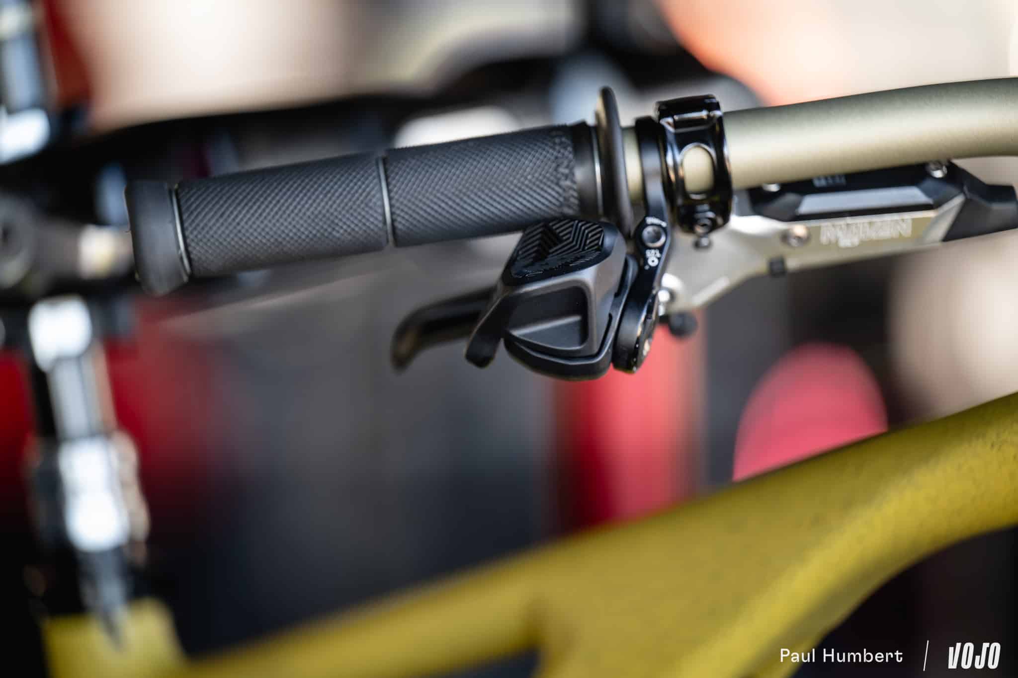 Alors qu’on pensait avoir tout vu sur le vélo d’Estelle Charles chez Specialized, on repère également un nouveau « pod » Sram pour ses commandes AXS. On retrouve la même « plateforme » de la commande, mais avec une interface plus proche de « l’ancienne » commande précédant la gamme T-Type.