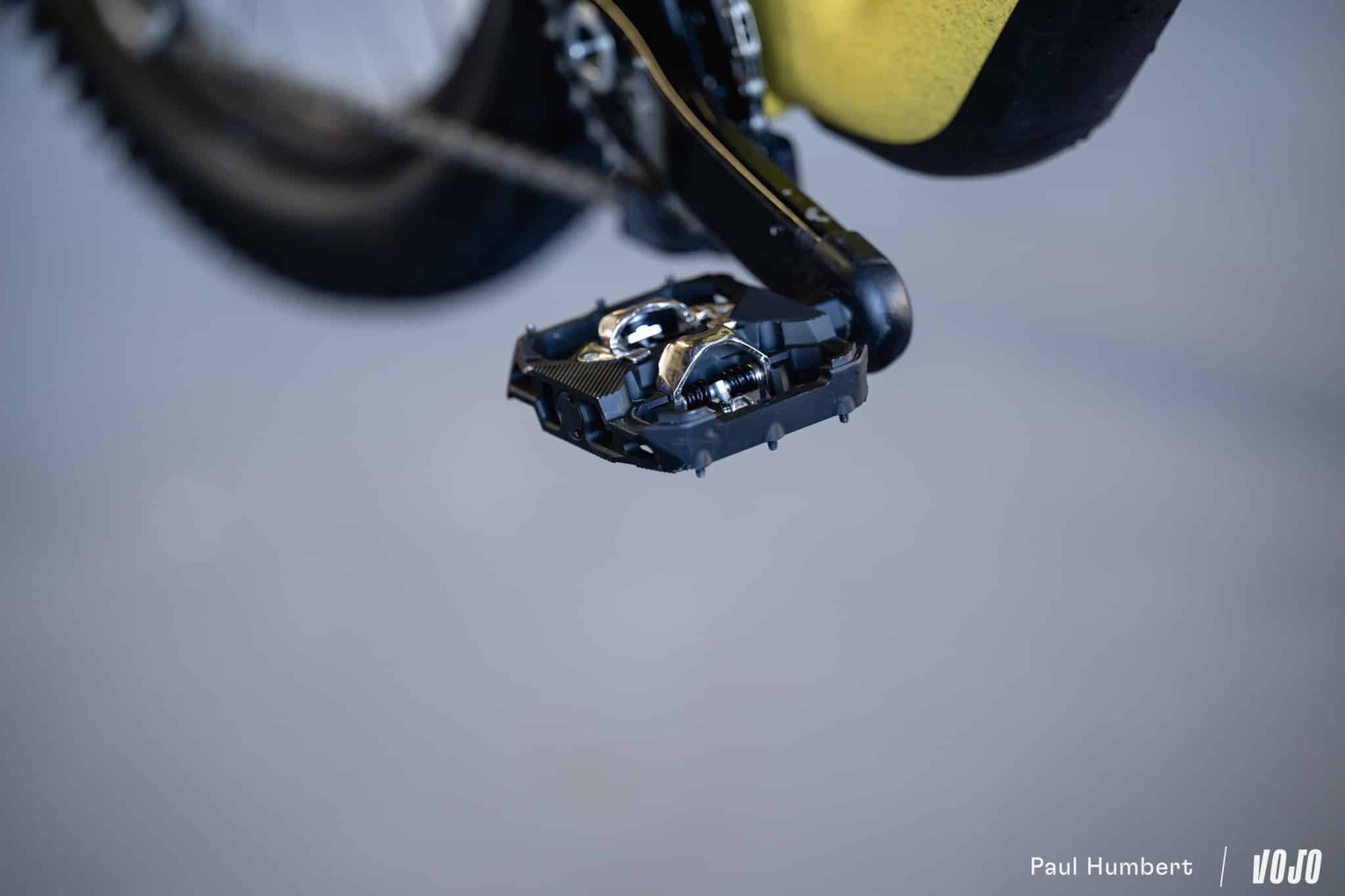 Sur le même vélo, on retrouve un prototype de pédales automatiques Look à grande plateforme. Après la refonte de sa gamme de pédales plates, la marque continue donc son offensive « gravity ».