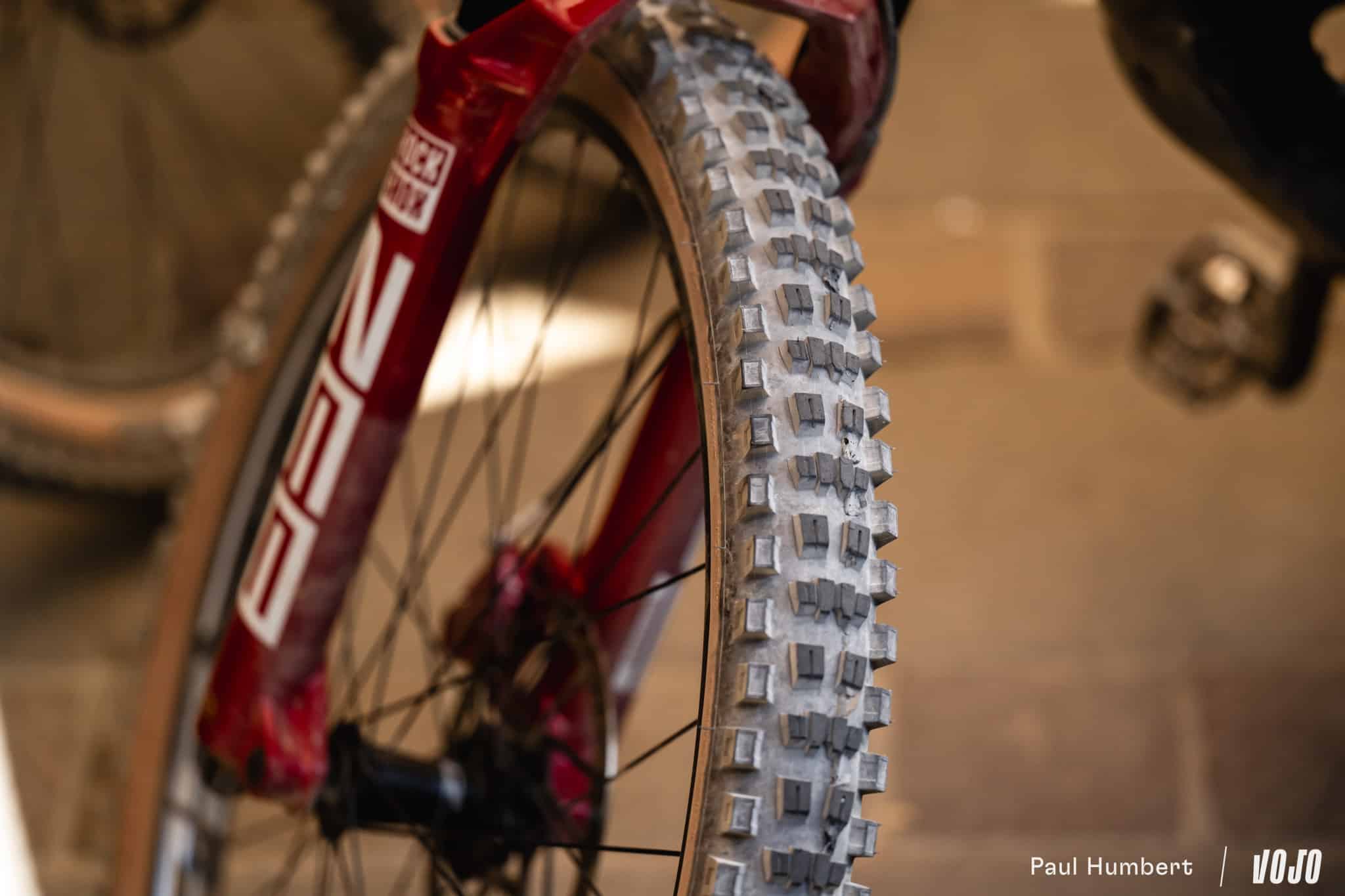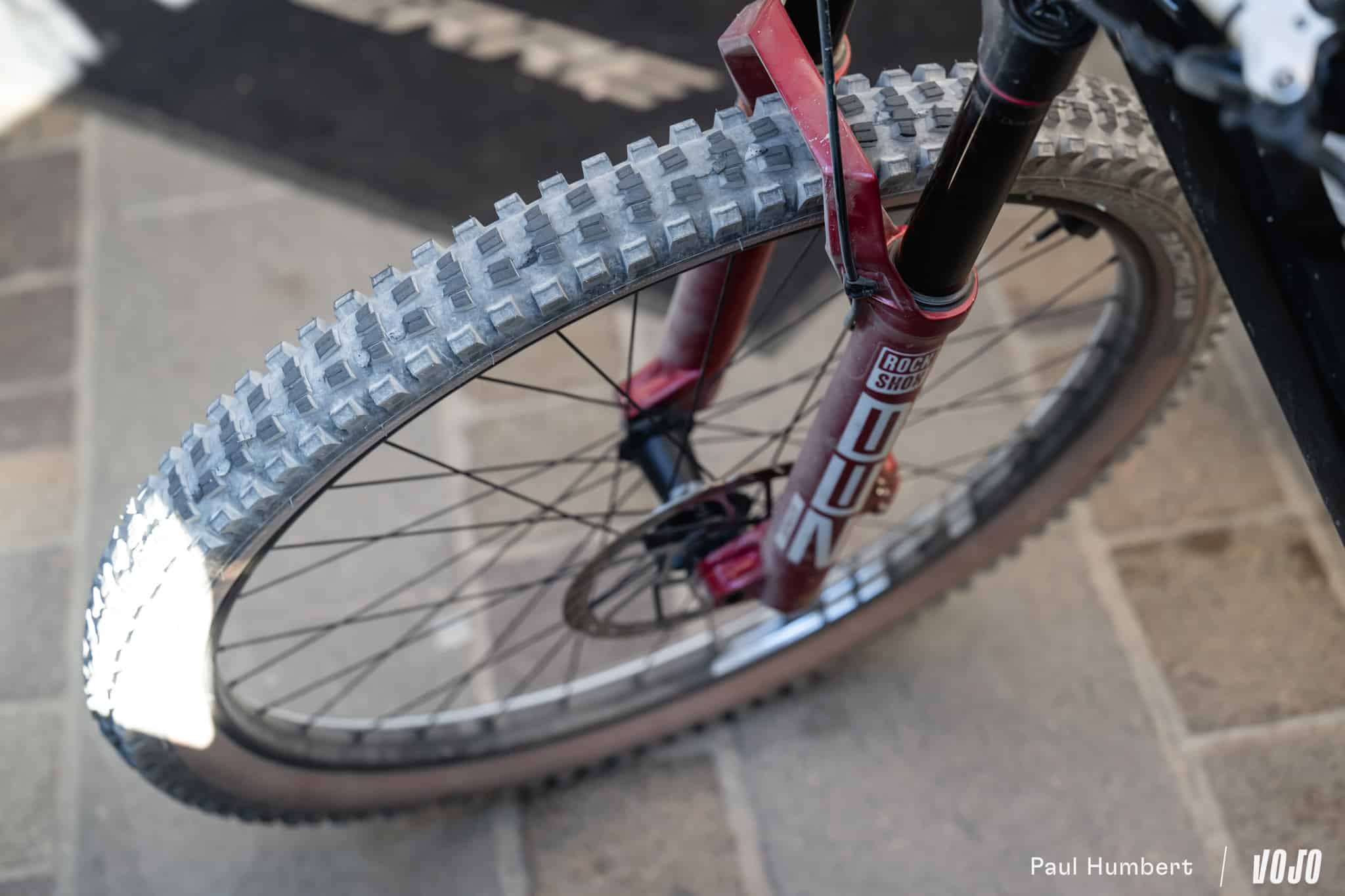 Sur la roue avant, notre oeil est attiré par un prototype de pneu Hutchinson que nous n’avions pas encore vu jusque-là. On connaissait le Toro et le Griffus en enduro, et on découvre ici un dessin plus « chargé » avec des gros crampons latéraux et un enchaînement de 3 puis 2 crampons sur la bande centrale. Ça vous rappelle des concurrents ?