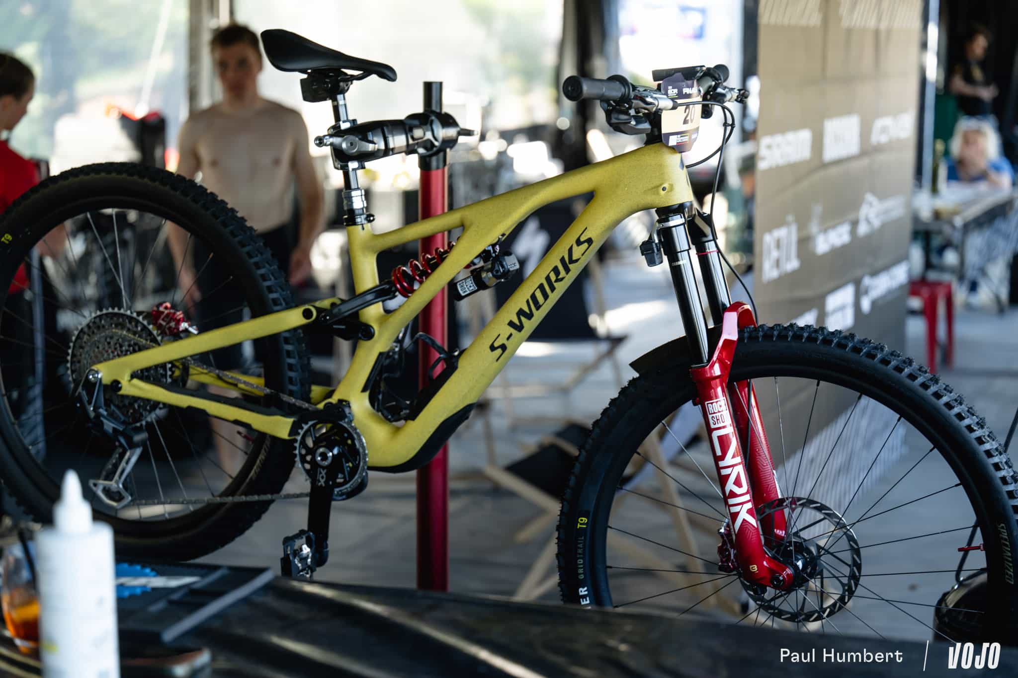Dans les paddocks, on se faufile d’abord sur le stand Specialized qui est représenté en nombre sur les deux courses. Point commun à presque tous les vélos, ils sont équipés par les suspensions Flight Attendant pilotées électroniquement. Depuis le lancement de la dernière génération en XC, le système est décliné sur tous les segments de la marque. En descente à Fort William et en enduro avec la Zeb et la Lyrik, mais également sur un amortisseur à ressort, peut-être un futur Vivid Coil.