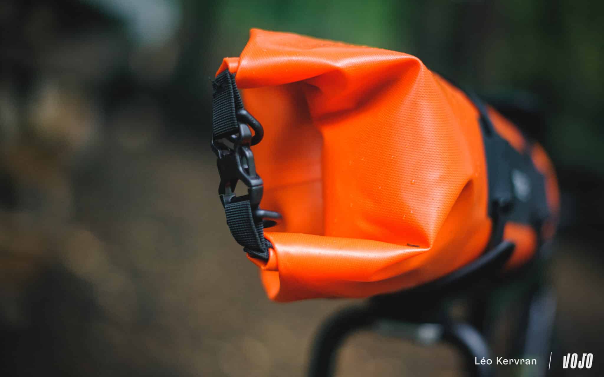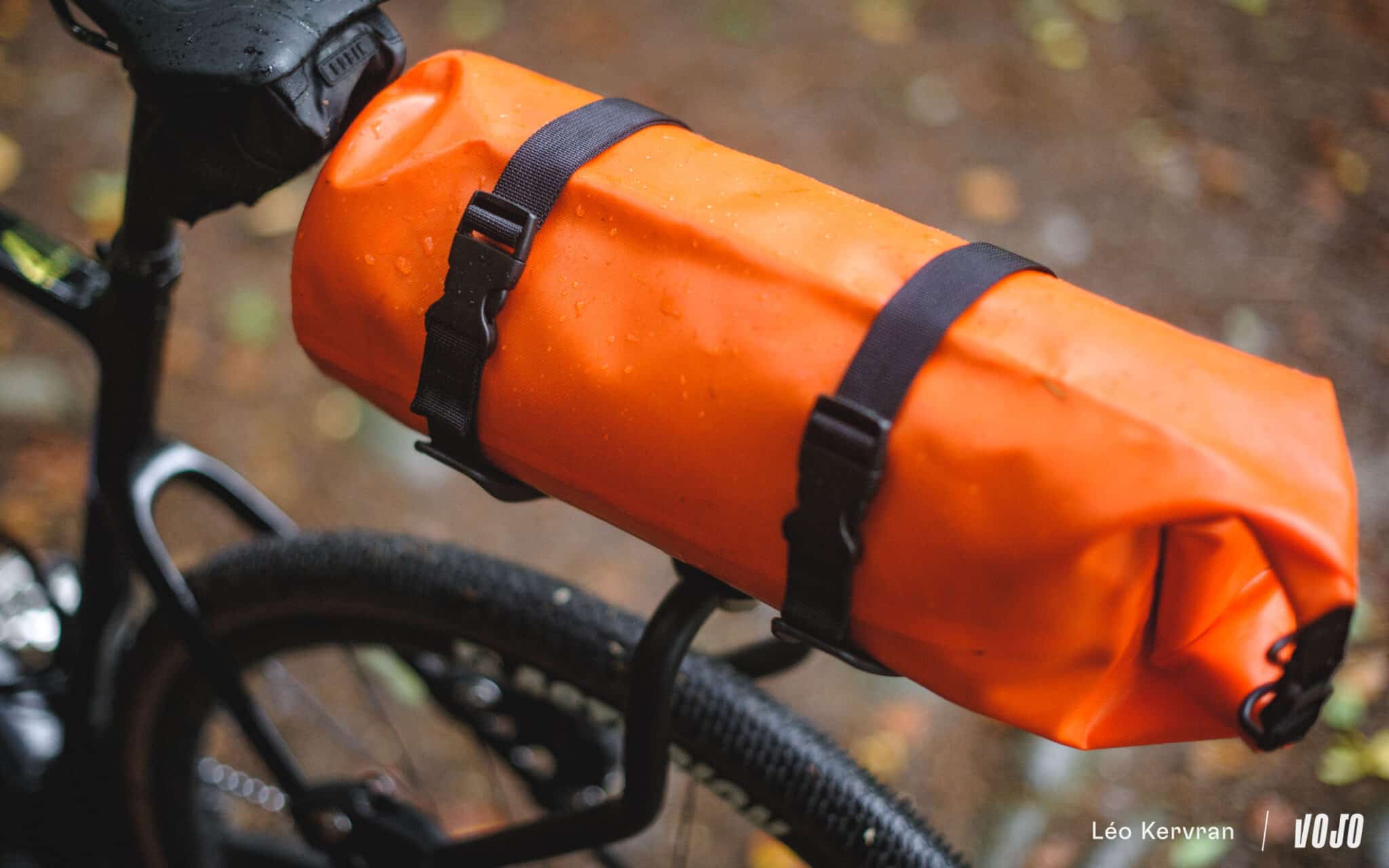 Que ce soit avec le sac étanche de 8 L — dont on apprécie la couleur orange bien visible, un plus pour la sécurité — ou d’autres sacs, la charge reste bien stable sur le berceau. Les sangles permettent de sécuriser correctement ce que l’on emporte tout en restant faciles à utiliser grâce à leurs clips et la possibilité de les faire coulisser dans le berceau pour les serrer au mieux.