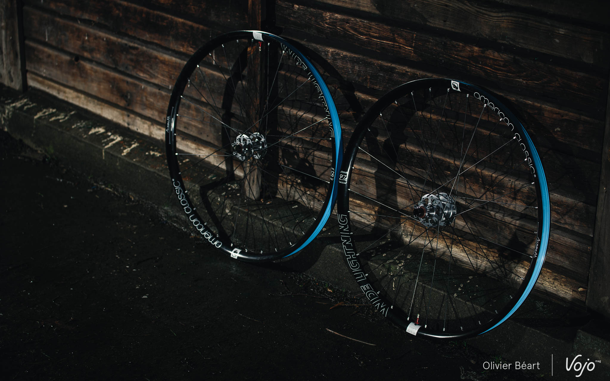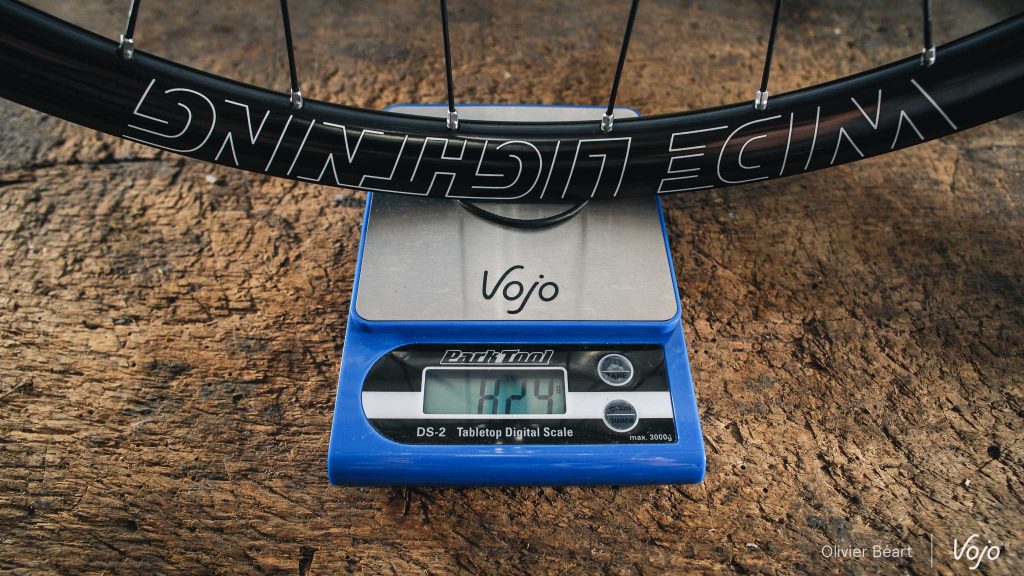 Parlons du poids justement : si nous n’avons pas connaissance de la masse de la jante seule (non disponibles seules, soit dit en passant), les roues dans leur ensemble se montrent particulièrement légères. Avec 698g (en 15x100mm) devant et 824g (en 148x12mm) pour l’arrière, soit 1532g la paire en 27,5″, on est sur des scores particulièrement bas. A titre d’exemple, c’est 150g de moins que les dernières NoTubes Arch Mk3 et 70g de moins que les Bravo carbone !