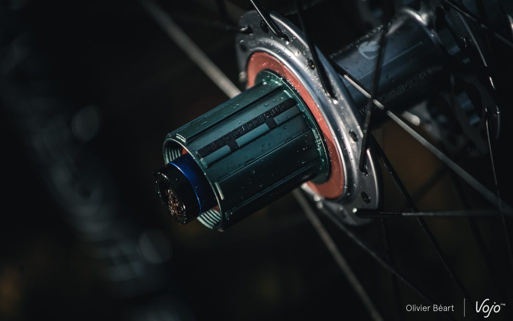 La finition des moyeux est très belle, et on remarque un détail intéressant sur le corps de roue-libre Shimano : celui-ci est doté de renforts en acier sur la tranche des cannelures afin que la cassette ne marque pas les parties en aluminium à la longue. Les roulements sont aussi nettement mieux protégés que par le passé (il s’agissait d’un des points faibles des premières versions) et ils existent dans presque toutes les versions possibles.