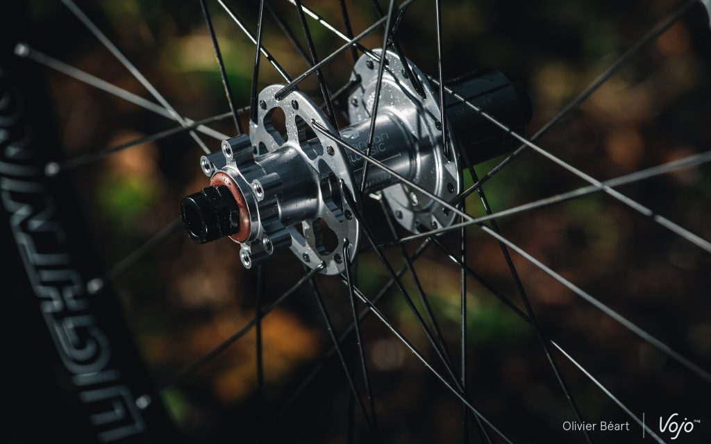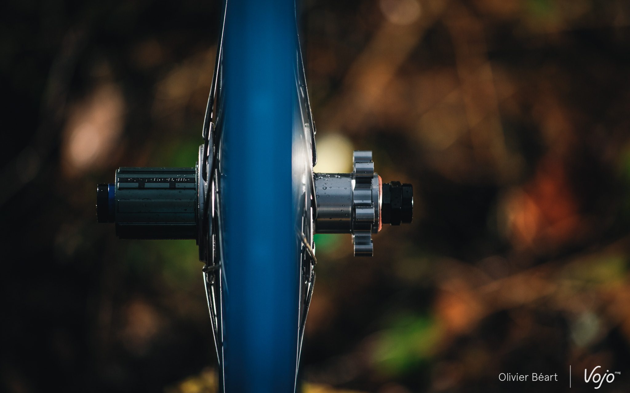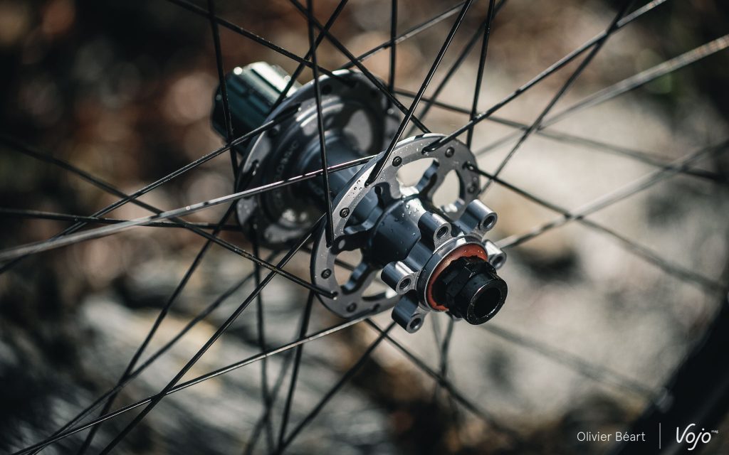 Ce score, on ne le doit pas qu’aux jantes. Les moyeux ne sont pas en reste, avec des poids annoncés de 116g devant et 225g pour l’arrière ! Leur design global n’a pas changé depuis des années, avec des flasques hautes, rapprochées et parfaitement symétriques qui permettent d’avoir des rayons de même longueur de chaque côté et d’homogénéiser les tensions.