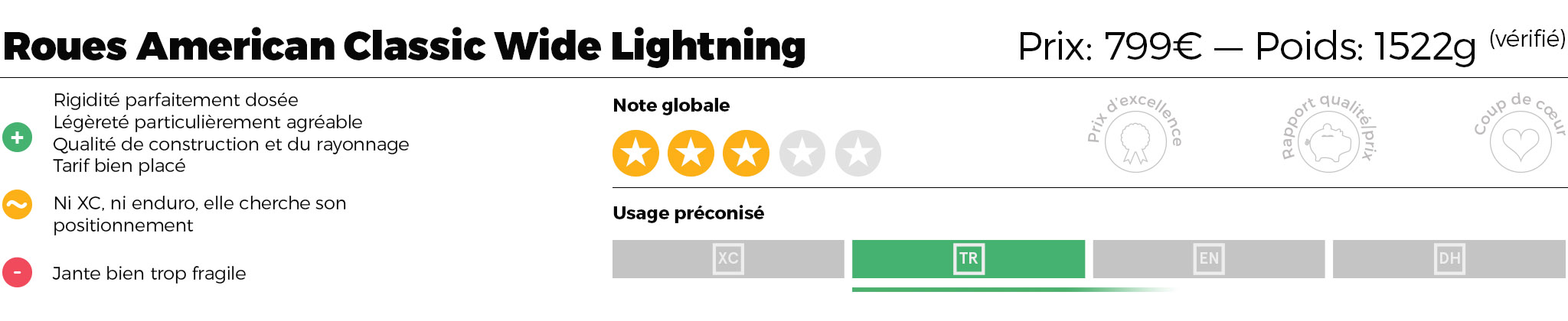 Les American Classic sont des roues légères mais, avec leur jante large ainsi que leur comportement très valorisant dans le cassant, on a tendance à l’oublier. Un peu comme avec les RAR Tempo testées il y a quelques mois, l’addition tombe hélas très vite et la jante ne résiste pas bien longtemps. C’est dommage car c’est clairement dans le cadre d’un usage all-mountain très varié, voire enduro, que les Wide Lightning nous ont semblé les plus pertinentes. Au contraire du XC où, pour nous, une jante aussi large n’a pas de réelle valeur ajoutée. Il nous semble donc qu’American Classic devrait revoir le positionnement de ce produit en renforçant la jante, ce qui permettrait à la marque de proposer de vraies roues adaptées à un programme enduro. Car, aussi étonnant que cela puisse paraître et malgré le fait que la marque sponsorise Cécile Ravanel (qui développe des prototypes en EWS), la marque ne dispose d’aucun produit spécifique pour ce segment. On prendrait un peu de poids mais, même à plus de 1600g, elles resteraient parmi les plus légères du marché. Cela permettrait enfin de profiter de leurs autres grandes qualités sans arrière pensée et elles pourraient prétendre sans mal à un score de 5 étoiles dans nos tests. D’autant que leur tarif est très raisonnable.