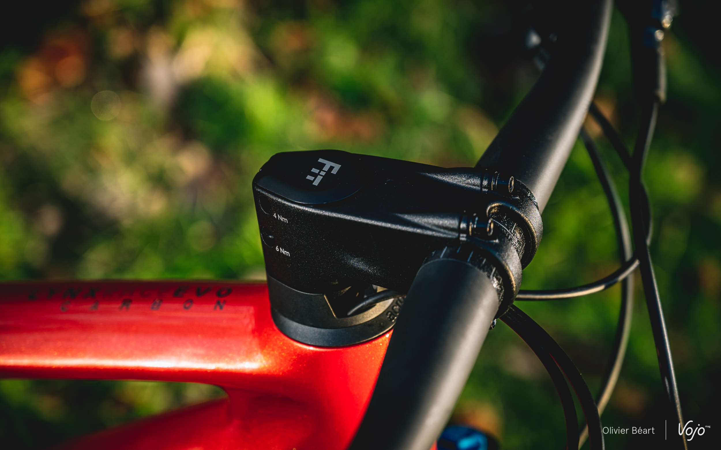 Enfin, on termine par les périphériques. Au niveau du poste de pilotage, outre la très belle potence spécifique dont nous avons déjà parlé, on trouve un cintre en carbone « Evo », la marque d’accessoires maison, de fort belle facture. La tige de selle rigide en carbone est aussi siglée Evo sur le modèle XC, alors qu’on trouve une excellente tige de selle télescopique BikeYoke Divine SL sur le modèle LT. Elle est aussi disponible en option sur les montages XC et nous vous la recommandons franchement ! Très légère (à moins de 400g, c’est tout simplement la plus légère du marché), elle offre 80mm de débattement et un fonctionnement parfait. Elle permet de vraiment exploiter le potentiel du vélo en descente (voir ici notre test complet).