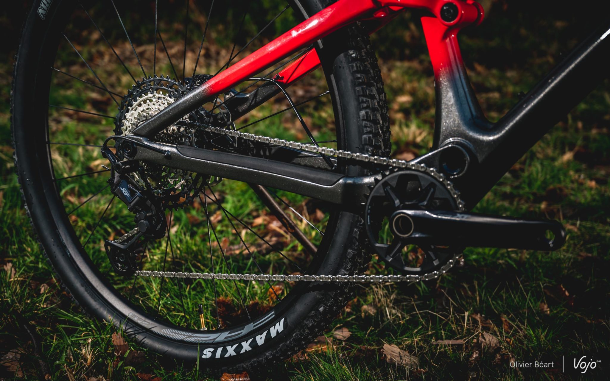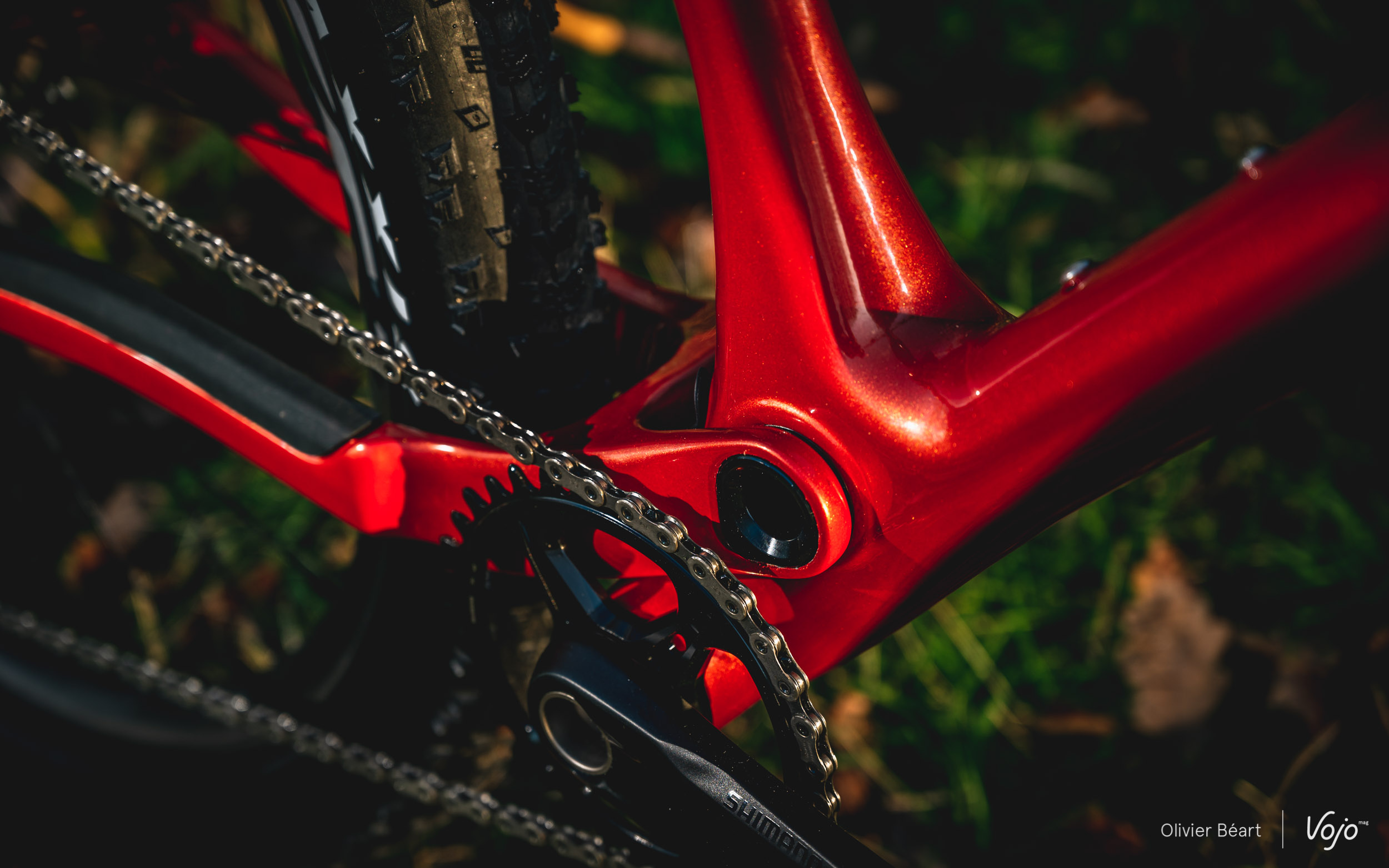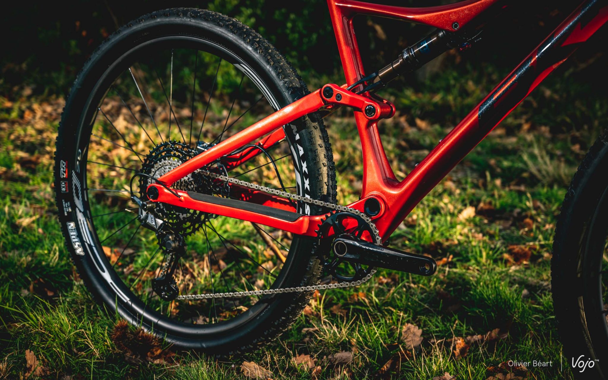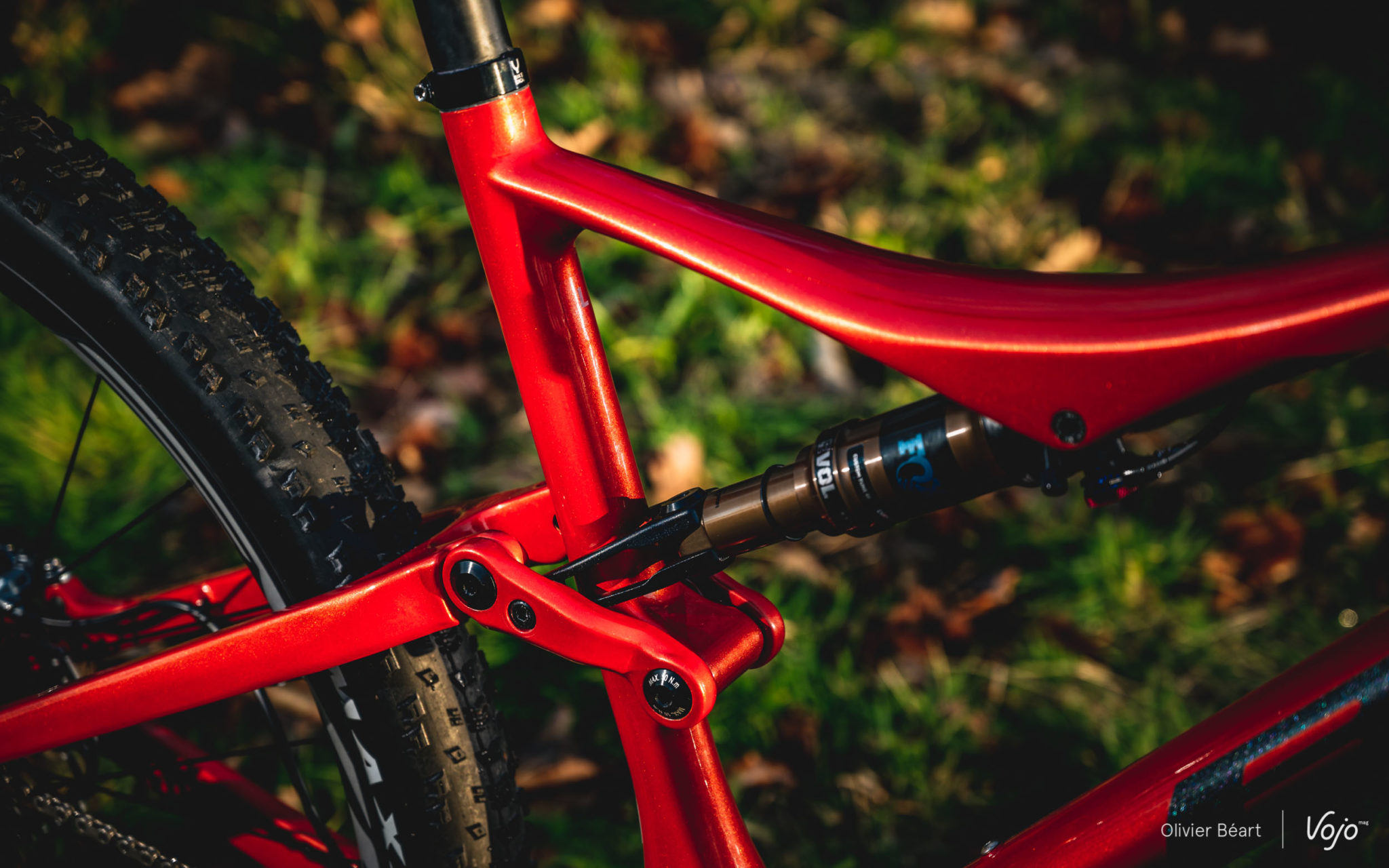 Mais le vrai changement, c’est surtout qu’on peut désormais choisir entre deux débattements de 100 et 120mm. Comme chez ses principaux concurrents (Specialized Epic/Epic Evo, Cannondale Scalpel/Scalpel SE, Orbea Oiz XC/Oiz TR,…), le changement se fait au niveau de la course du piston sur l’amortisseur, mais sans changement de la longueur de ce dernier, de sorte qu’il n’y a pas de modification de la géométrie ou de la cinématique de suspension. Moyennant un passage de l’amortisseur à l’atelier, il est même possible de changer le débattement a posteriori si on le souhaite. De quoi avoir deux vélos en un !