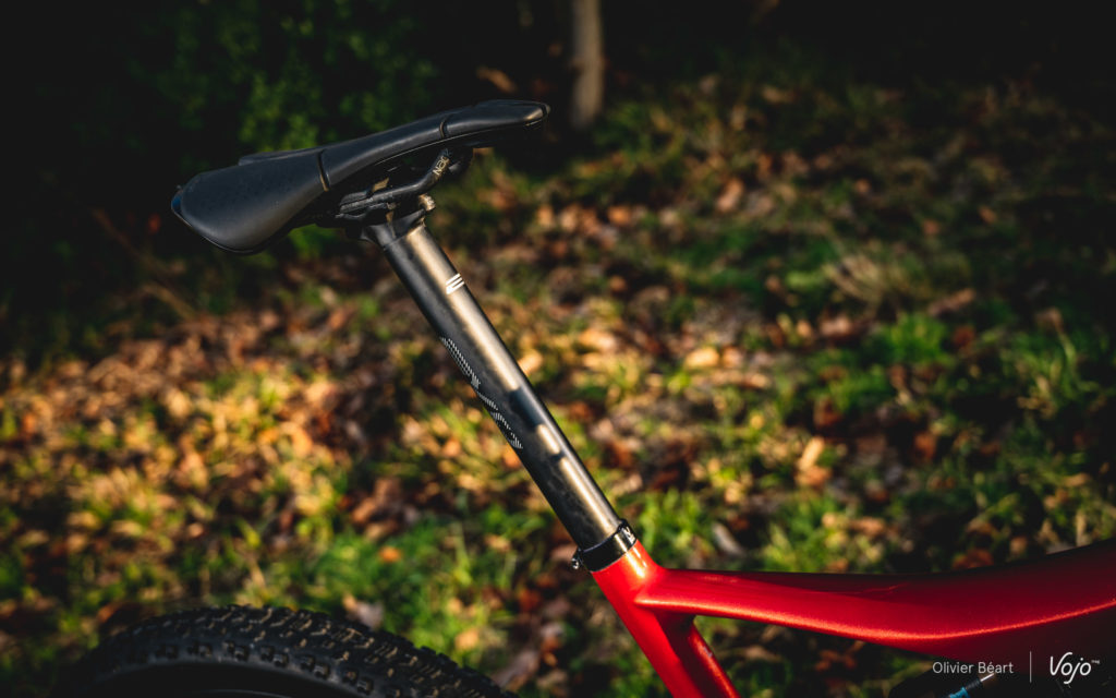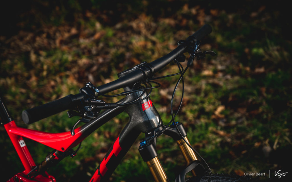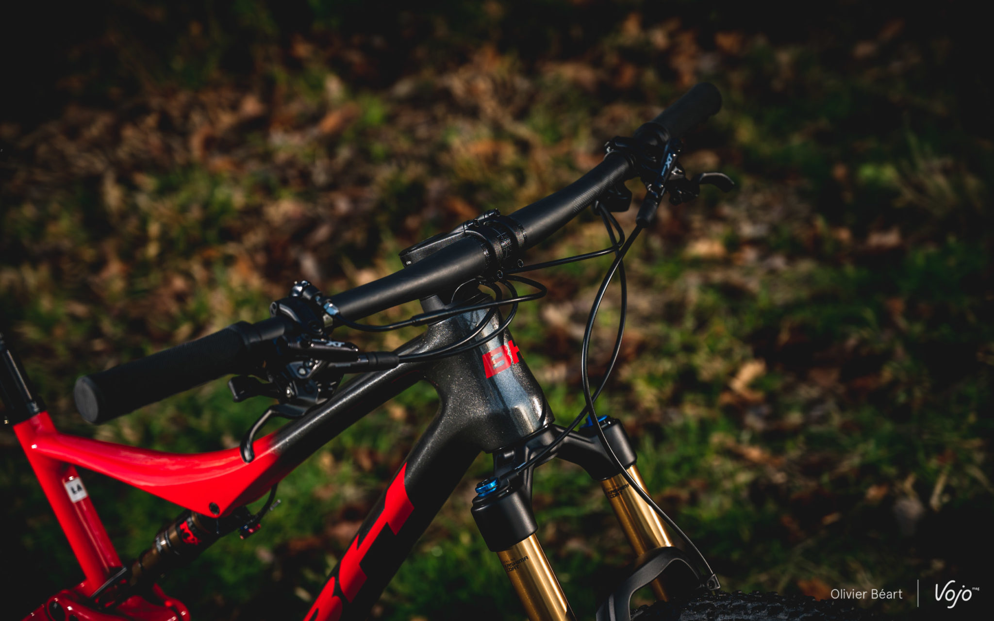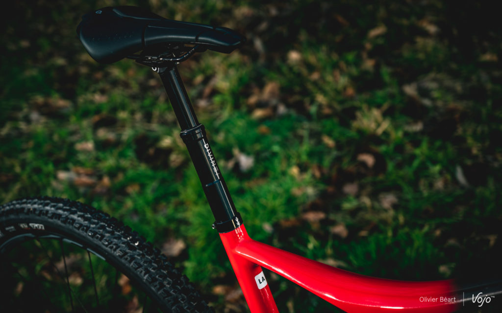 Enfin, on termine par les périphériques. Au niveau du poste de pilotage, outre la très belle potence spécifique dont nous avons déjà parlé, on trouve un cintre en carbone « Evo », la marque d’accessoires maison, de fort belle facture. La tige de selle rigide en carbone est aussi siglée Evo sur le modèle XC, alors qu’on trouve une excellente tige de selle télescopique BikeYoke Divine SL sur le modèle LT. Elle est aussi disponible en option sur les montages XC et nous vous la recommandons franchement ! Très légère (à moins de 400g, c’est tout simplement la plus légère du marché), elle offre 80mm de débattement et un fonctionnement parfait. Elle permet de vraiment exploiter le potentiel du vélo en descente (voir ici notre test complet).