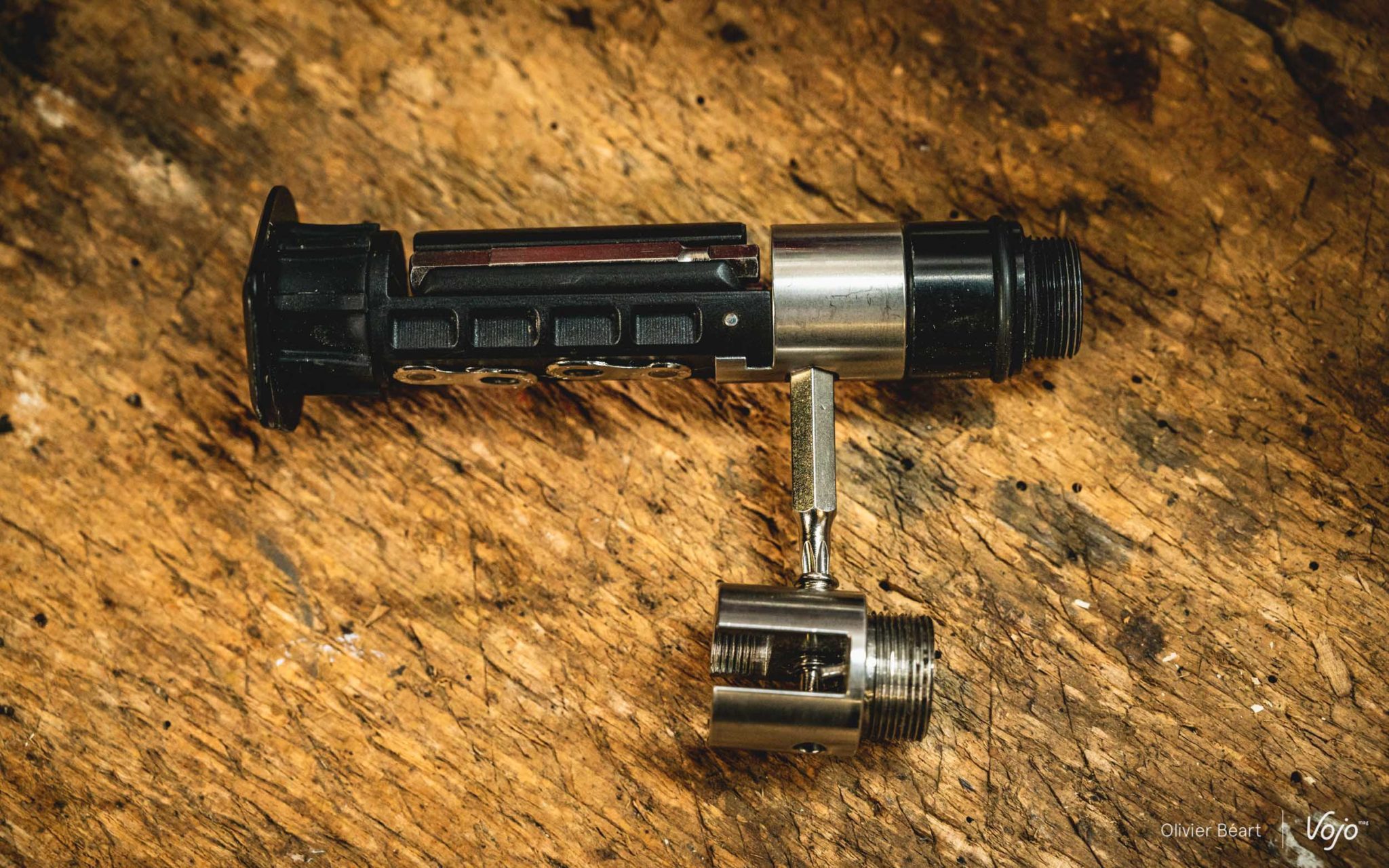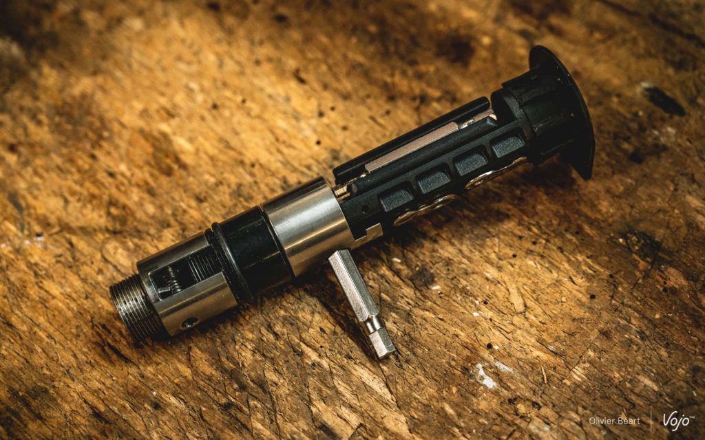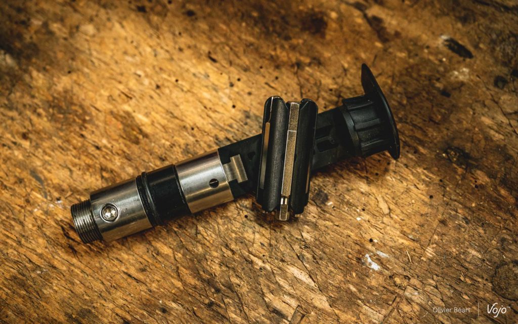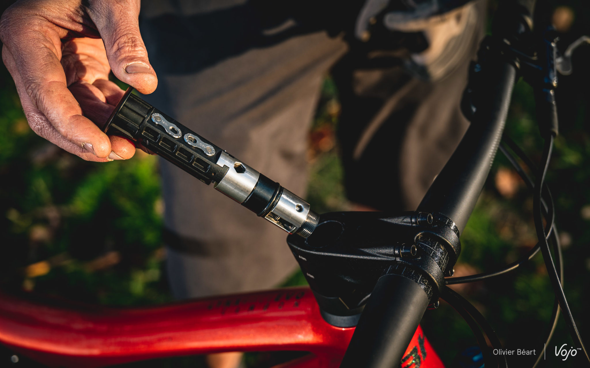 Il s’en passe des choses au niveau de la direction, puisque BH a aussi développé une toute nouvelle potence qui permet de se passer d’étoile pour serrer le jeu de direction. Comment ? La potence intègre en fait deux colliers coniques (un fixe et un mobile) dans sa structure, qui enveloppent le pivot. Lorsqu’on serre la potence, on vient en même temps faire pression sur le jeu de direction et ainsi supprimer le jeu. Grâce à cela, on peut désormais profiter de l’espace libre dans le tube de direction pour y loger très facilement un multi-outils.