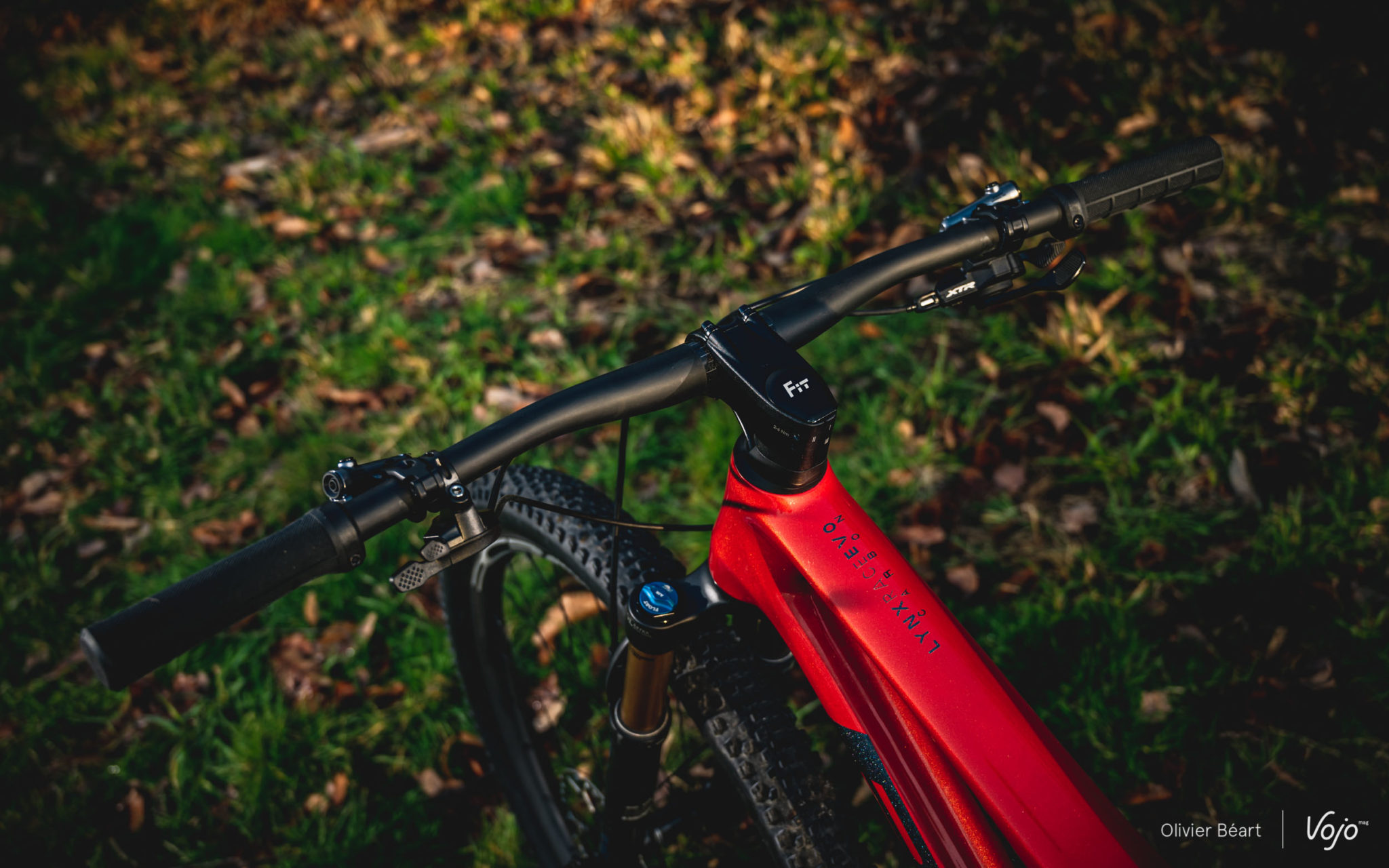Dans les deux cas, c’est Fox qui s’occupe des suspensions, avec le haut de gamme Factory qui est présent sur tous les montages, sauf le premier Lynx 8.0 qui est en Fox Performance. On en a déjà parlé, on a une fourche Fox 32 SC hyper légère sur le modèle XC en 100mm et la Fox 34 SC plus rigide en 120mm sur le LT. L’amortisseur est identique, sauf pour ce qui est de la course du piston. Ce dont nous n’avons pas encore parlé, c’est de la présence d’un double blocage au cintre, indispensable en XC. Et pour cela, on peut compter sur la manette Fox qui se place sous le cintre, côté gauche.